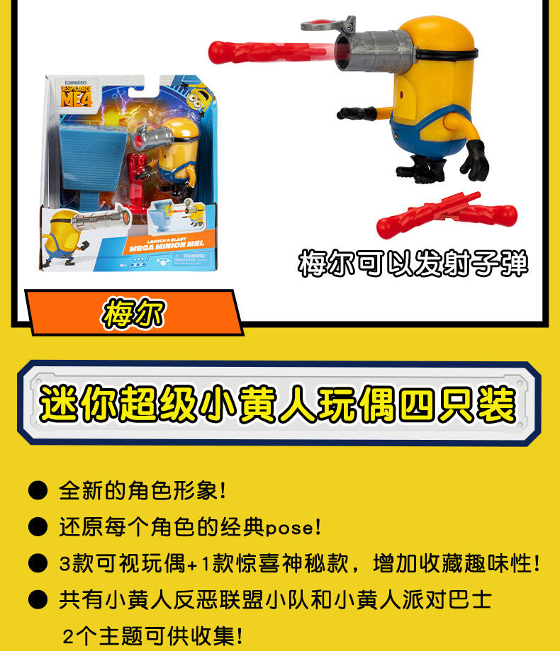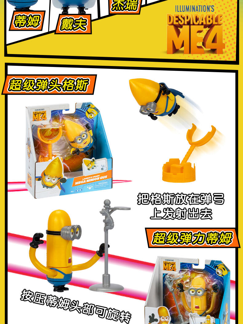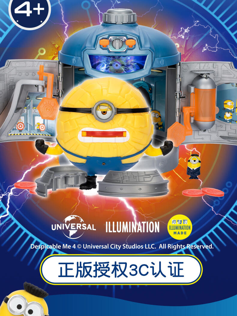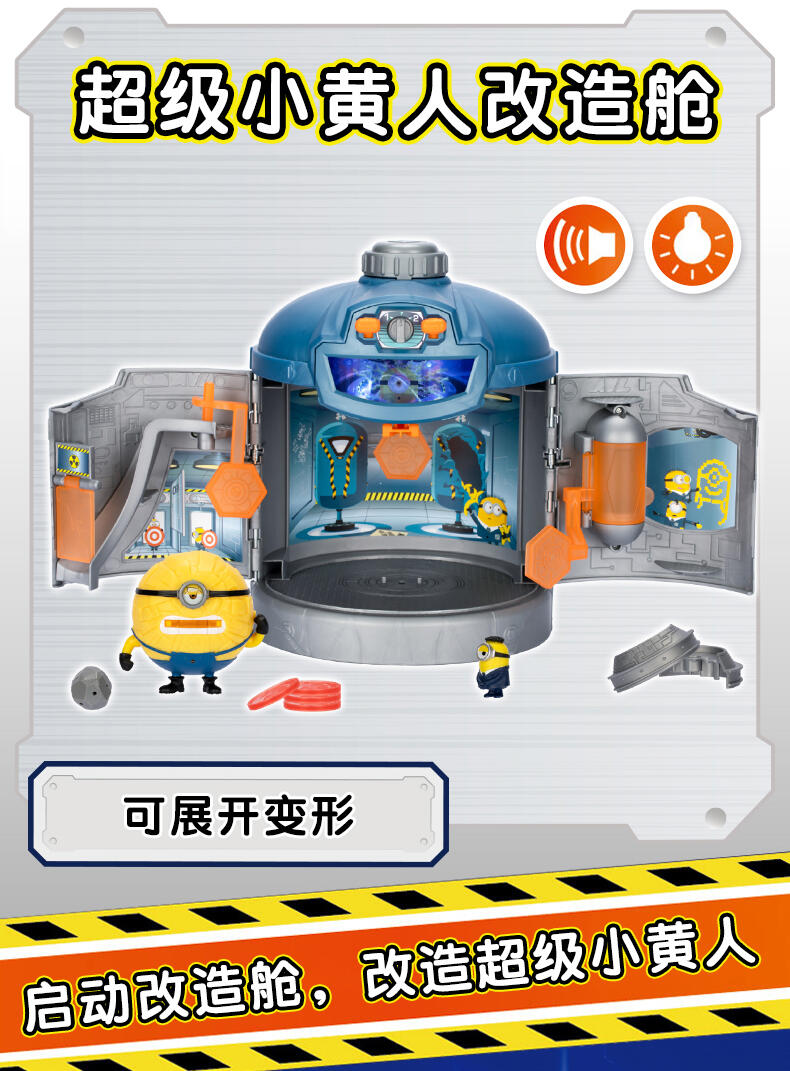 还原电影里的改造情节! 将小黄人与岩石依次放入顶部舱门,启动改造舱,拉下控制杆,打开改造舱就能见到改造完成的超级小黄人! 将飞盘放入超级小黄人嘴里,瞄准目标发射! 将改造舱全部展开后,可以变成AVL训练基地,解锁新的玩法!