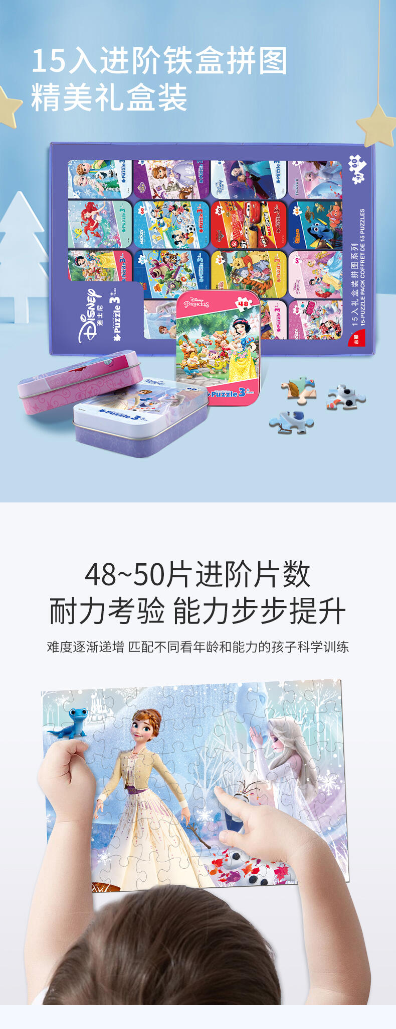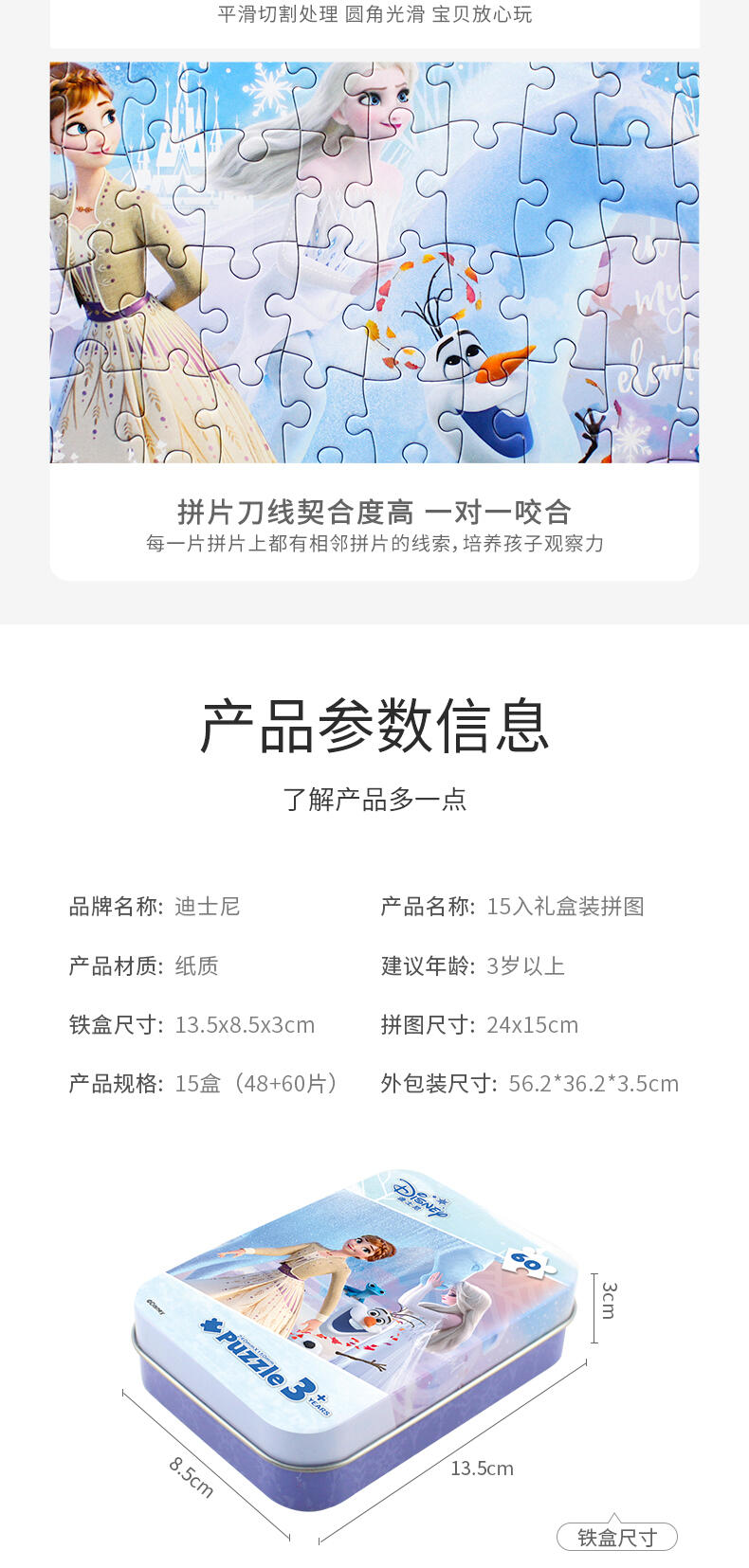 1、迪士尼正版授权,热门IP形象(冰雪奇缘/米奇米妮/小熊维尼/狮子王/迪士尼公主/苏菲亚小公主/疯狂动物城/超能陆战队/星际宝贝/木兰/无敌破坏王等),2优质纸浆,压片紧密,圆润安全,3,单图独立铁盒,方便收纳,4,高清画质,人物逼真,色彩丰富,5、套装组合15款,大气礼盒包装