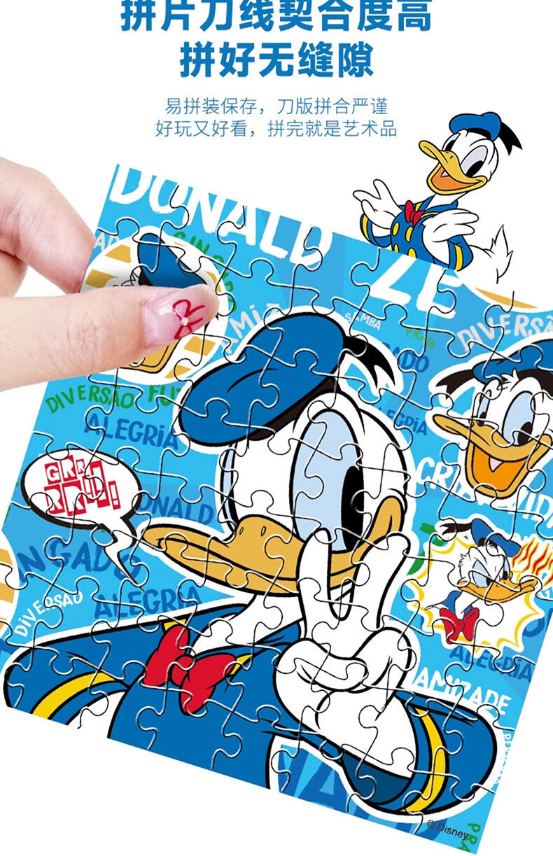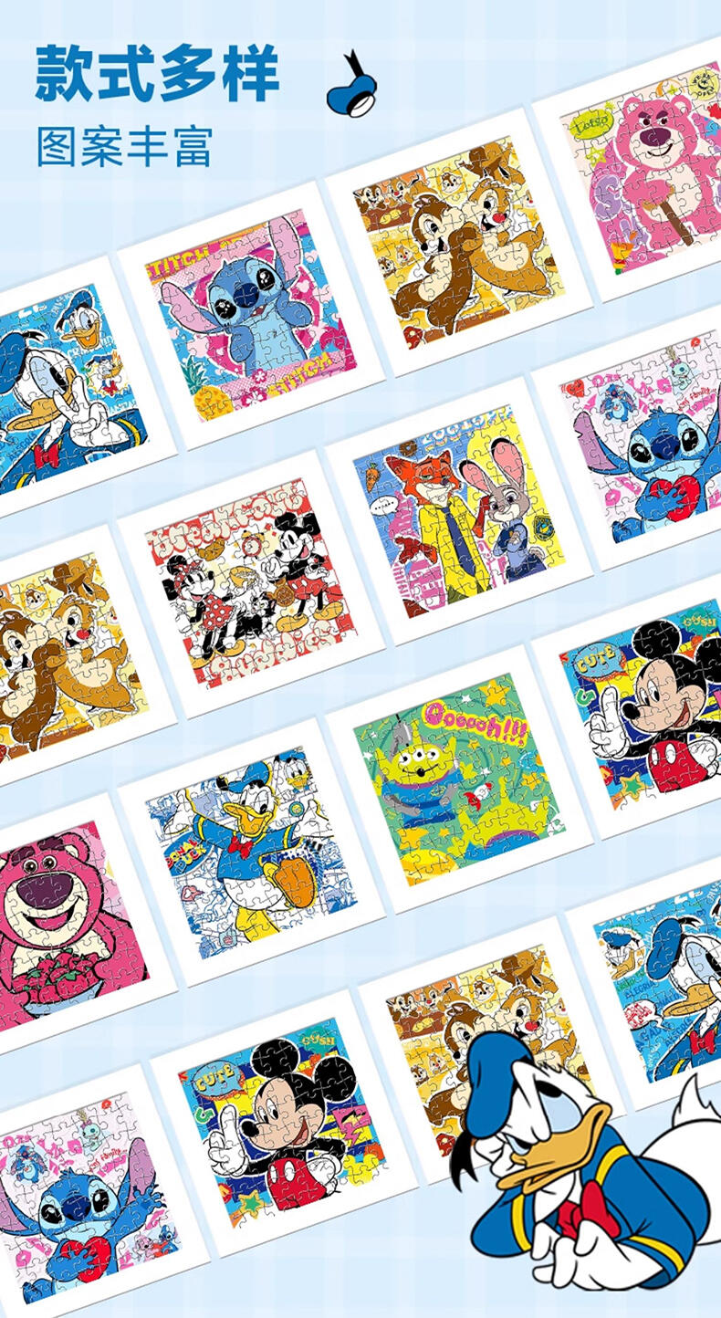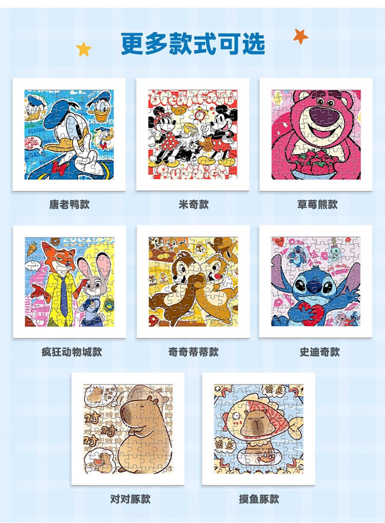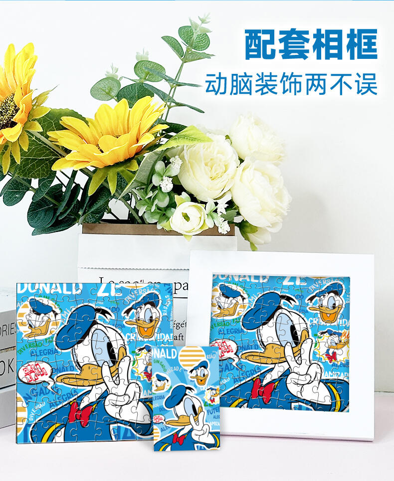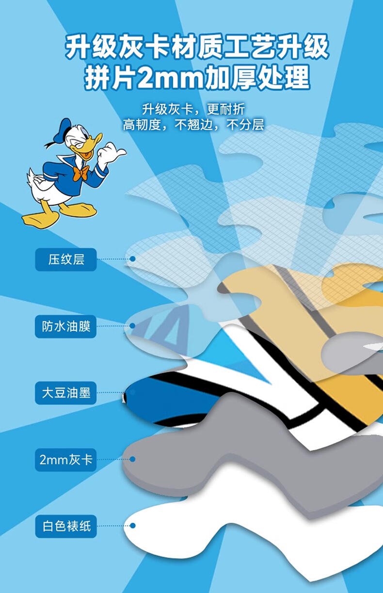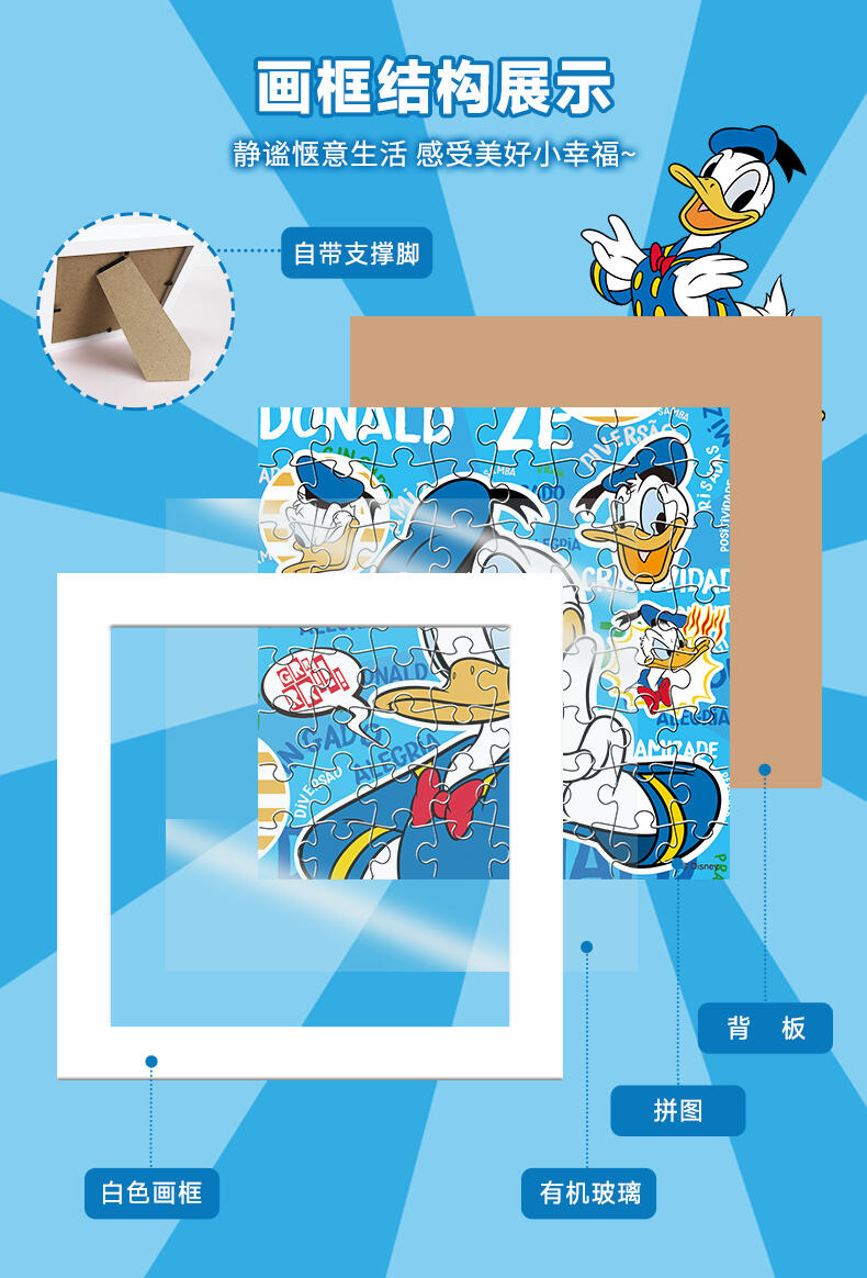 此款产品为自带相框拼图产品,自带相框,装完成后作为装饰摆台易保存陈列,趣味实用双结合,画面设计为迪士尼经典人物IP,可收到更多迪士尼品牌消费者的青睐;产品材质为优质灰卡,拼片光滑无毛刺,手感舒适