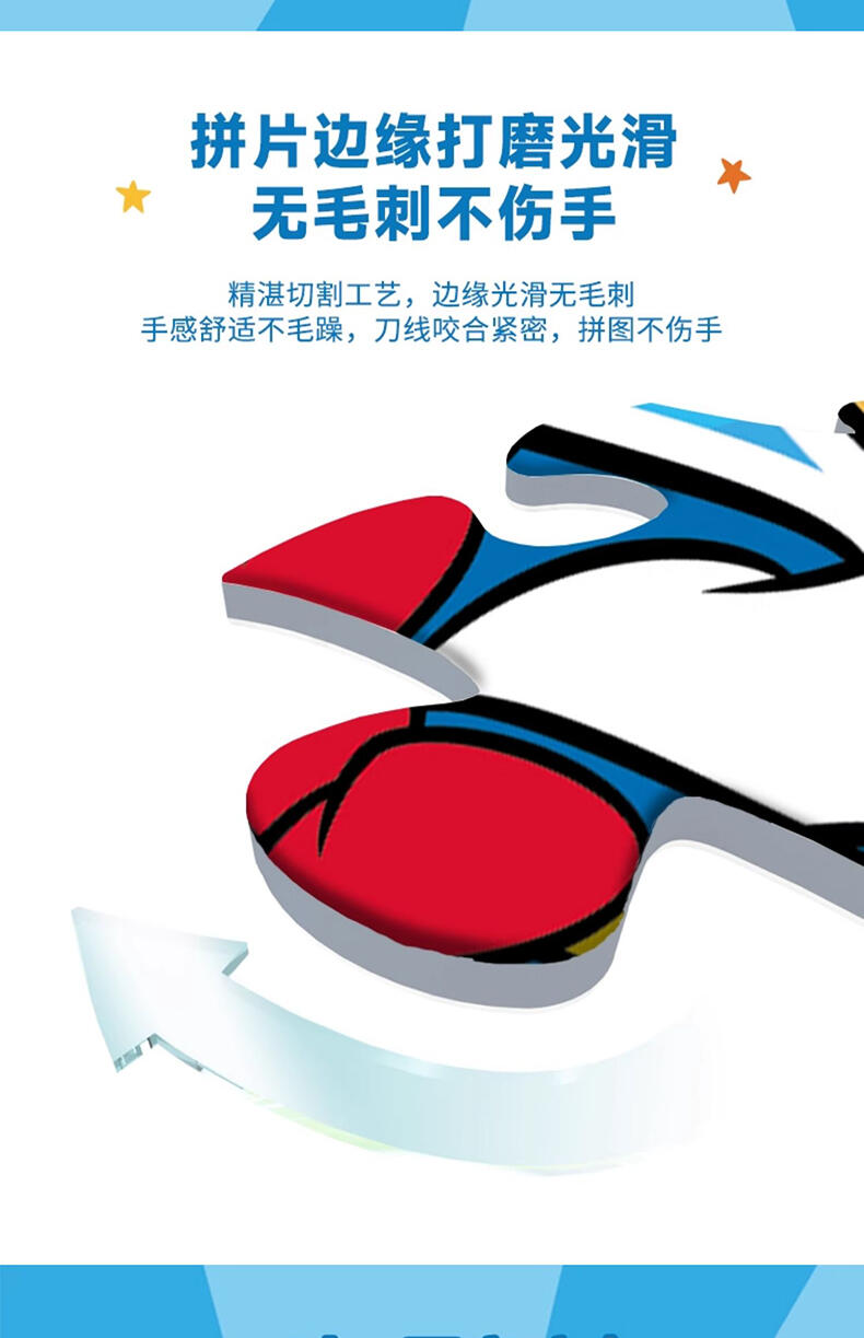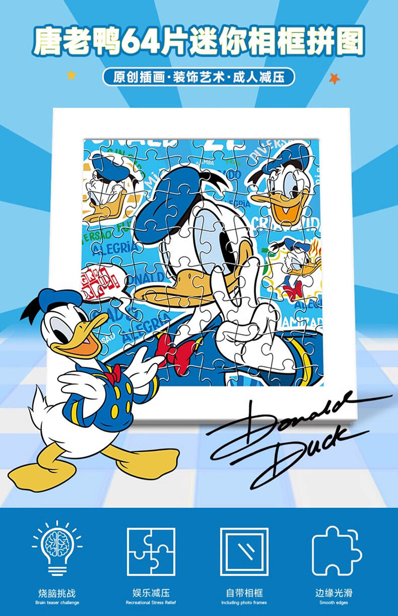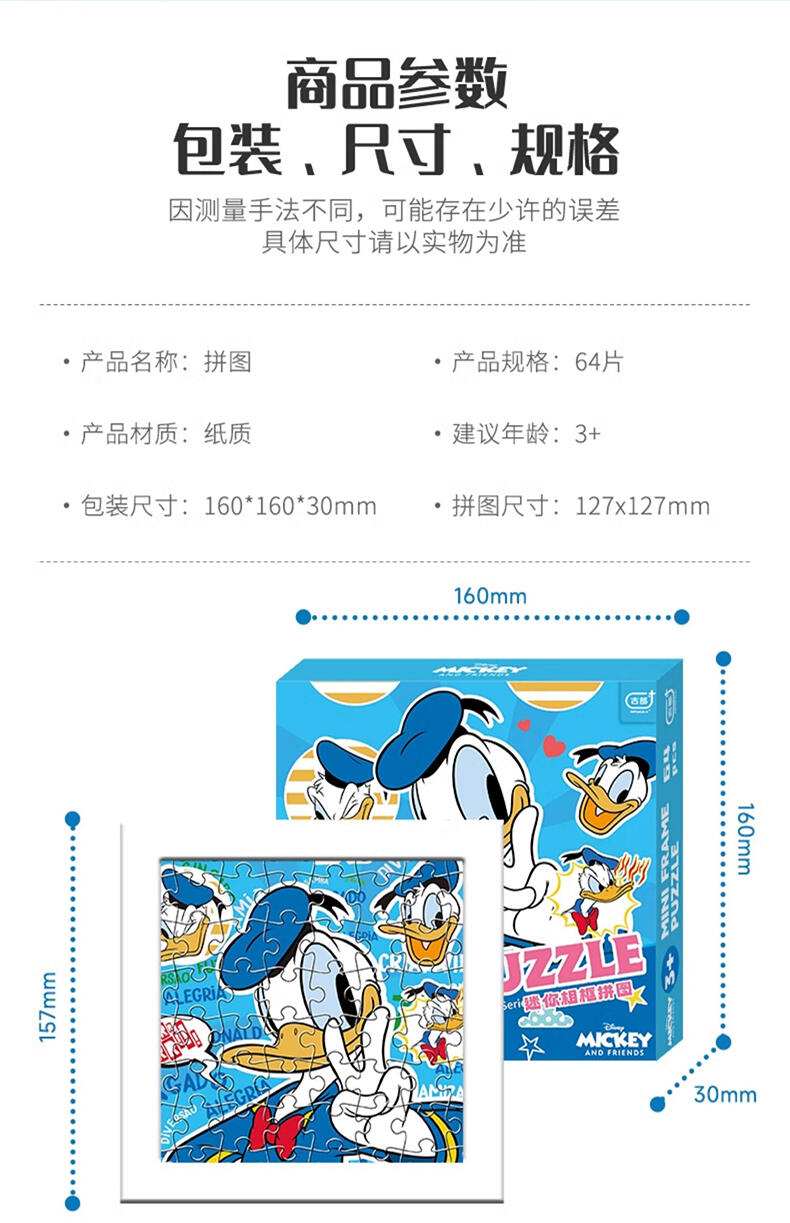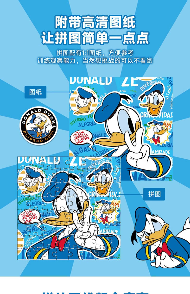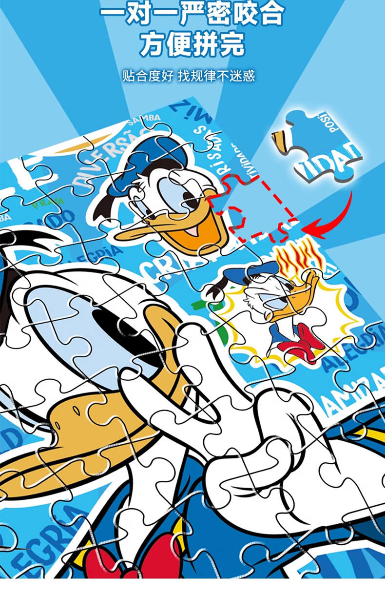 此款产品为自带相框拼图产品,自带相框,装完成后作为装饰摆台易保存陈列,趣味实用双结合,画面设计为迪士尼经典人物IP,可收到更多迪士尼品牌消费者的青睐;产品材质为优质灰卡,拼片光滑无毛刺,手感舒适