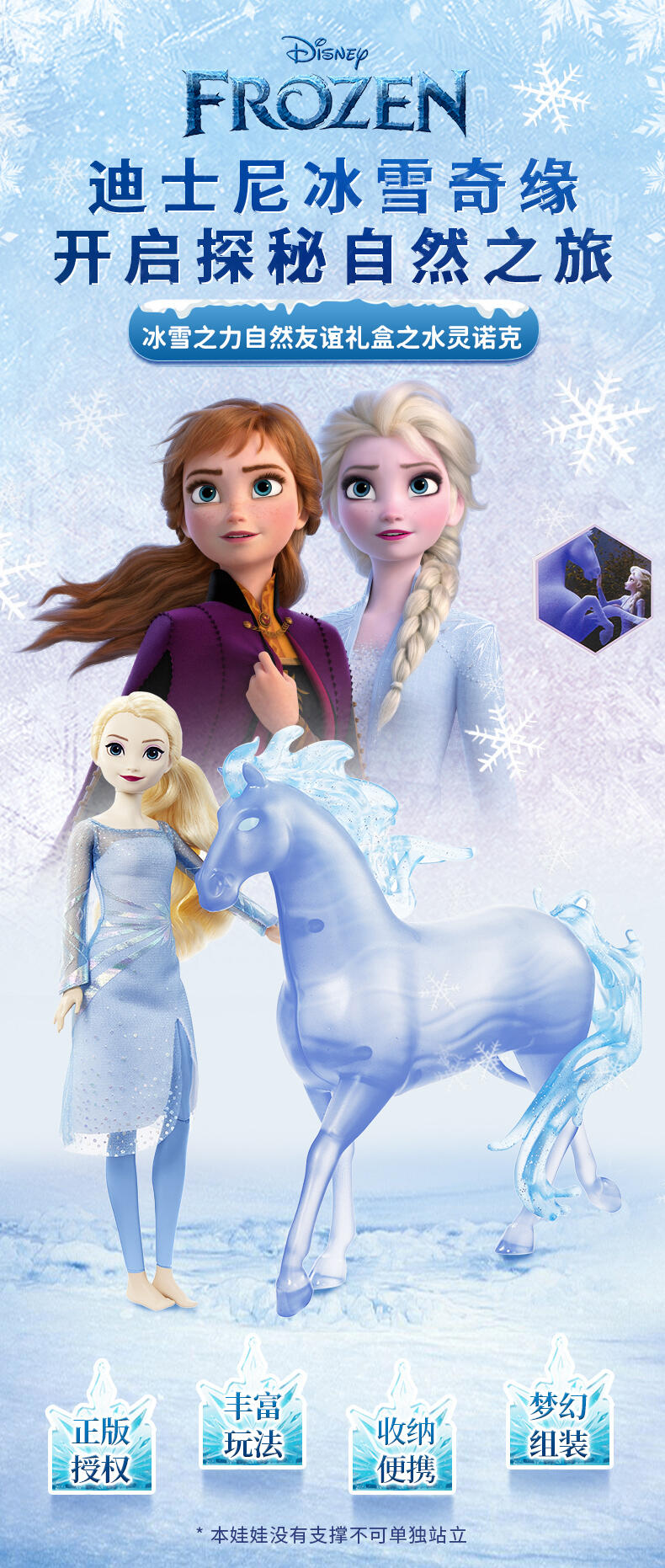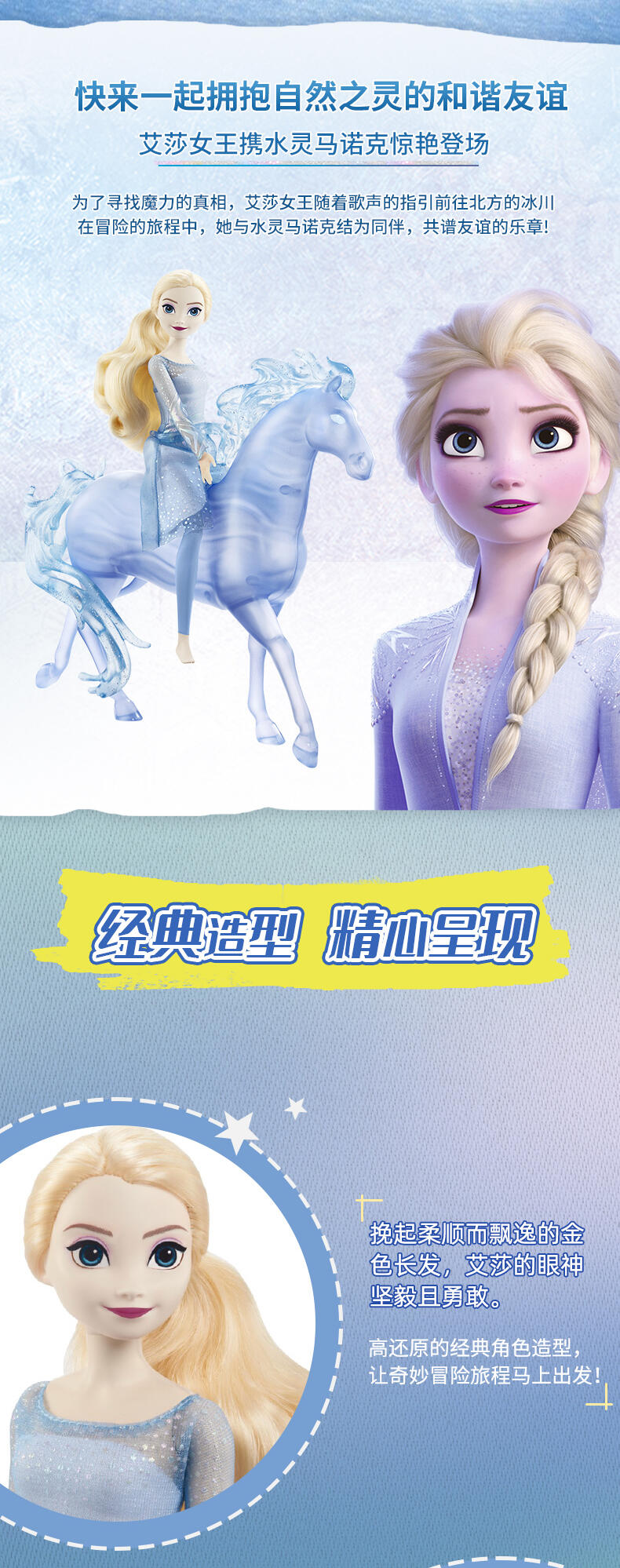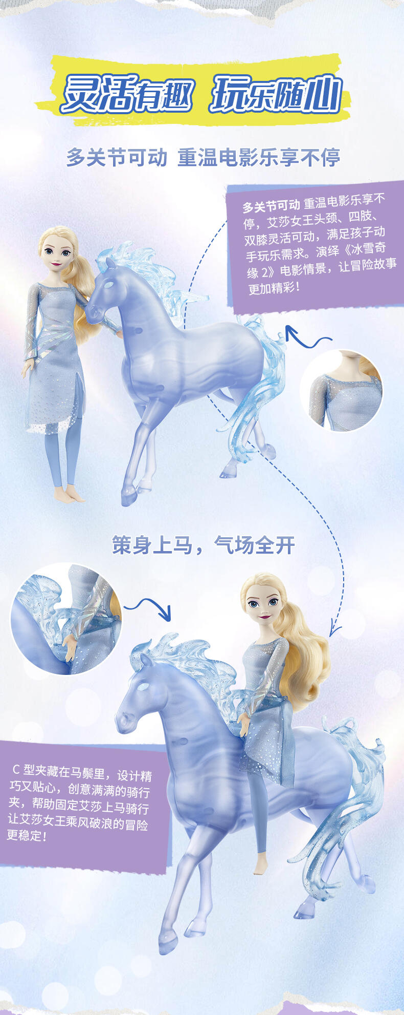 包含冰雪奇缘2的主角艾莎和水灵马诺克,艾莎身着烫金印花软质连衣裙,可供骑马造型的膝关节设计 (头颈, 四肢, 双膝可动),水灵马诺克带有闪亮珠光质感的制工细节,藏在马鬃内的C型夹便于骑乘