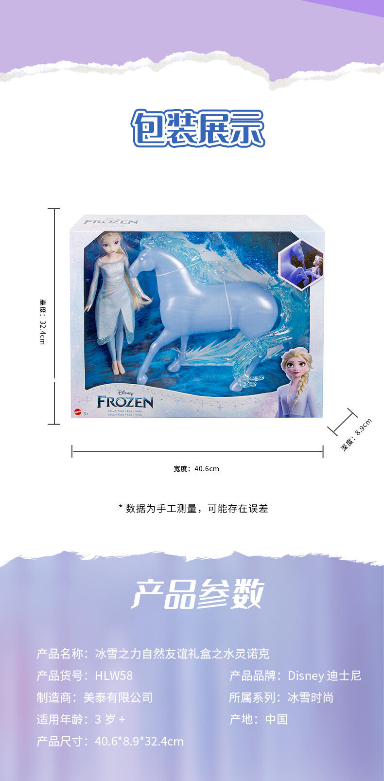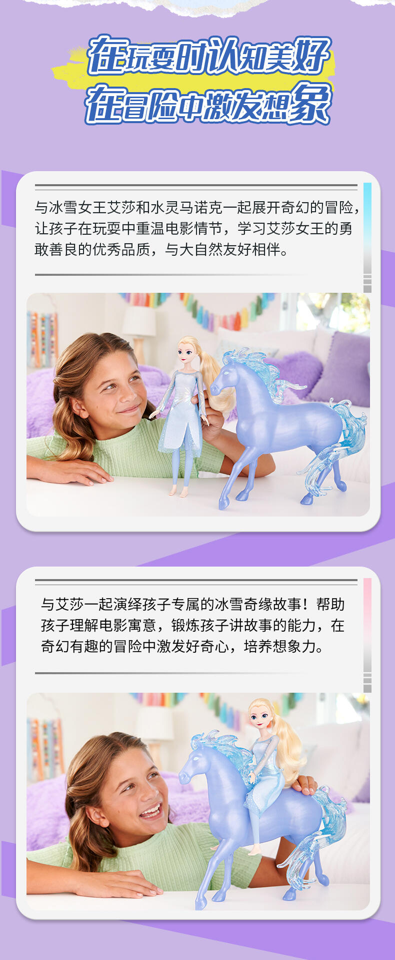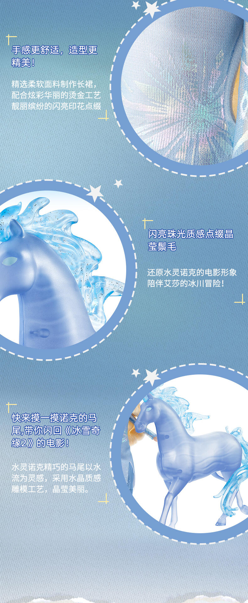 包含冰雪奇缘2的主角艾莎和水灵马诺克,艾莎身着烫金印花软质连衣裙,可供骑马造型的膝关节设计 (头颈, 四肢, 双膝可动),水灵马诺克带有闪亮珠光质感的制工细节,藏在马鬃内的C型夹便于骑乘