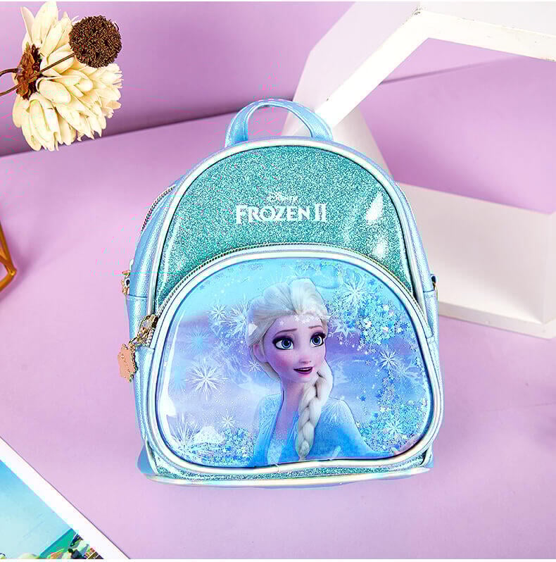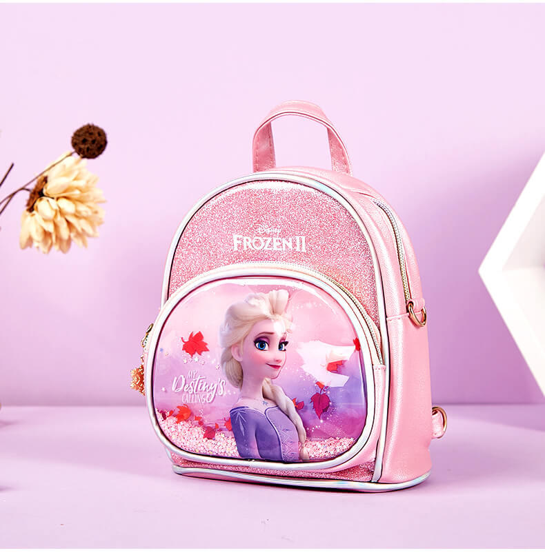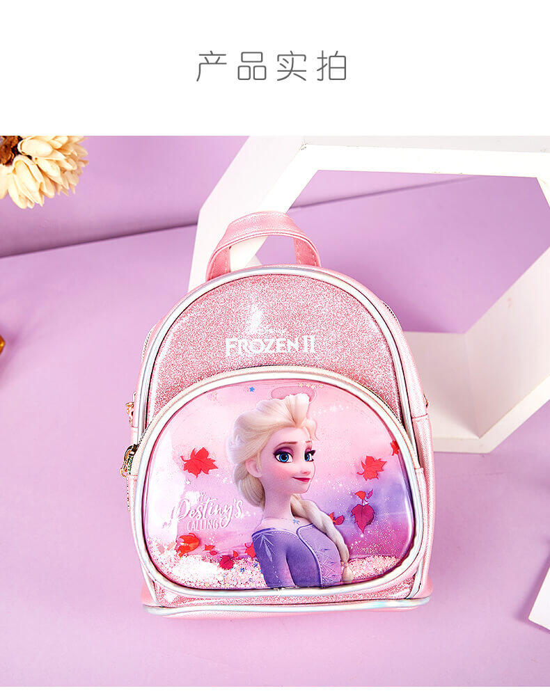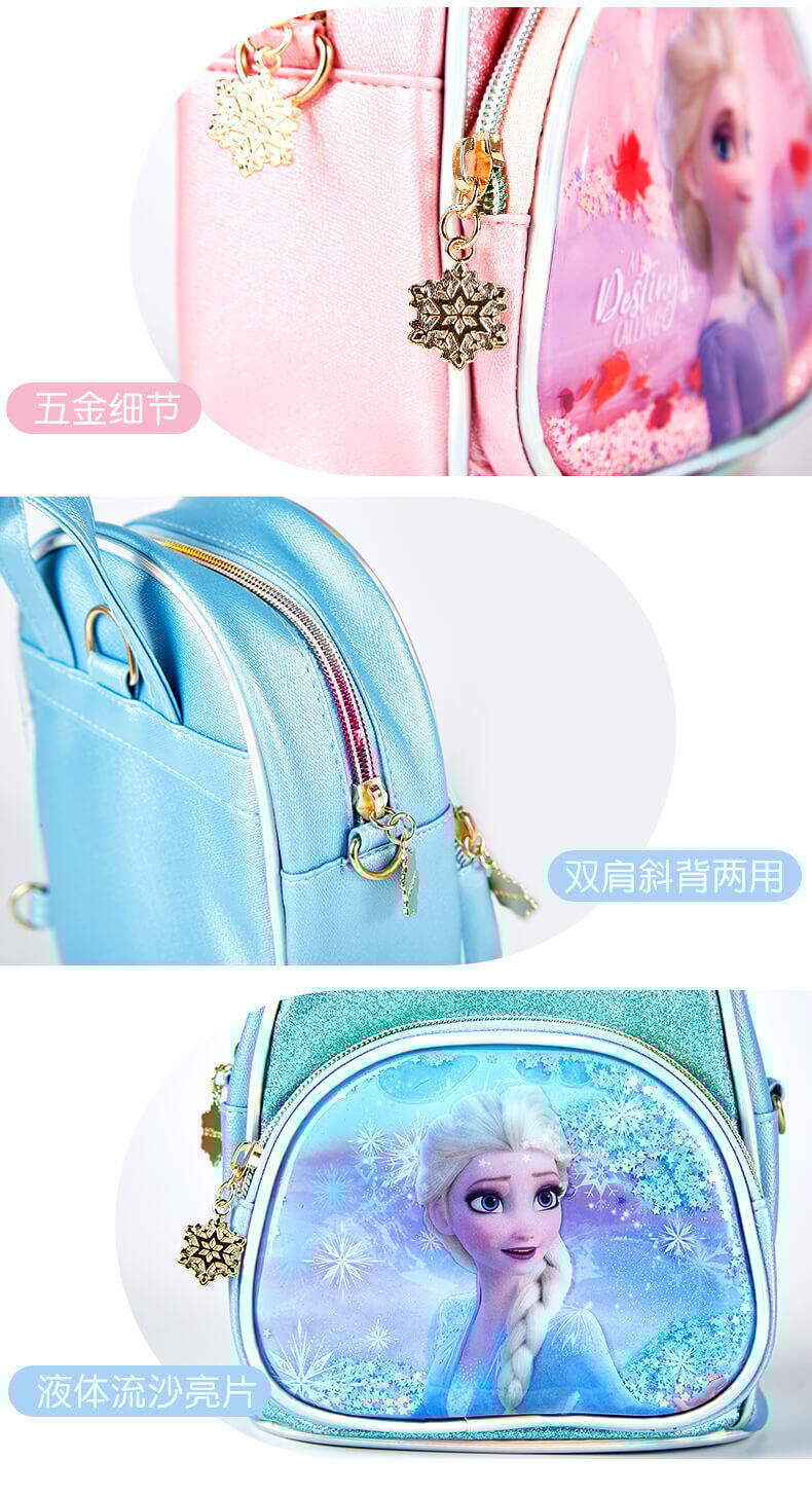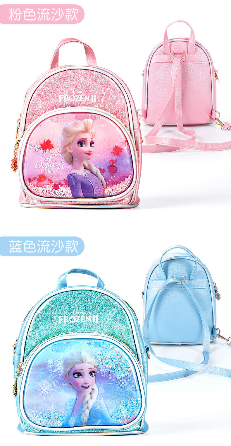 冰雪奇缘2双肩包,包身正面艾莎公主图案,加液体流沙装饰,宝贝们背在身上走动时,流沙会随之晃动,逛街吸睛好物;