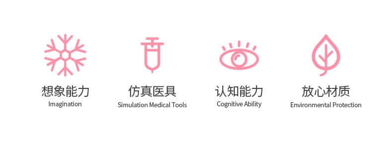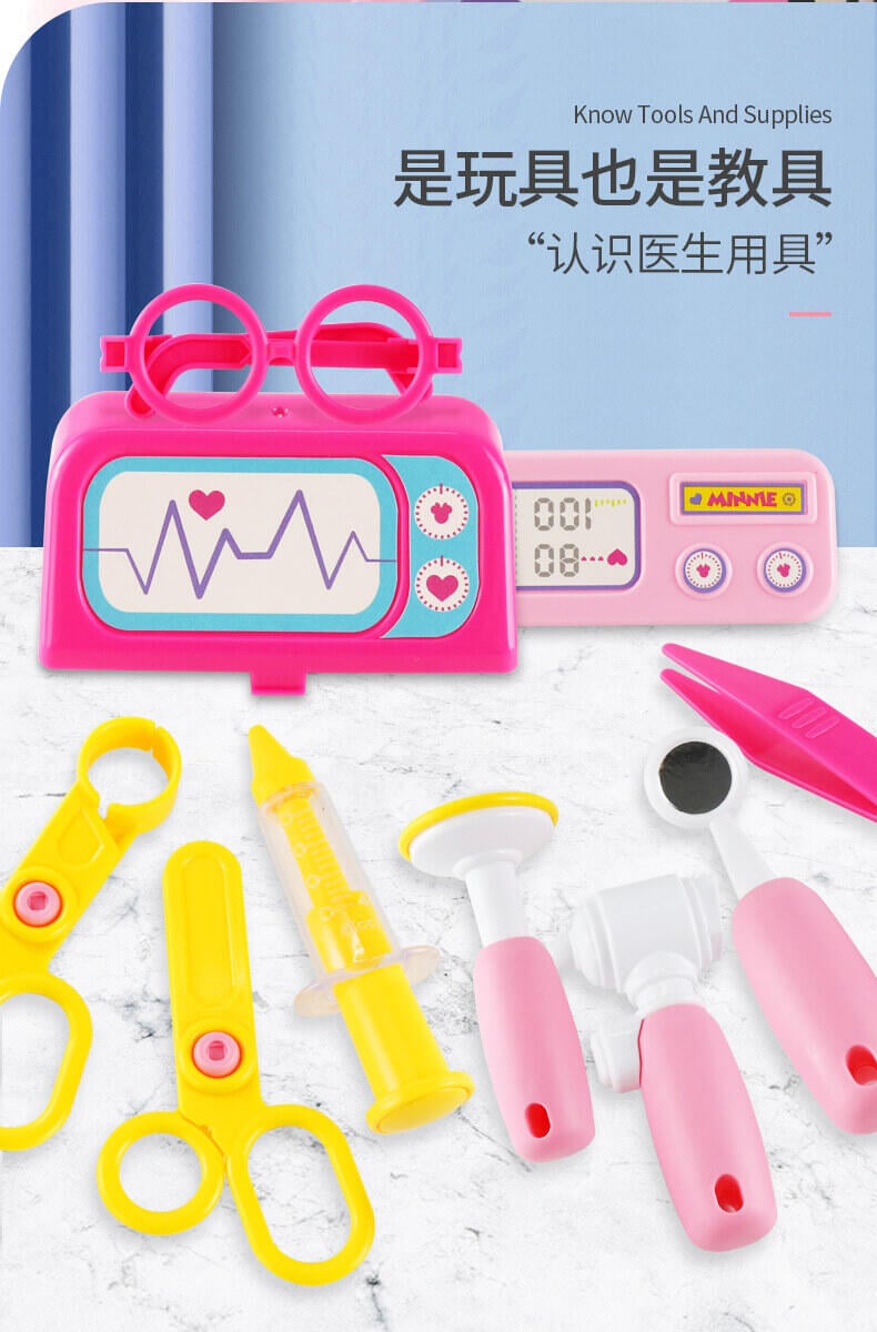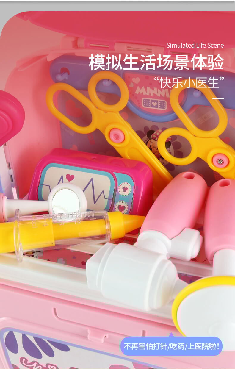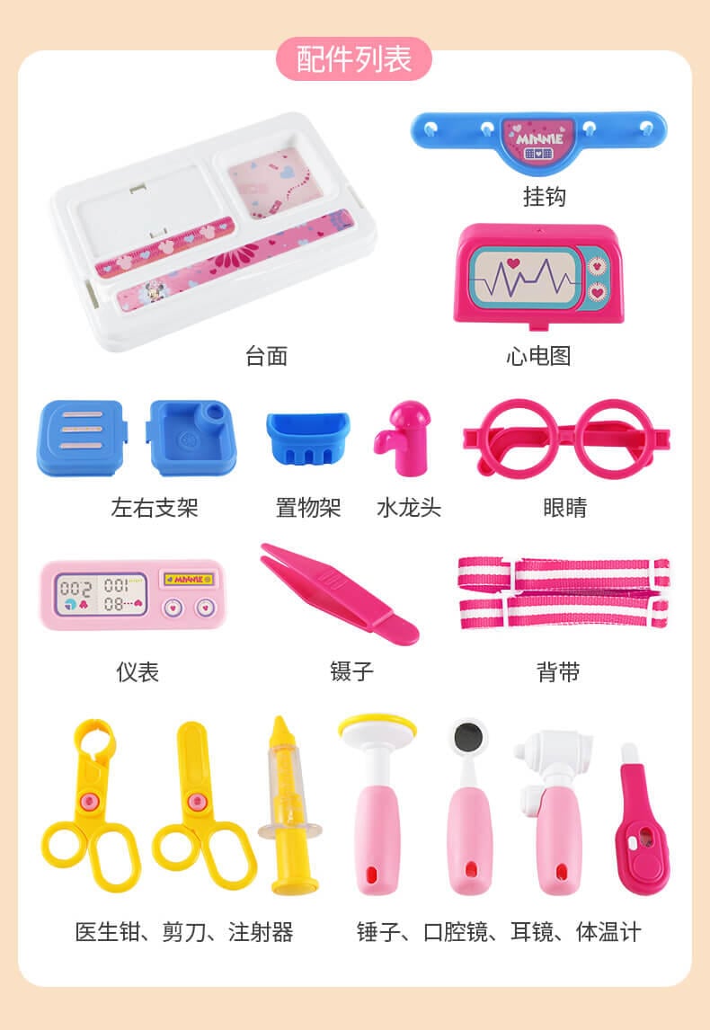 内容丰富,含有听诊器,手术剪,血压计,镊子,注射器等玩具。