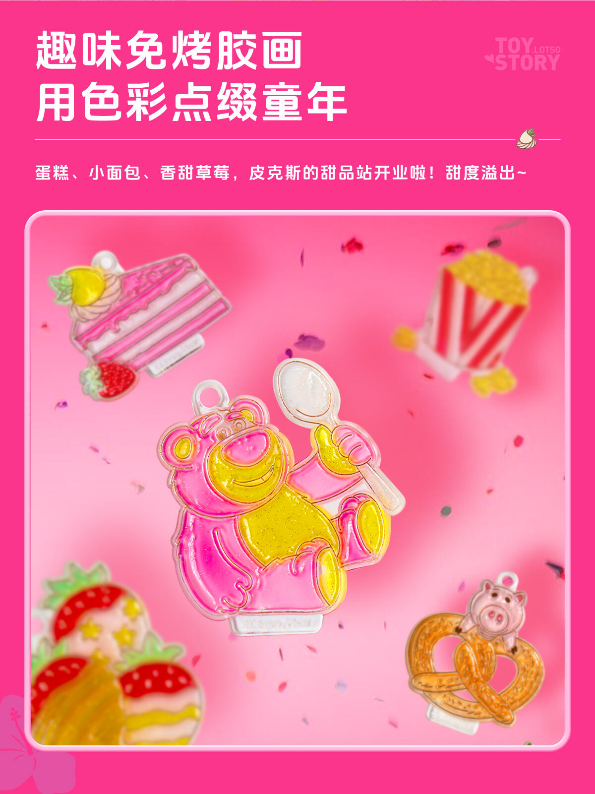 皮克斯甜品主题; 可完成100件DIY成品; 孩子根据配套的材料和工具DIY蛋糕玩具和贺卡、免烤胶画片、纸牌玩具、咕卡和亚克力挂件; 展开式礼盒,可以用于陈列DIY成品