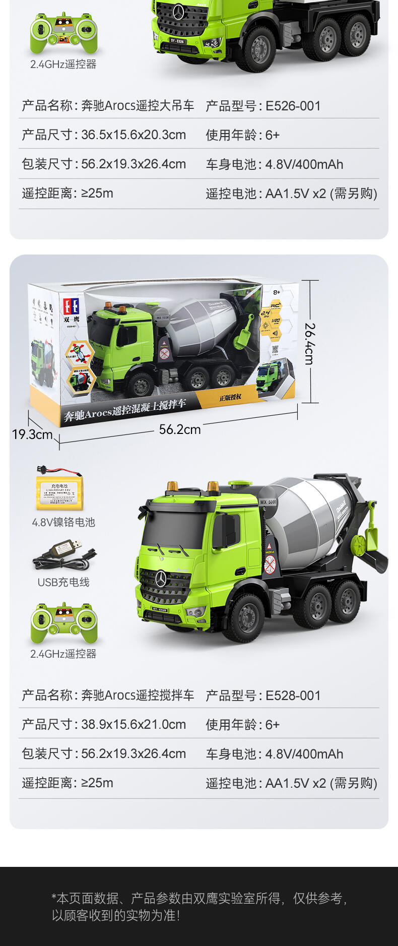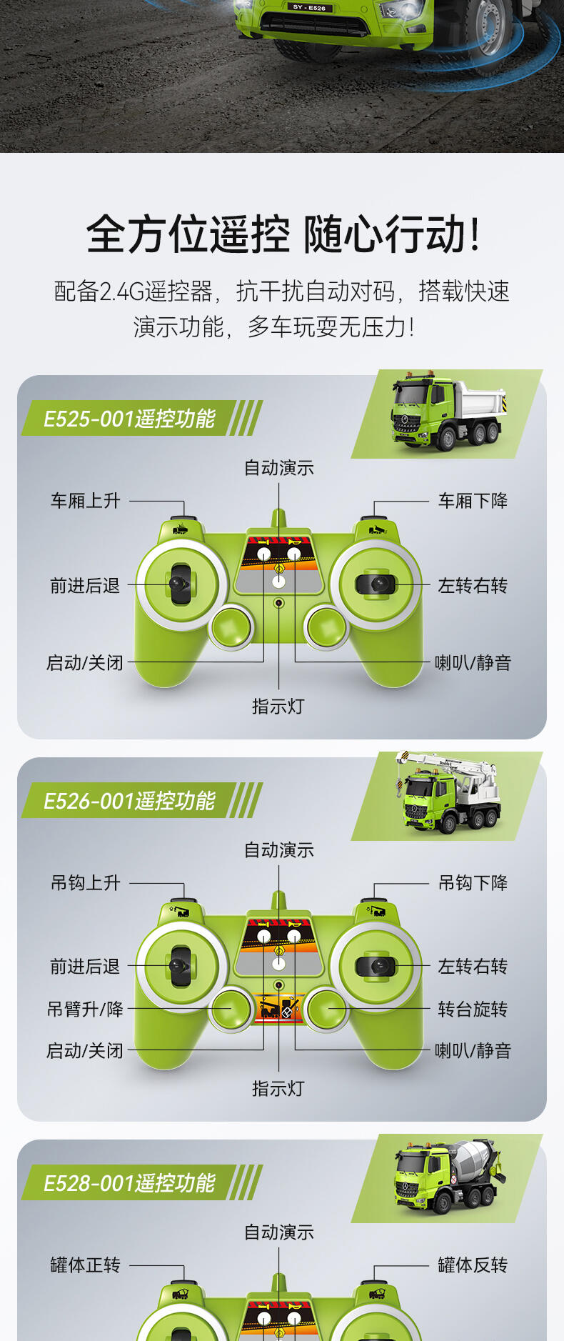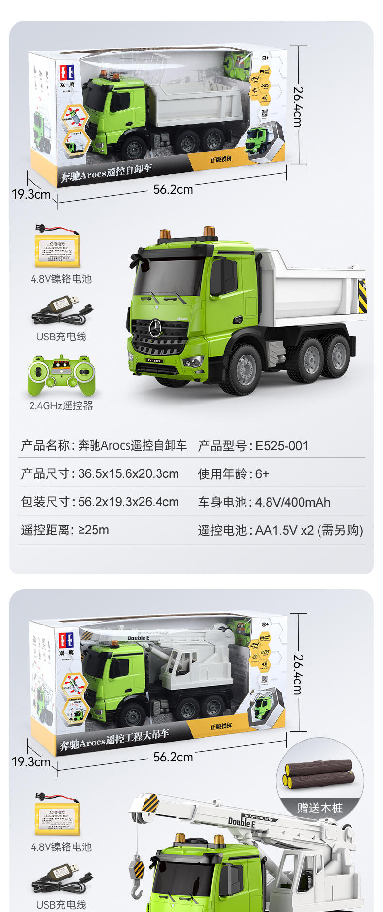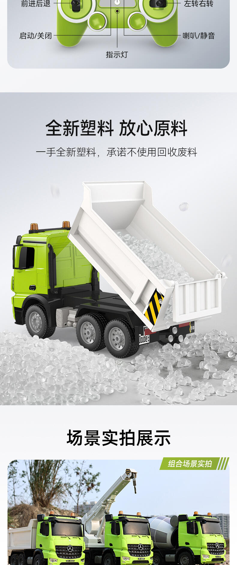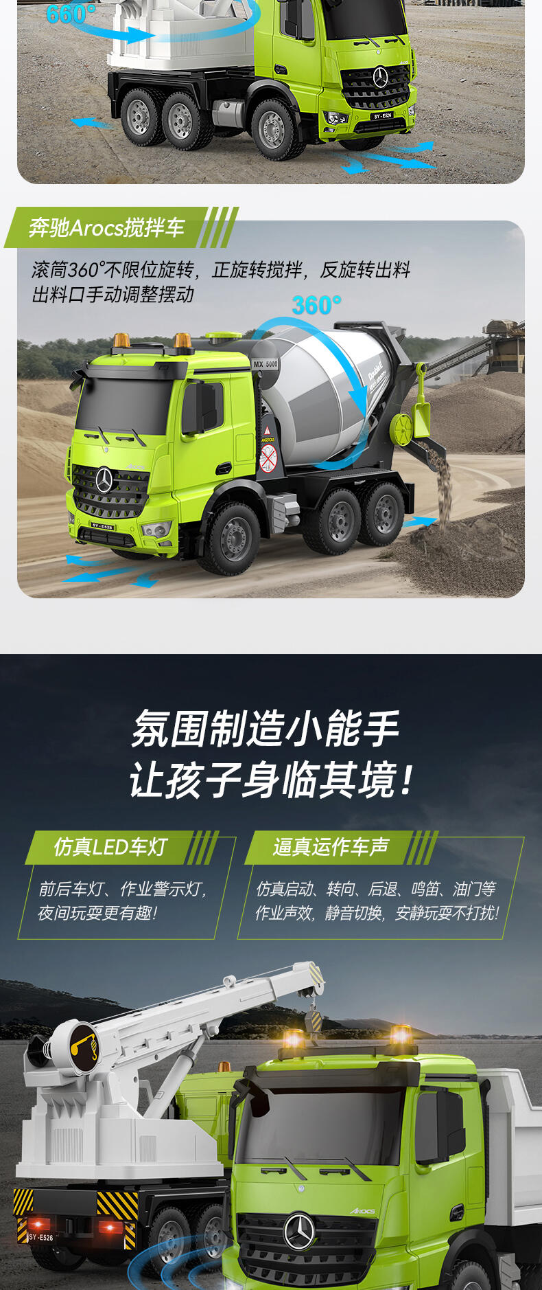 1、奔驰Arocs正版授权; 2、全方位仿真遥控,前进/后退、左转/右转; 3、遥控吊臂升降/伸缩、遥控吊钩升降; 4、遥控操作台660°左右旋转; 5、一键启动、演示功能; 6、仿真车声:启动声、加速声、转向声、后退声、喇叭声、作业声、静音切换; 7、仿真LED前后车灯和作业警示灯,支持夜间玩耍; 8、2.4GHz抗干扰自动对码,可多车竞技玩耍。