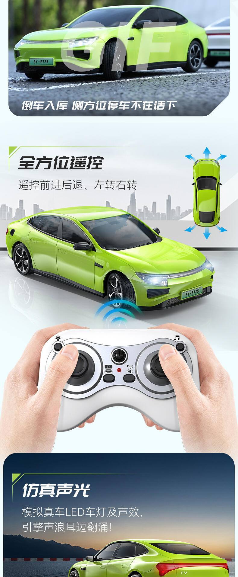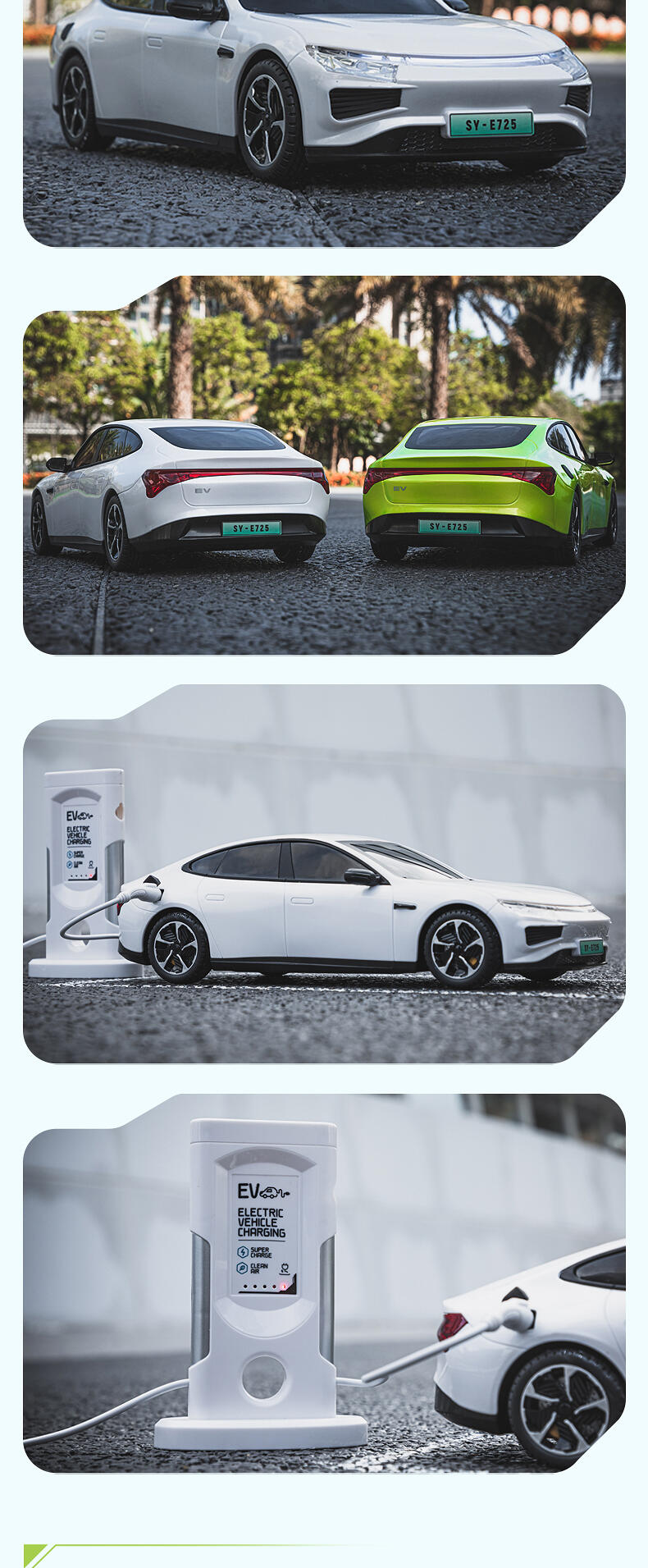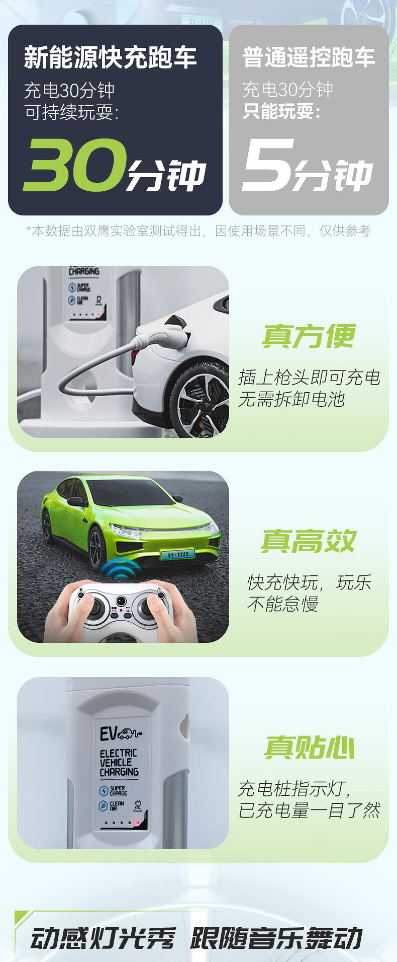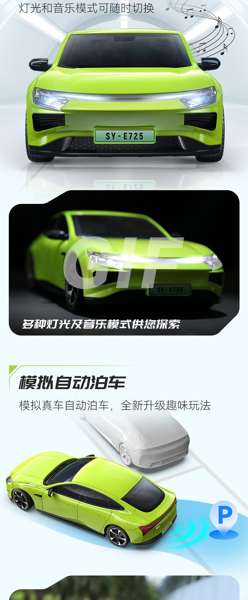 1、仿真新能源跑车外观与功能,搭配充电桩,时尚大方; 2、快速充电,充电30分钟,玩耍≥30分钟; 3、炫酷灯光秀,搭配节奏音乐,动感逼真;灯光和音乐模式可独立随心切换;; 4、自动泊车功能,高度仿真,体验感强; 5、全方位仿真遥控,前进/后退,左转/右转; 6、仿真声光; 7、2.4GHz抗干扰自动对码,可多车竞技玩耍。