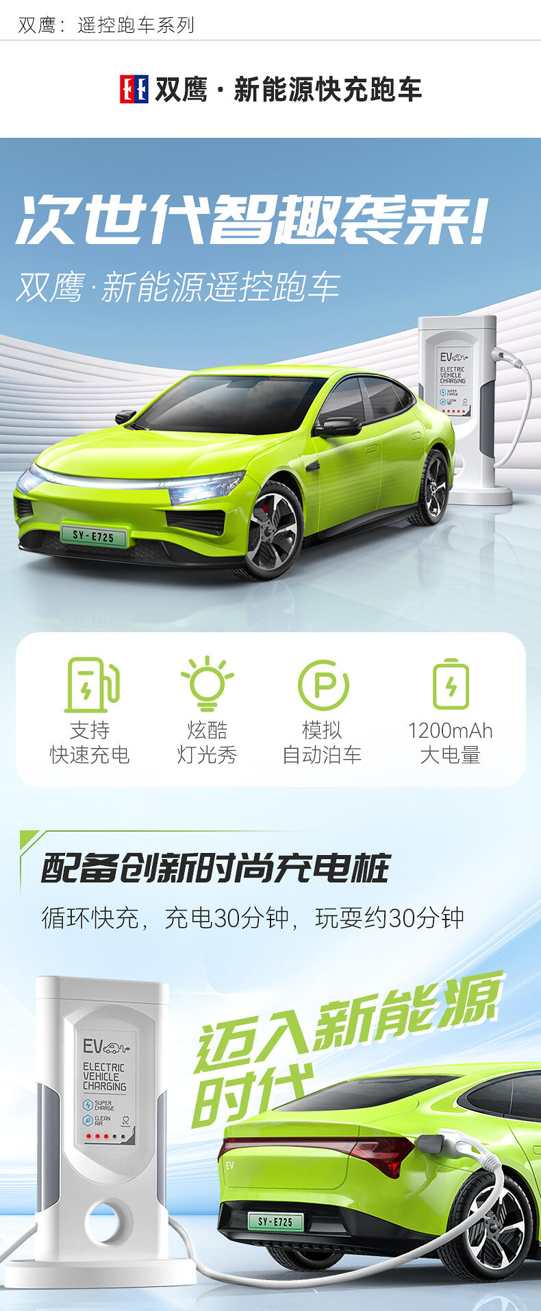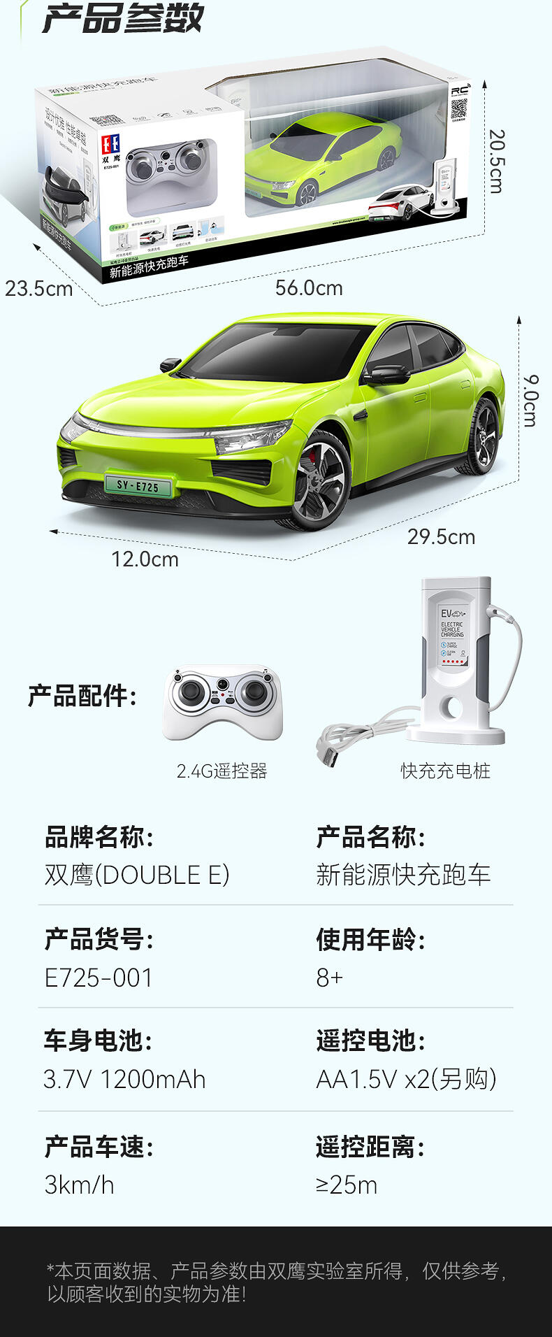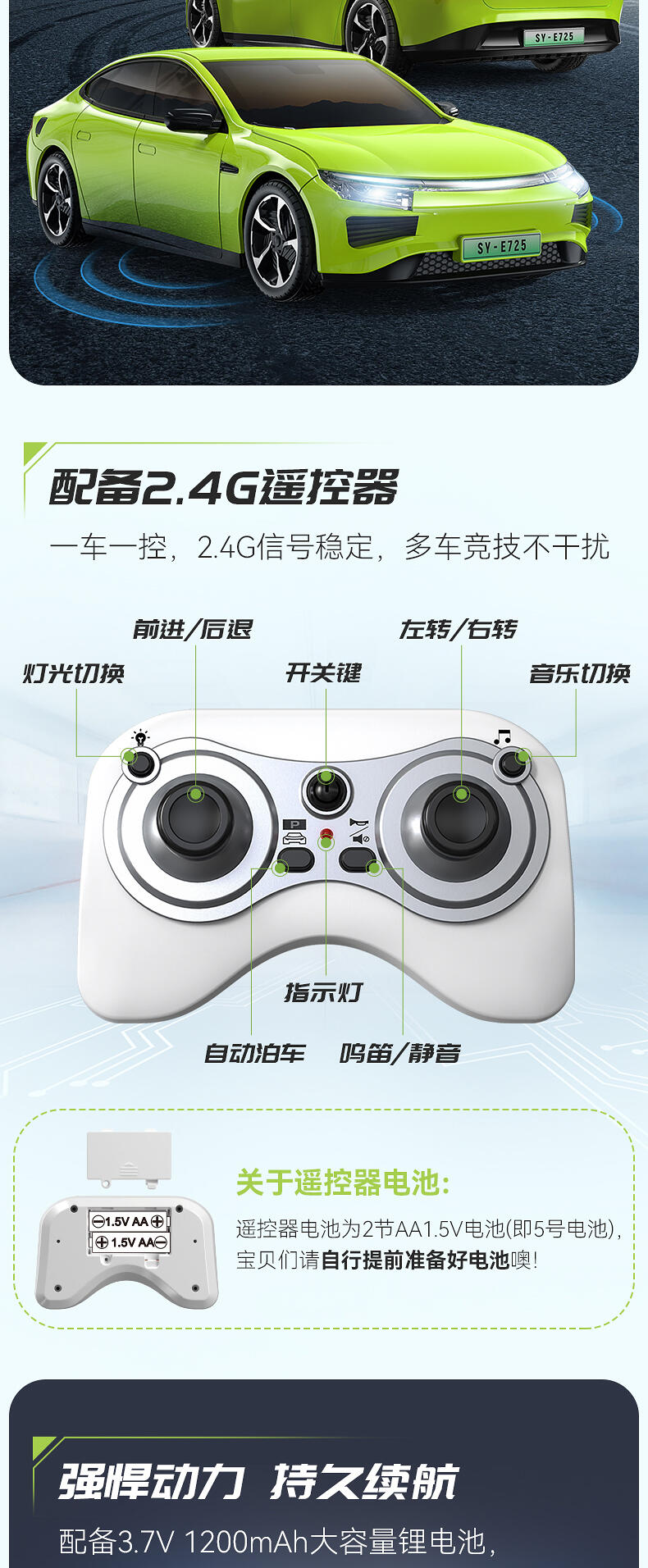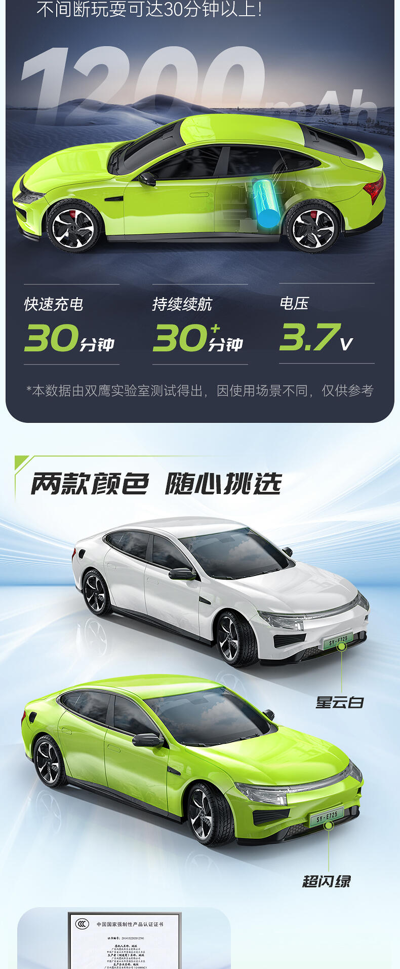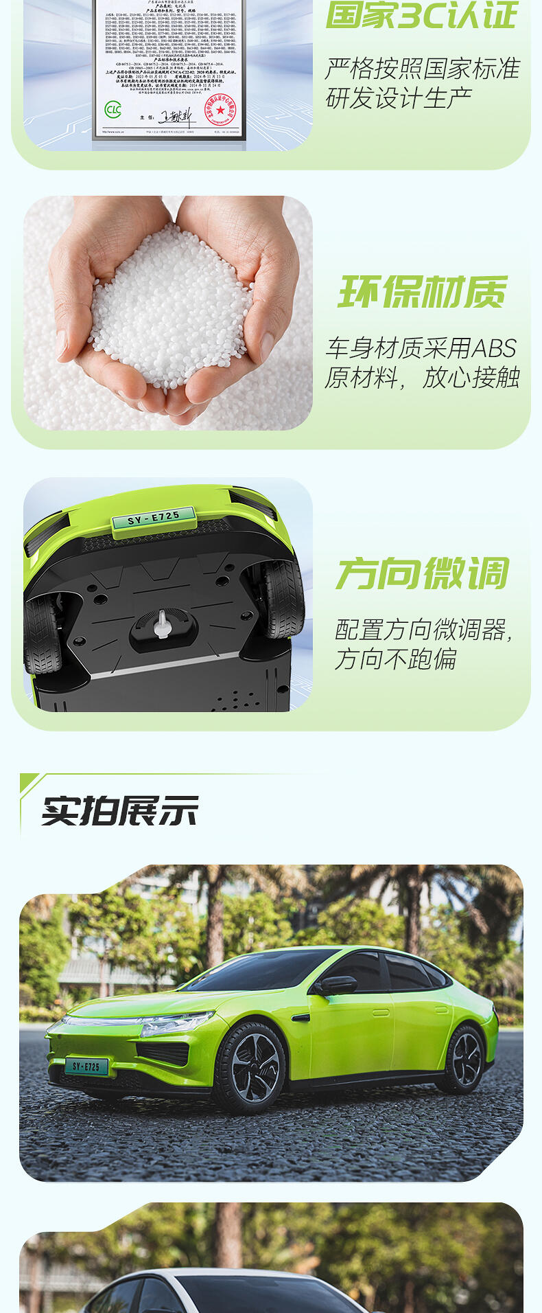 1、仿真新能源跑车外观与功能,搭配充电桩,时尚大方; 2、快速充电,充电30分钟,玩耍≥30分钟; 3、炫酷灯光秀,搭配节奏音乐,动感逼真;灯光和音乐模式可独立随心切换;; 4、自动泊车功能,高度仿真,体验感强; 5、全方位仿真遥控,前进/后退,左转/右转; 6、仿真声光; 7、2.4GHz抗干扰自动对码,可多车竞技玩耍。