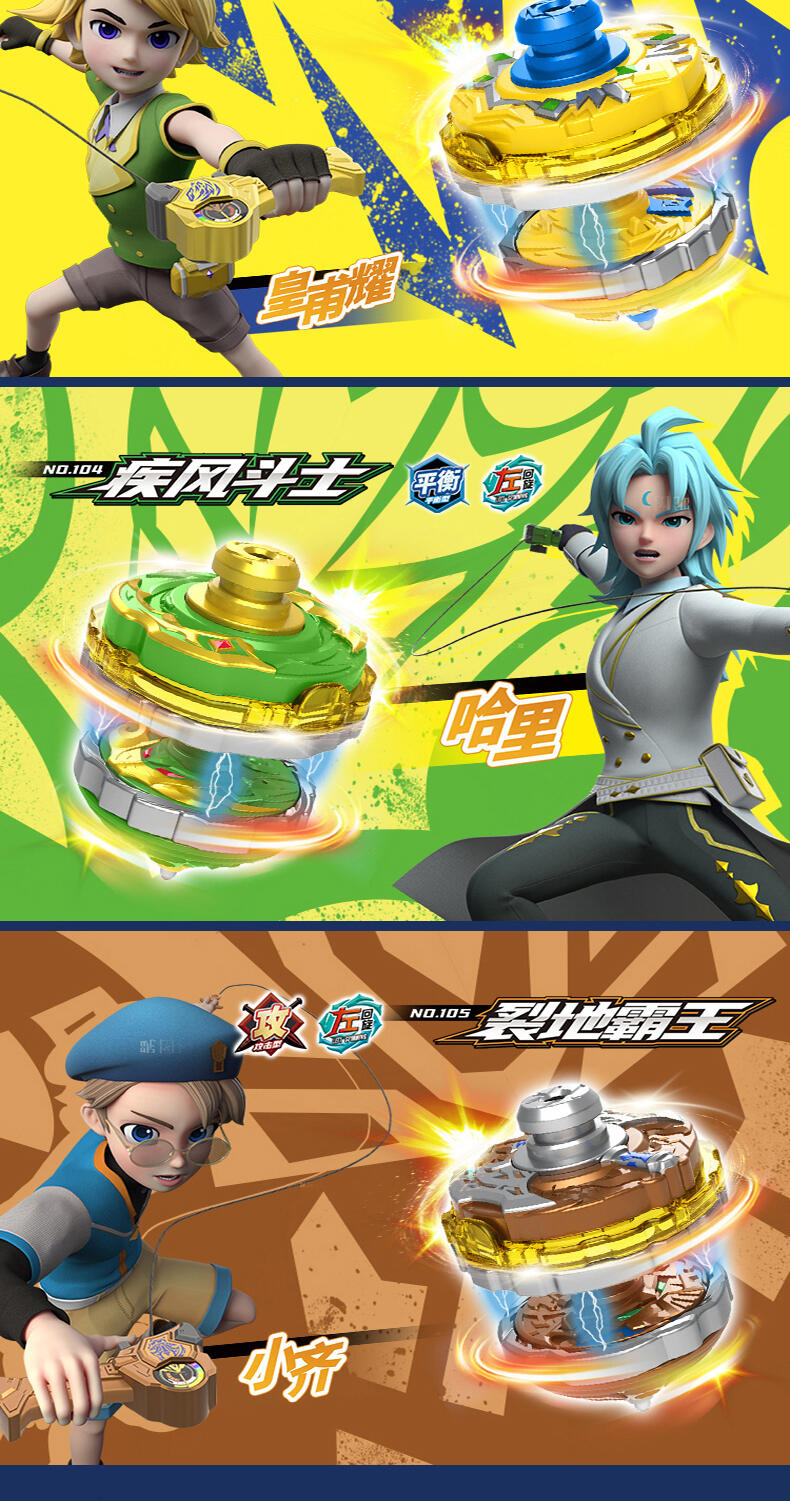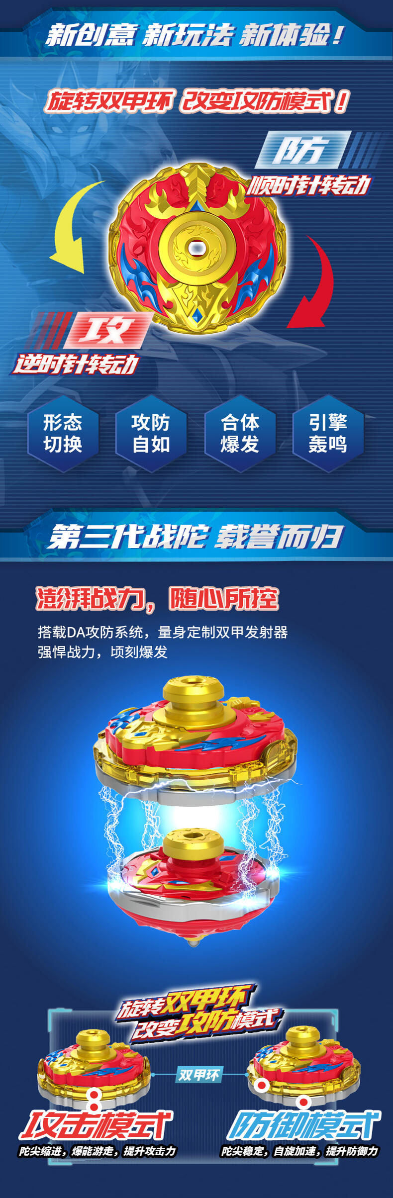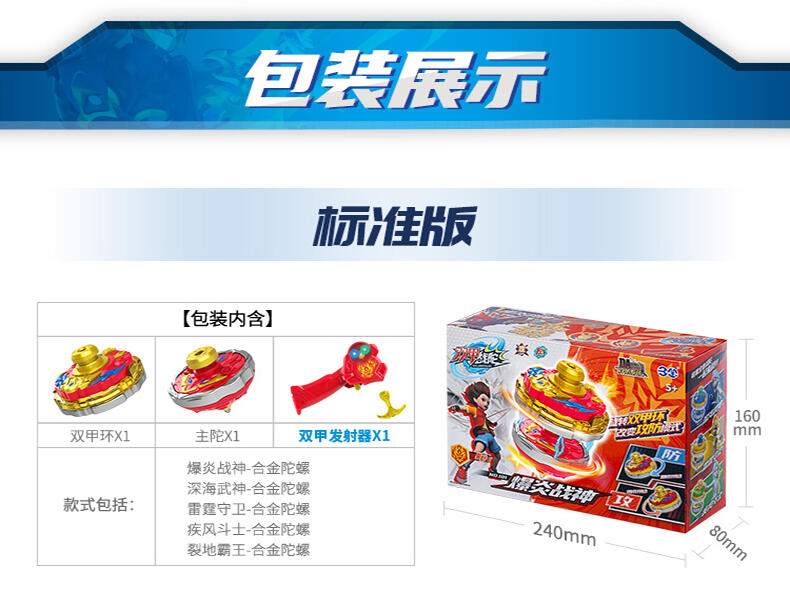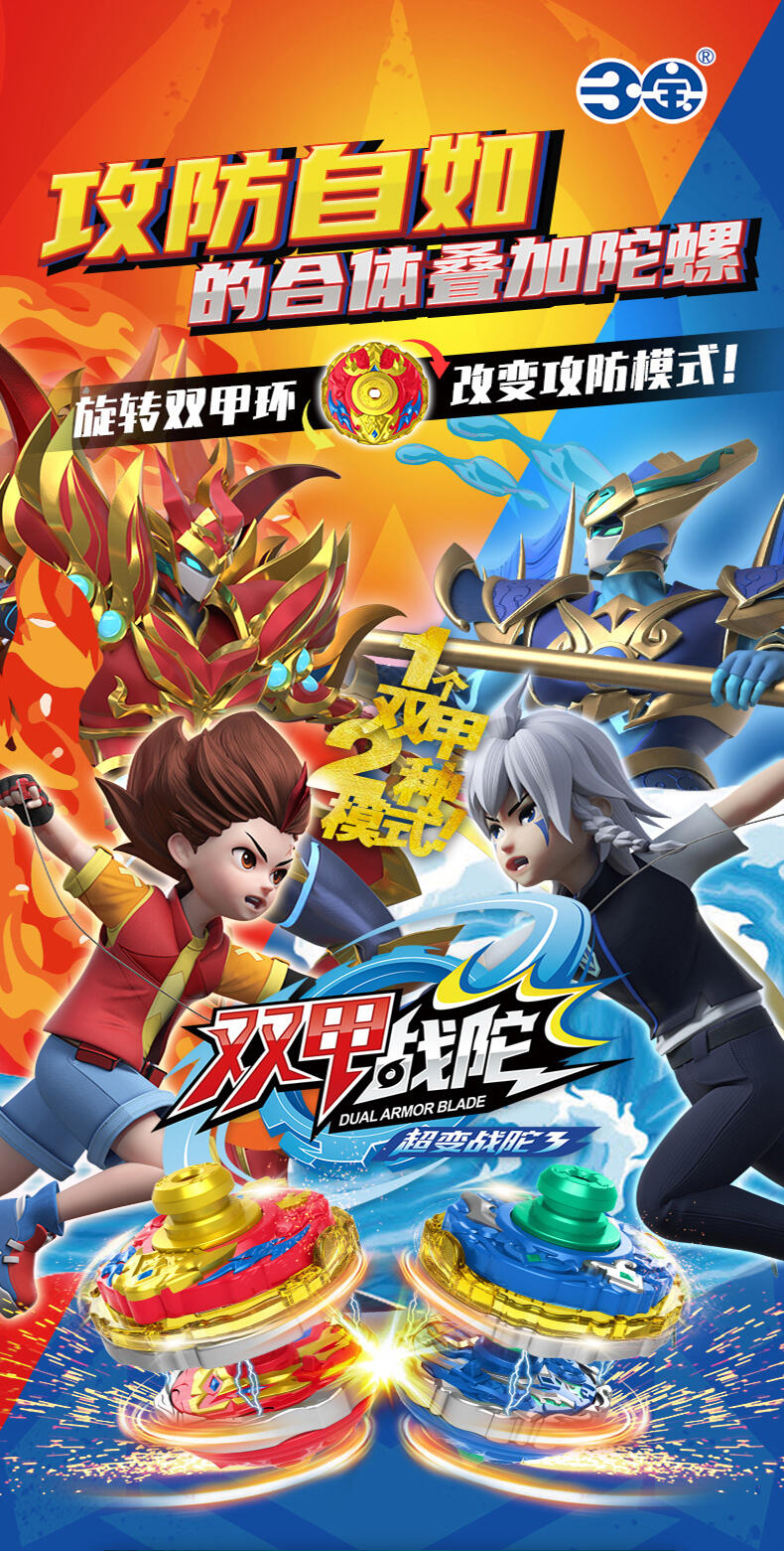 双甲战陀卖点:1个超能环包含两种战斗模式 "攻击" 和 "防守", 在发射主陀螺后, 玩家通过旋转超能环上爆甲环选择需要的战斗模式把超能环发射后与主陀螺叠加合体来增加陀螺的速度以及改变陀尖的缩进来改变陀螺的运动方向;陀螺外观设计以圣兽和武器为主, 造型炫酷吸睛;带有内置的齿轮发射器增加玩家在发射陀螺的刺激体验