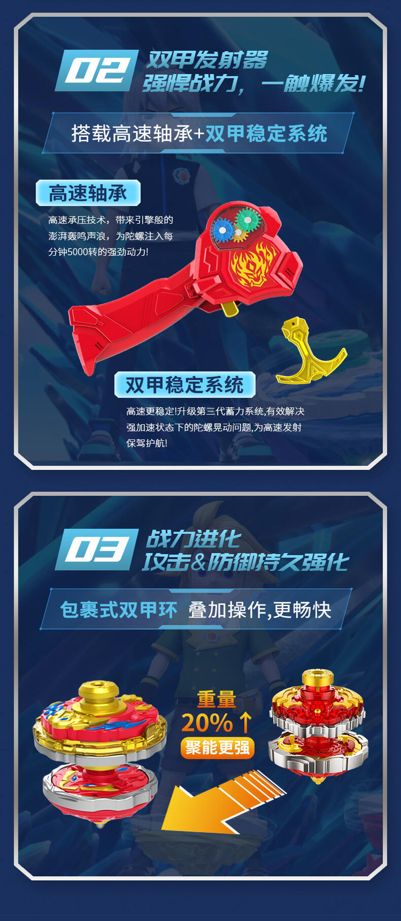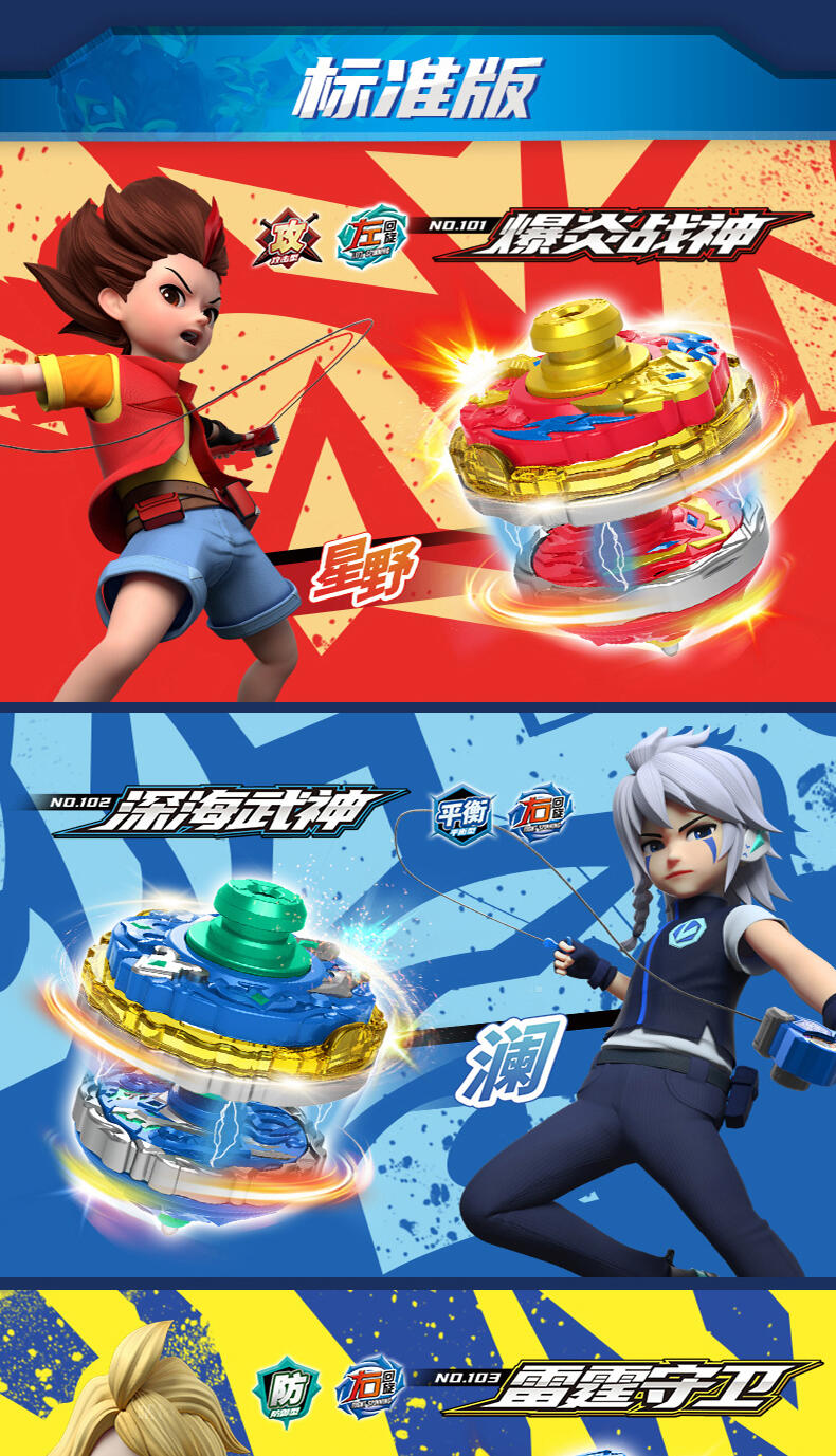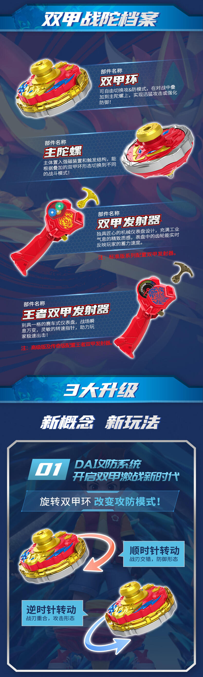 双甲战陀卖点:1个超能环包含两种战斗模式 "攻击" 和 "防守", 在发射主陀螺后, 玩家通过旋转超能环上爆甲环选择需要的战斗模式把超能环发射后与主陀螺叠加合体来增加陀螺的速度以及改变陀尖的缩进来改变陀螺的运动方向;陀螺外观设计以圣兽和武器为主, 造型炫酷吸睛;带有内置的齿轮发射器增加玩家在发射陀螺的刺激体验