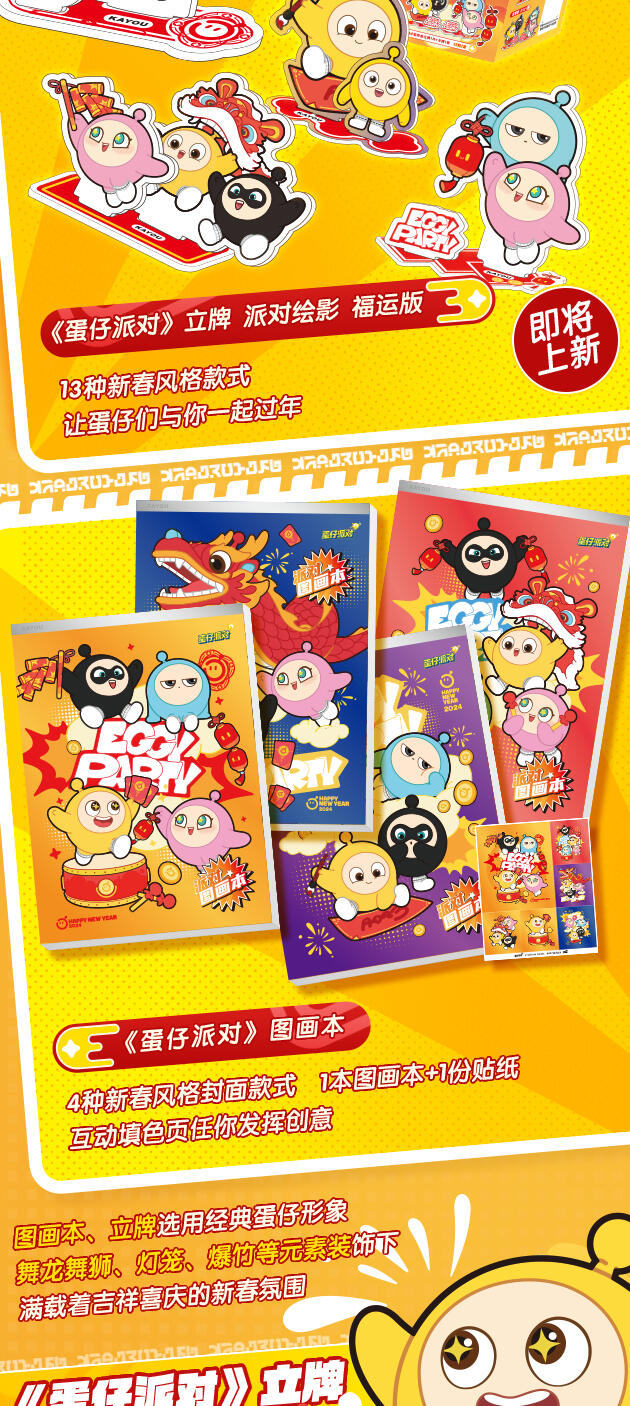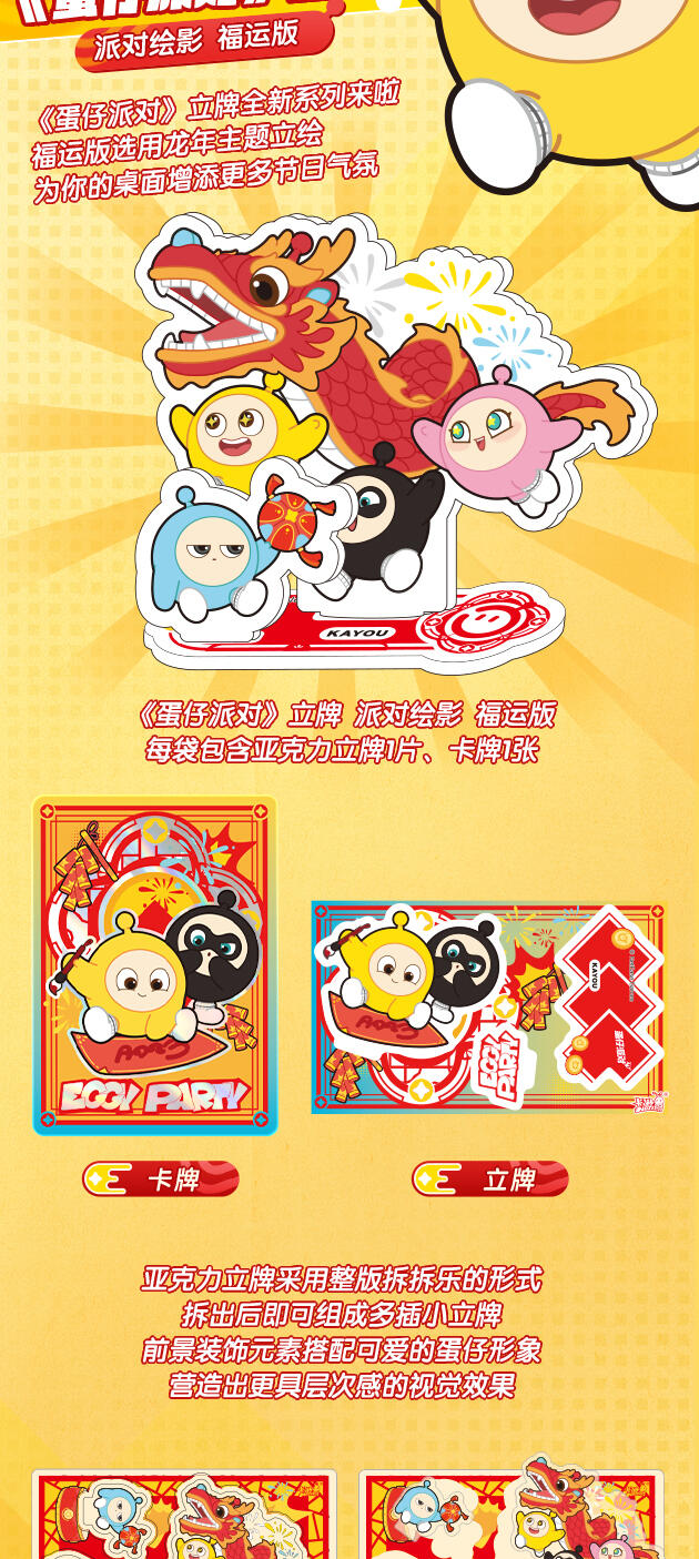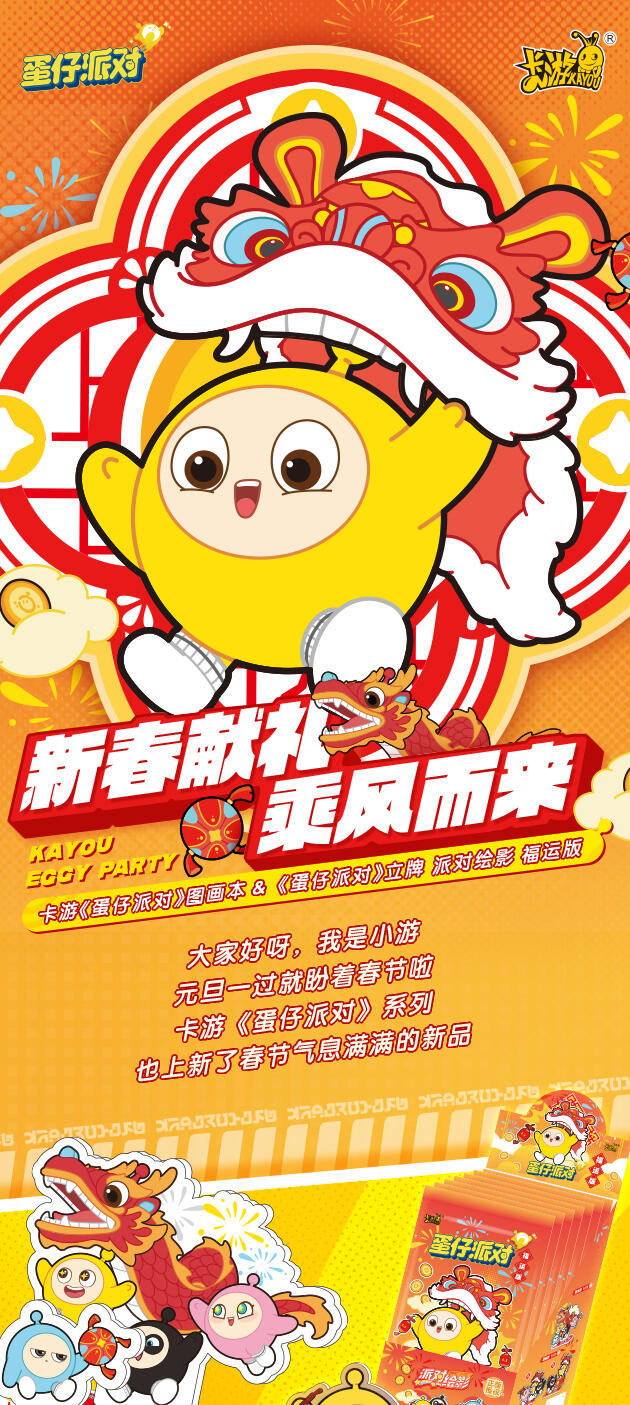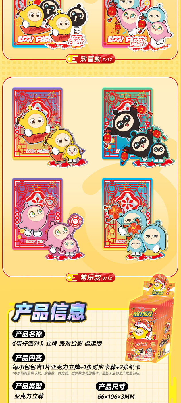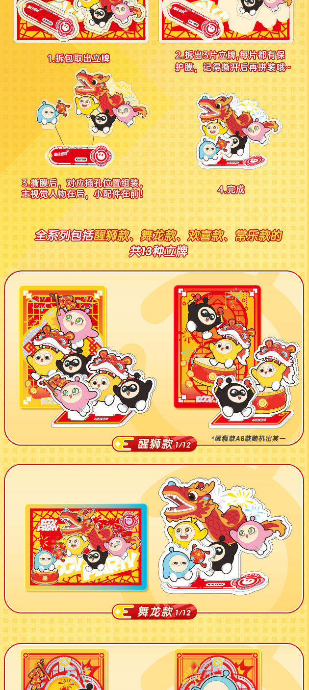 每盒含8片常规款+2片欢喜款+1一片舞龙款+1片醒狮款,共13款设计,其中醒狮款为A或者B款,即每盒随机出现1款每中盒12小包,整盒款式不重复
