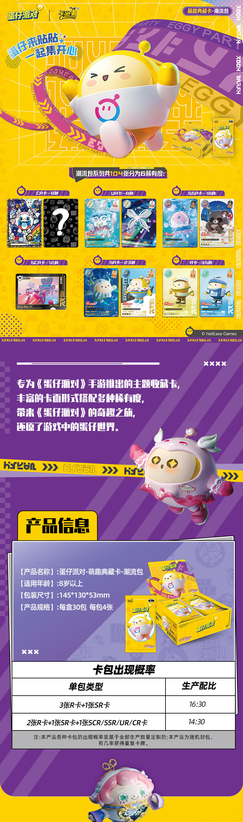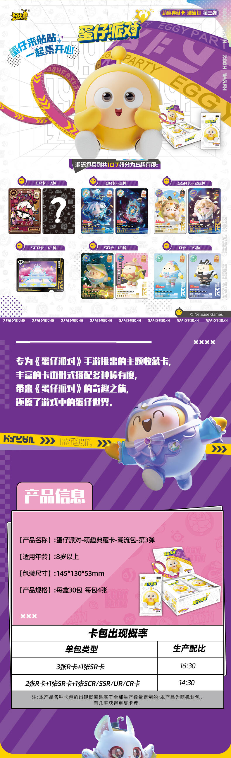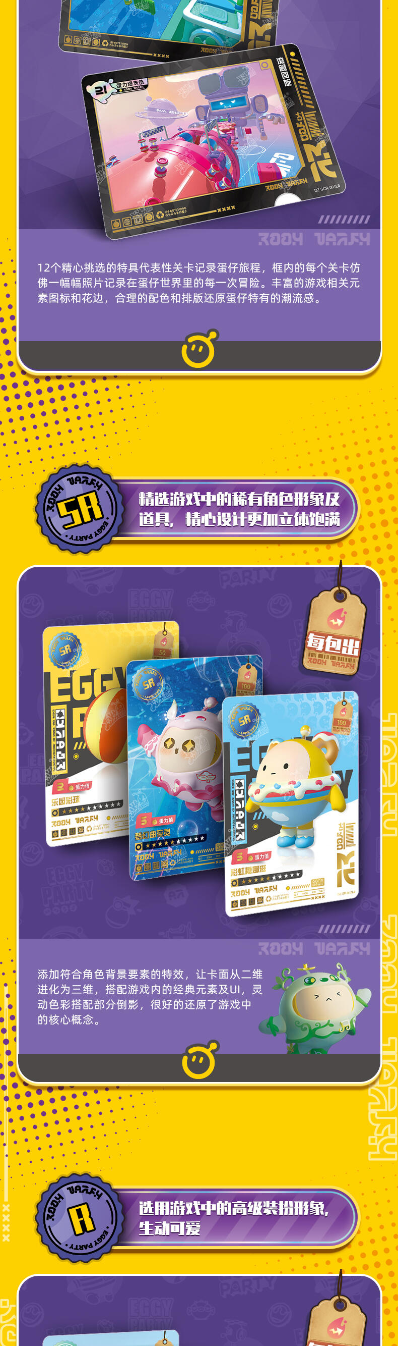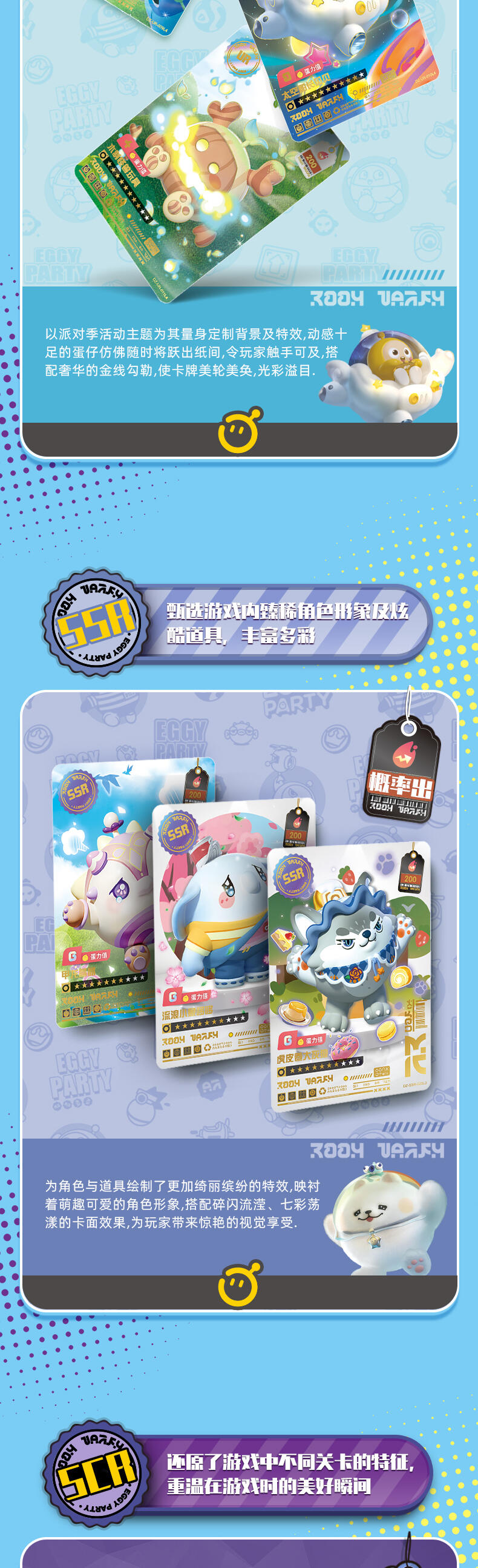 | 蛋仔派对萌趣典藏卡是专为蛋仔派对游戏推出的主题收藏卡产品。产品将深度还原蛋仔派对游戏中萌趣可爱的人物形象,丰富的游戏细节以卡面形式还原:游戏内角色形象、元素、图标、潮流度、关卡、等内容立于卡面之上,搭配精美的工艺。丰富的卡面形式搭配多种稀有度,带来蛋仔派对的奇趣之旅。 |