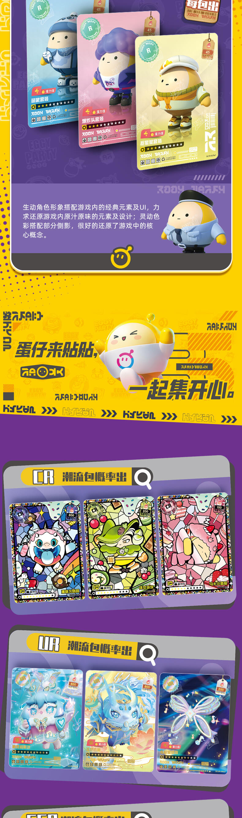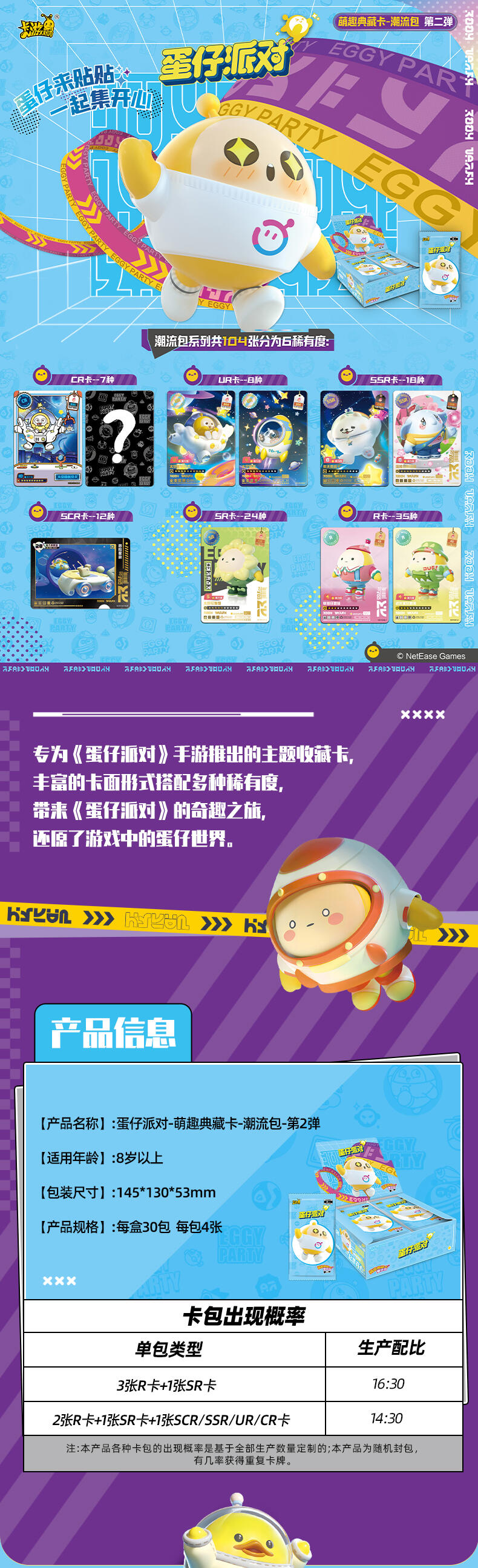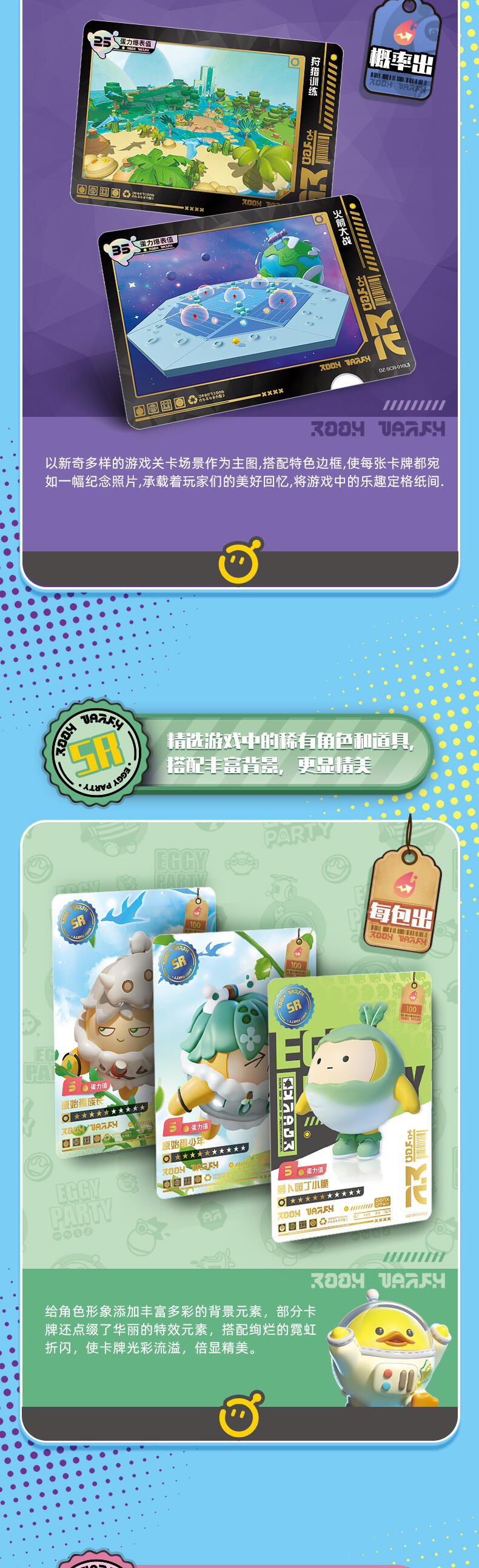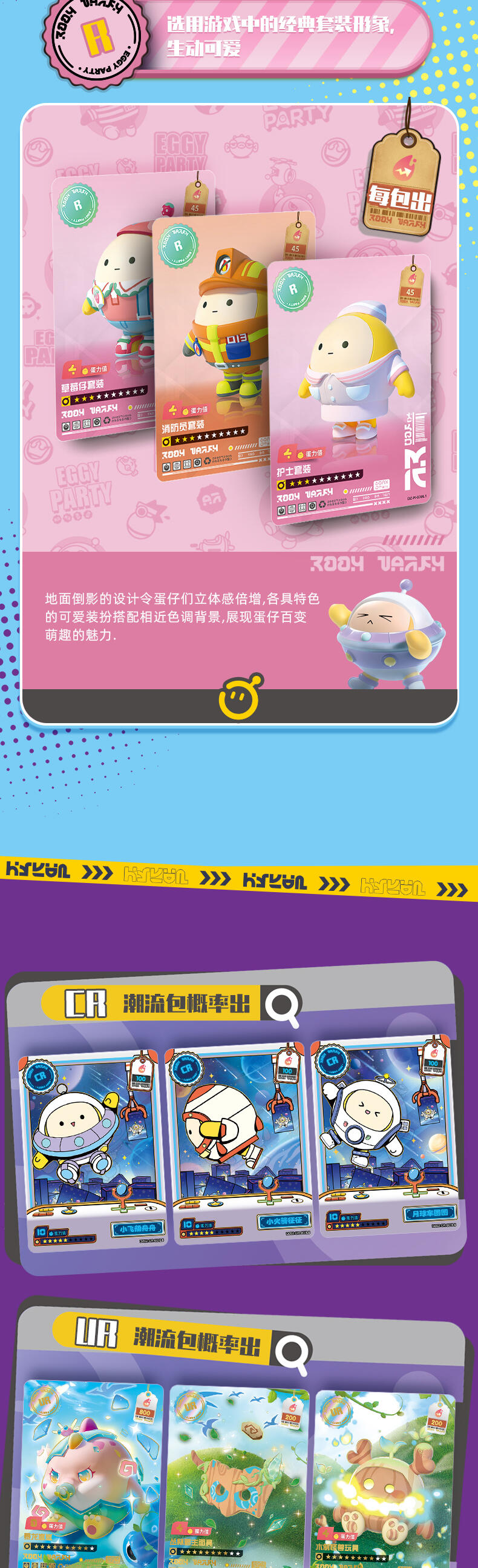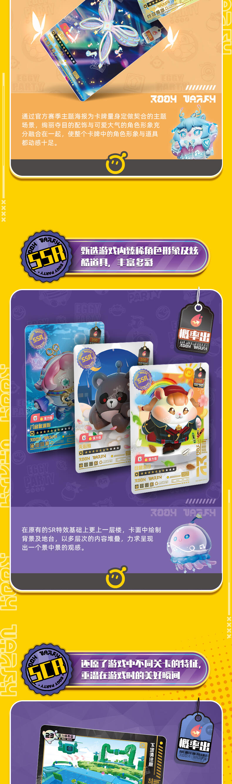 | 蛋仔派对萌趣典藏卡是专为蛋仔派对游戏推出的主题收藏卡产品。产品将深度还原蛋仔派对游戏中萌趣可爱的人物形象,丰富的游戏细节以卡面形式还原:游戏内角色形象、元素、图标、潮流度、关卡、等内容立于卡面之上,搭配精美的工艺。丰富的卡面形式搭配多种稀有度,带来蛋仔派对的奇趣之旅。 |