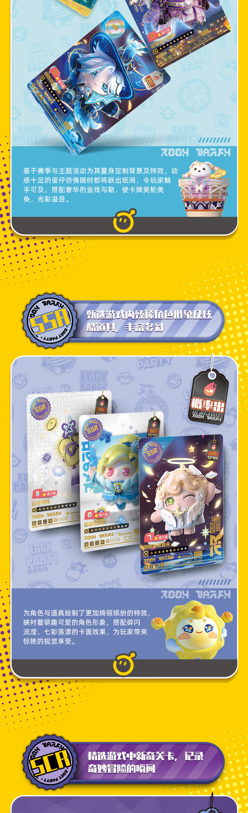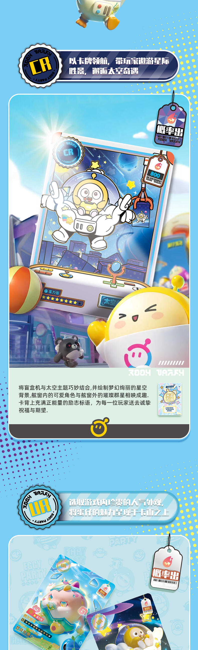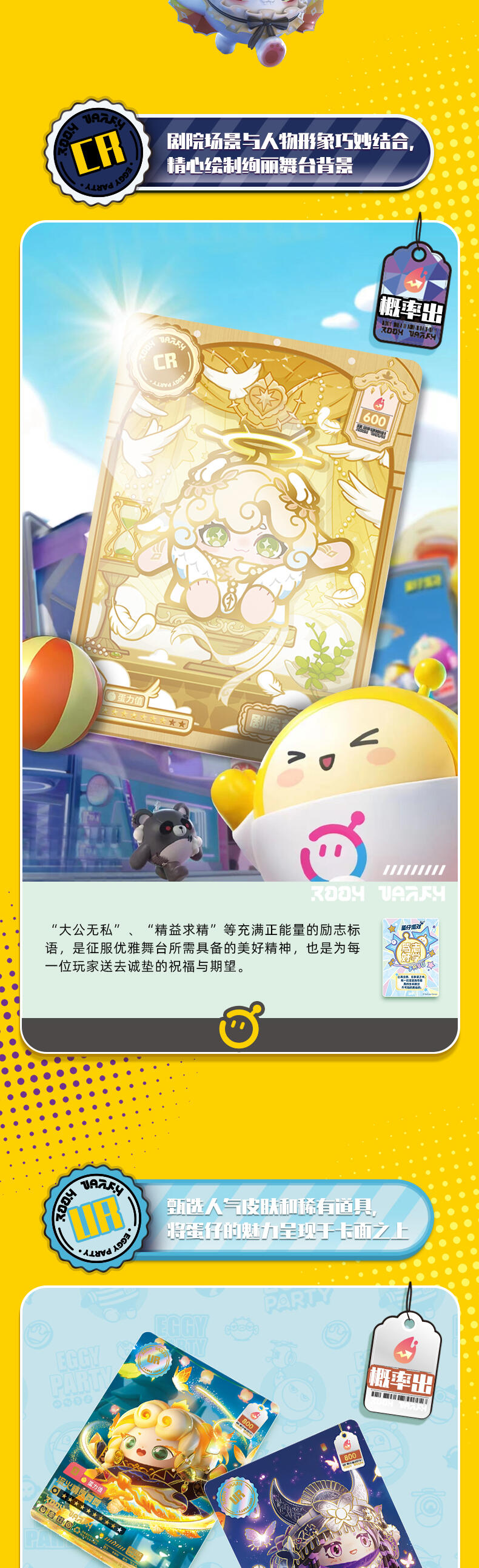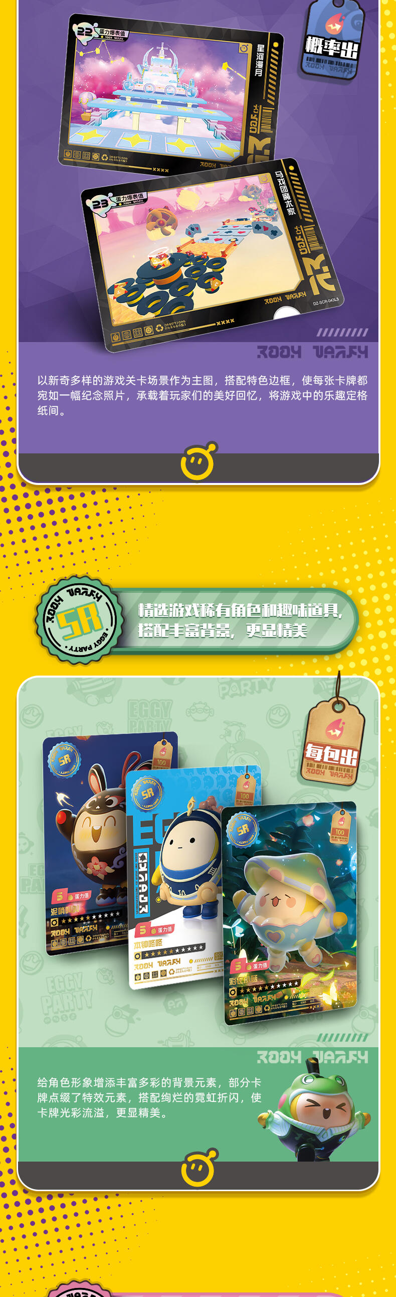 | 蛋仔派对萌趣典藏卡是专为蛋仔派对游戏推出的主题收藏卡产品。产品将深度还原蛋仔派对游戏中萌趣可爱的人物形象,丰富的游戏细节以卡面形式还原:游戏内角色形象、元素、图标、潮流度、关卡、等内容立于卡面之上,搭配精美的工艺。丰富的卡面形式搭配多种稀有度,带来蛋仔派对的奇趣之旅。 |