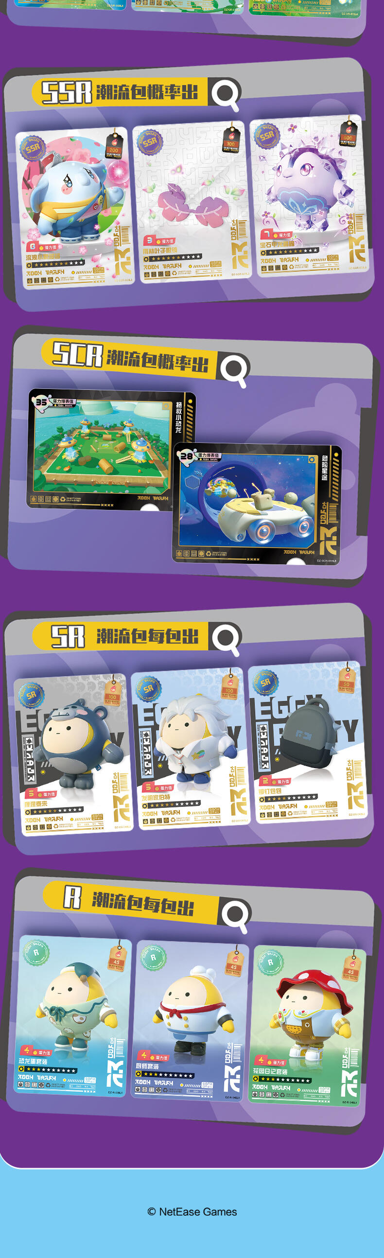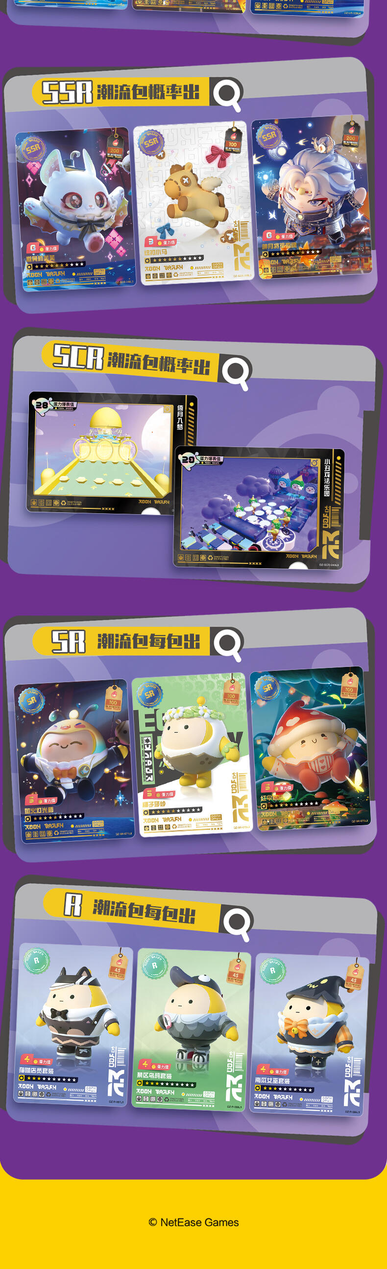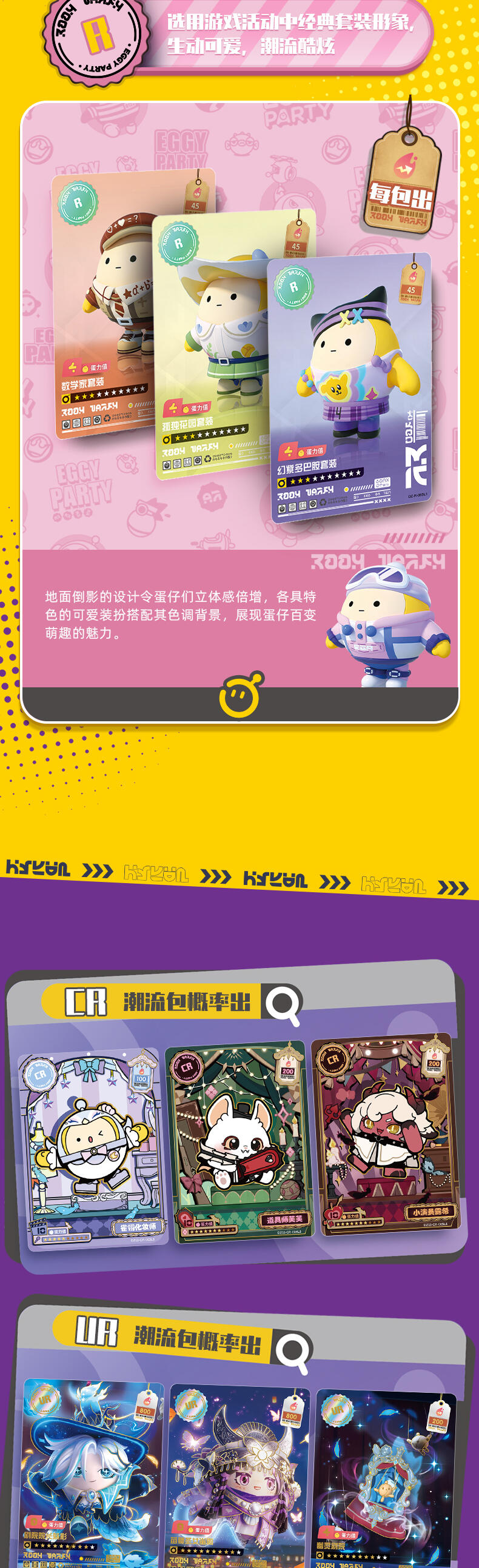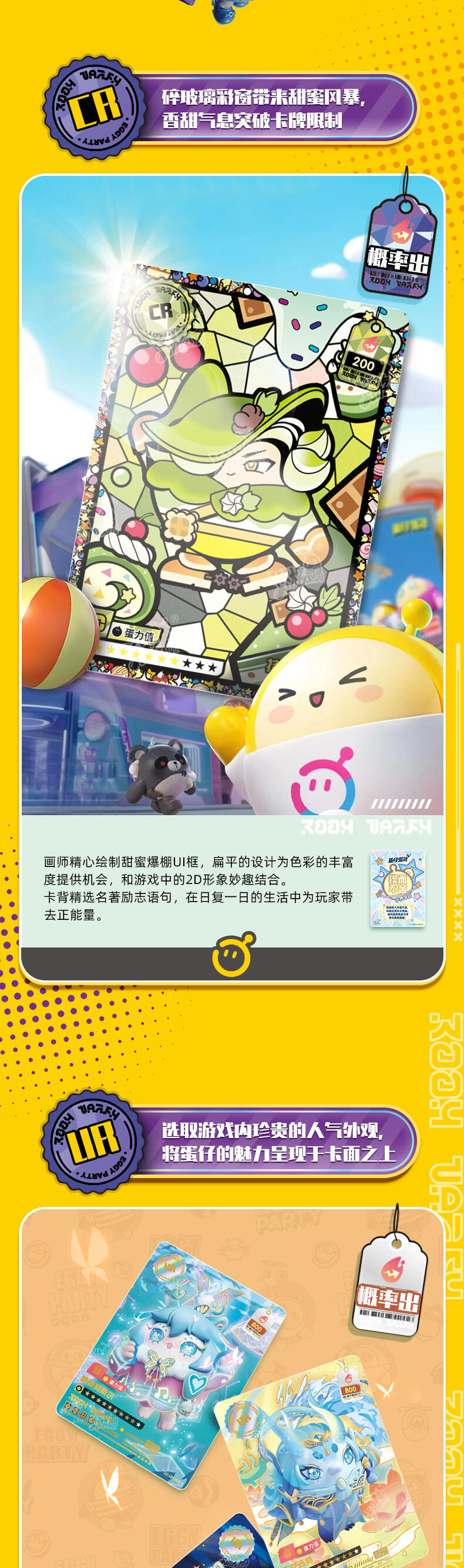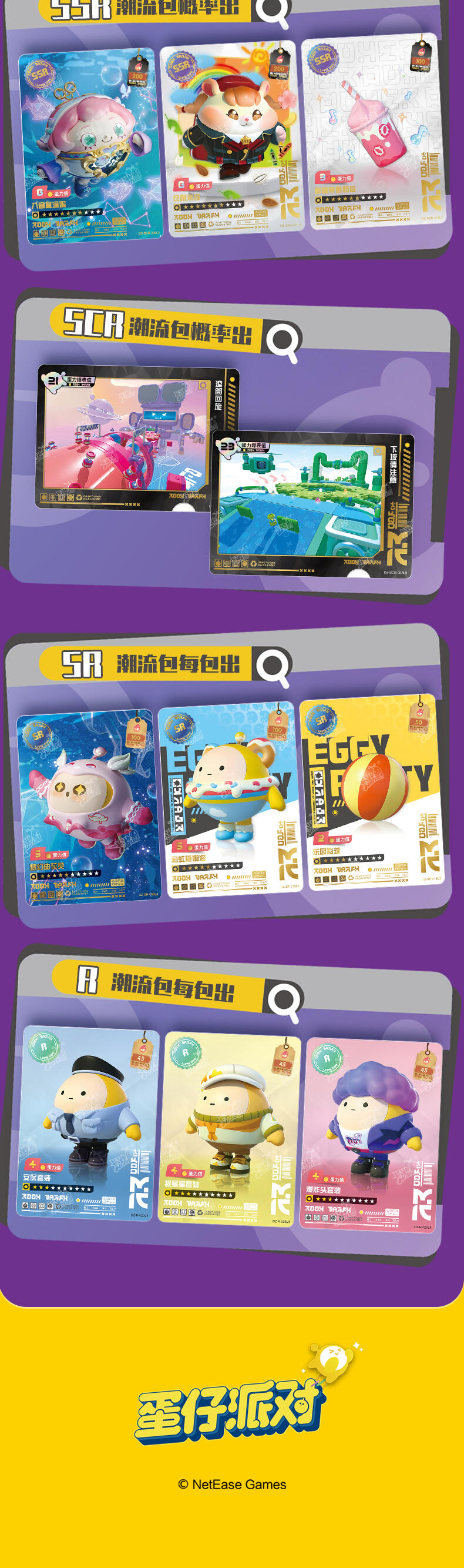 | 蛋仔派对萌趣典藏卡是专为蛋仔派对游戏推出的主题收藏卡产品。产品将深度还原蛋仔派对游戏中萌趣可爱的人物形象,丰富的游戏细节以卡面形式还原:游戏内角色形象、元素、图标、潮流度、关卡、等内容立于卡面之上,搭配精美的工艺。丰富的卡面形式搭配多种稀有度,带来蛋仔派对的奇趣之旅。 |