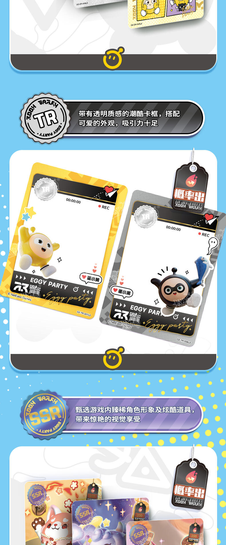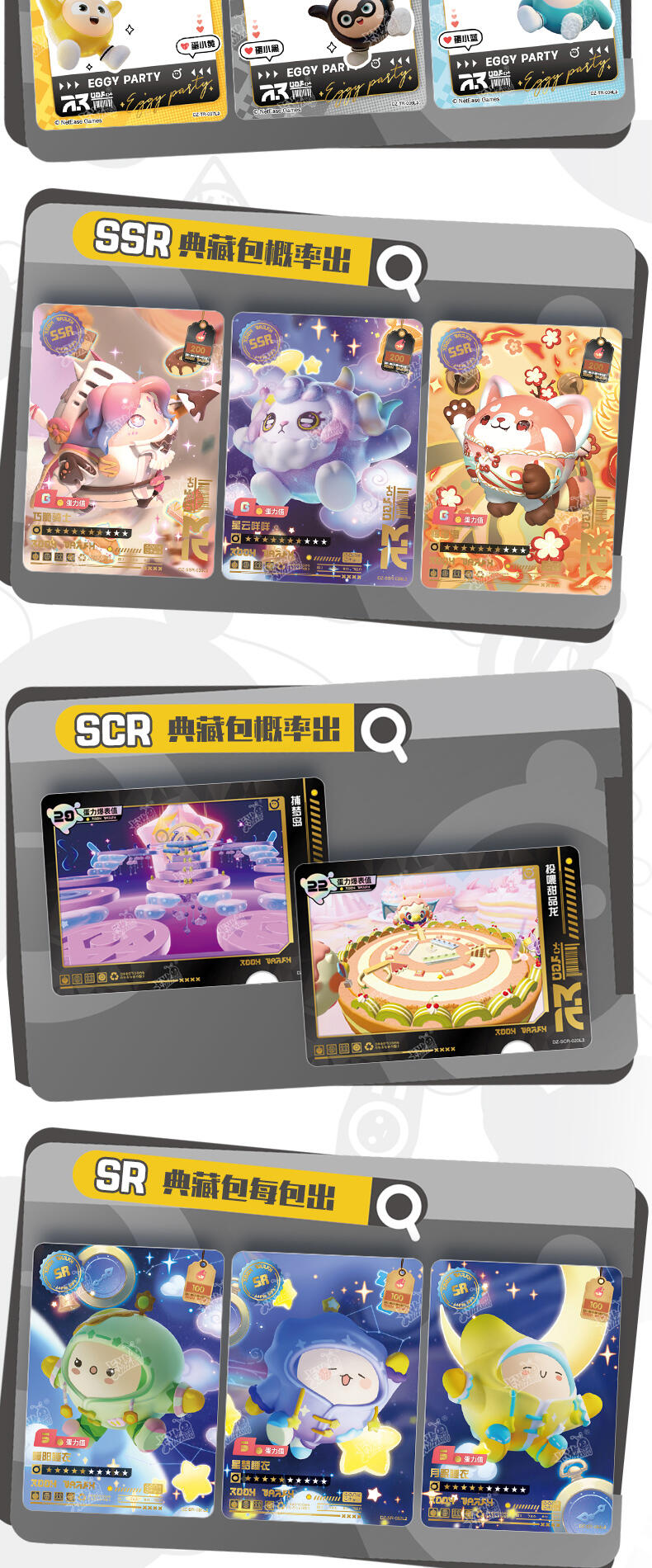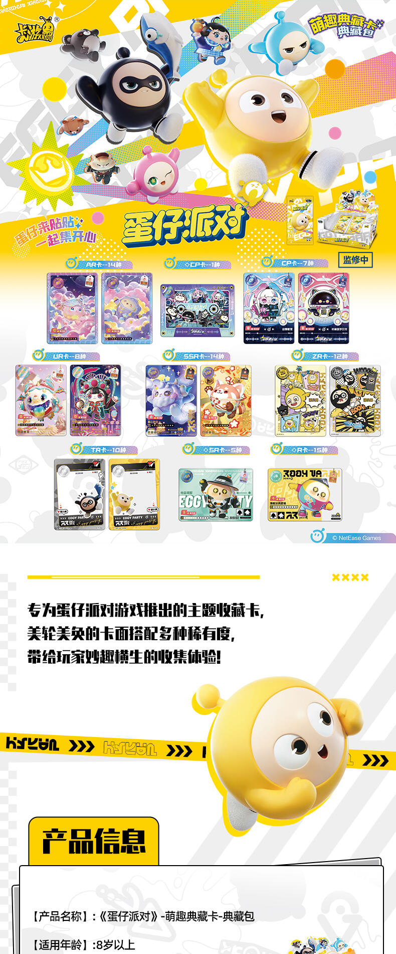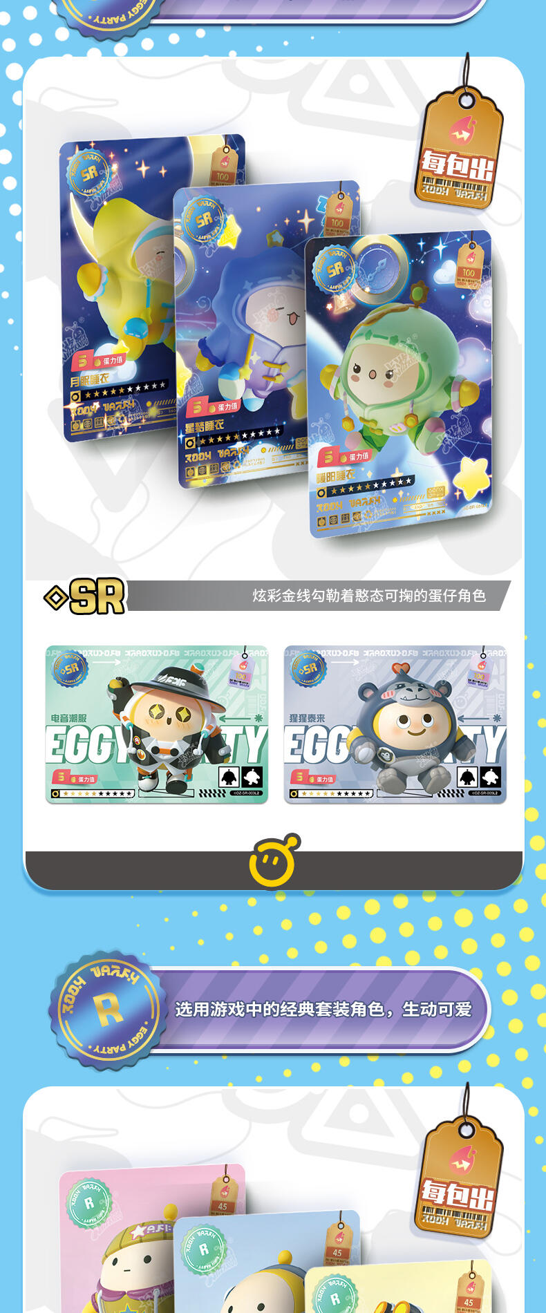 蛋仔派对萌趣典藏卡是由人气休闲竞技手游《蛋仔派对》 官方授权,卡游开发制作的正版卡牌产品。卡牌收录了 角色、道具、关卡等百变奇趣的游戏元素,通过卓越的 设计与精美的工艺,深度还原潮酷萌趣的蛋仔形象和奇 妙梦幻的蛋仔世界。美轮美奂的卡面搭配多种稀有度, 带给玩家妙趣横生的收集体验! 这次的典藏包新增了多个全新卡种!AR、◇CP、CP、 ZR、TR、◇SR、◇R,敬请期待!