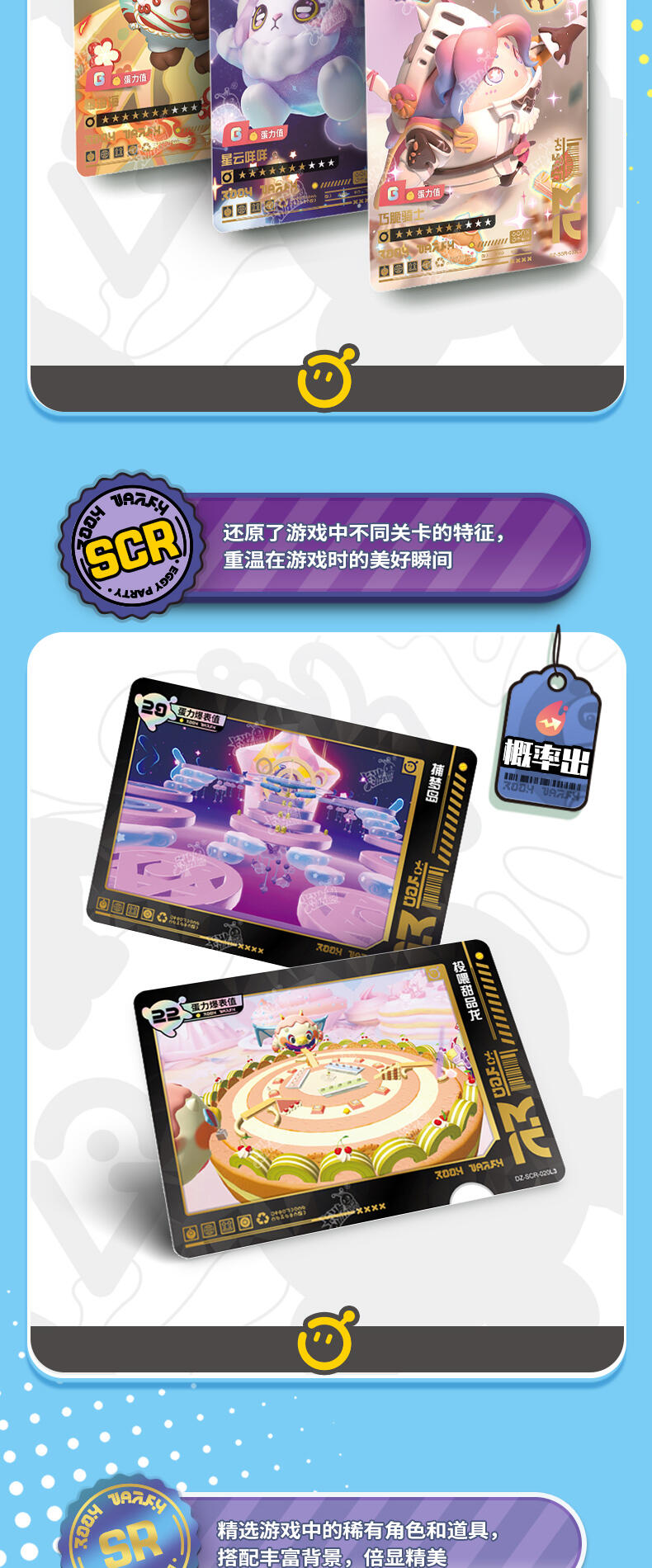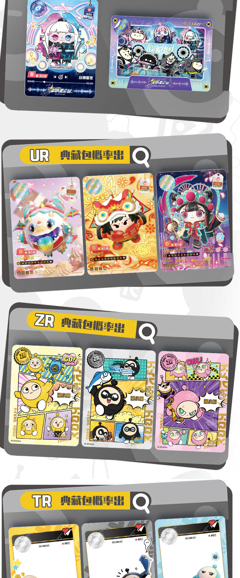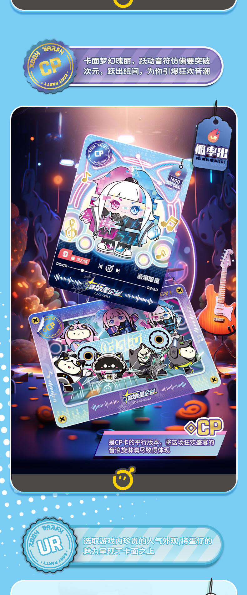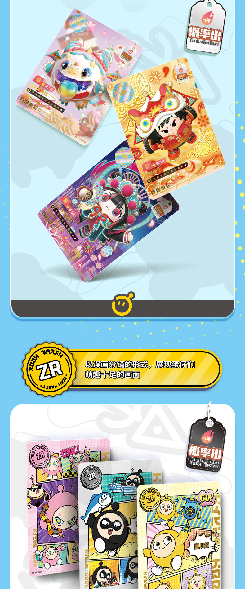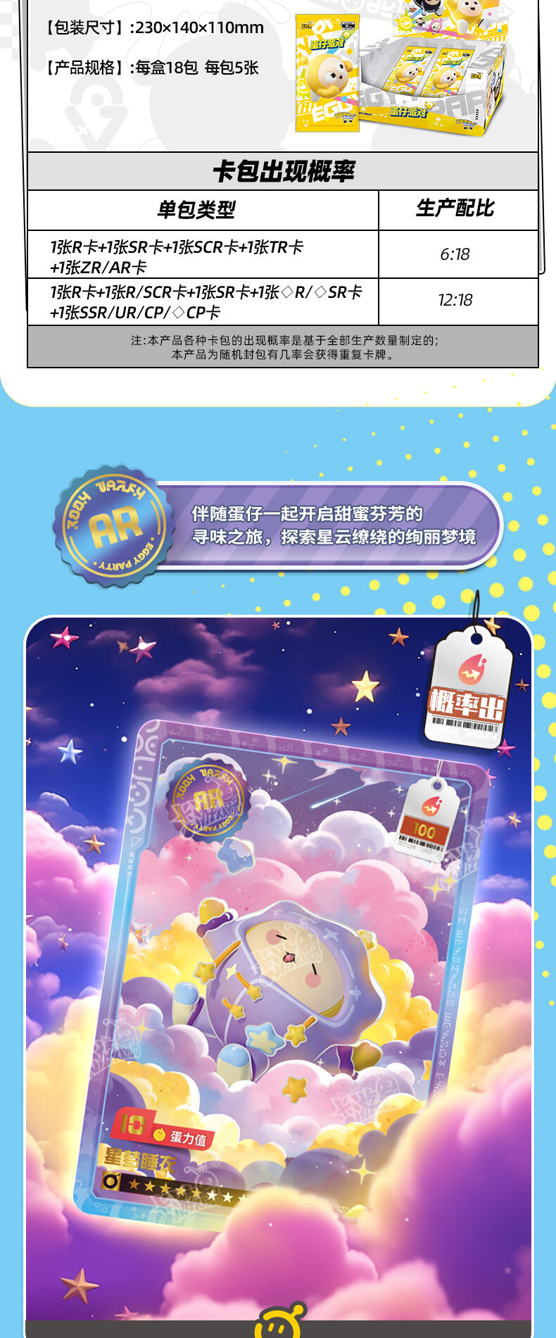 蛋仔派对萌趣典藏卡是由人气休闲竞技手游《蛋仔派对》 官方授权,卡游开发制作的正版卡牌产品。卡牌收录了 角色、道具、关卡等百变奇趣的游戏元素,通过卓越的 设计与精美的工艺,深度还原潮酷萌趣的蛋仔形象和奇 妙梦幻的蛋仔世界。美轮美奂的卡面搭配多种稀有度, 带给玩家妙趣横生的收集体验! 这次的典藏包新增了多个全新卡种!AR、◇CP、CP、 ZR、TR、◇SR、◇R,敬请期待!
