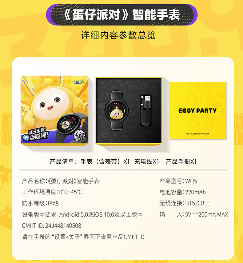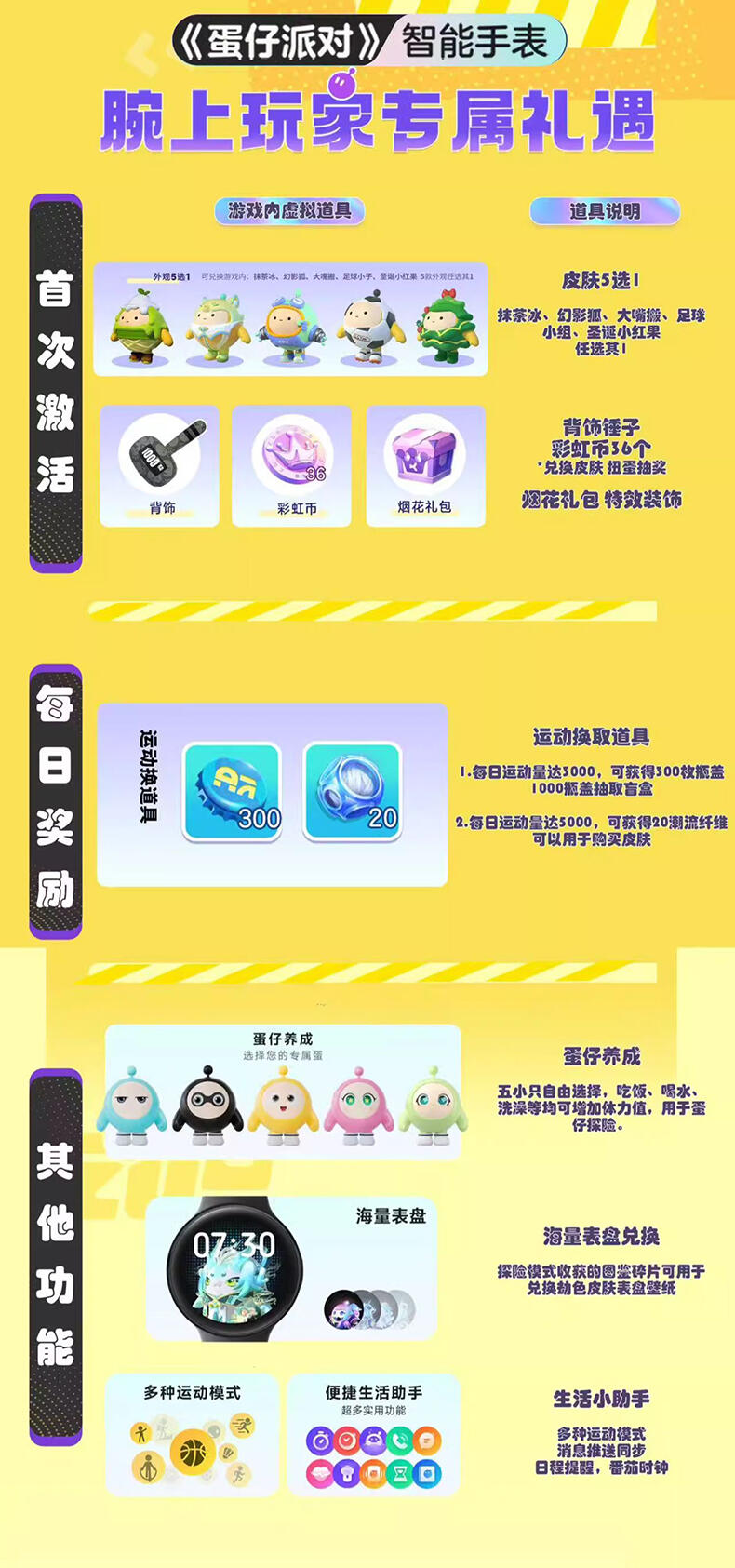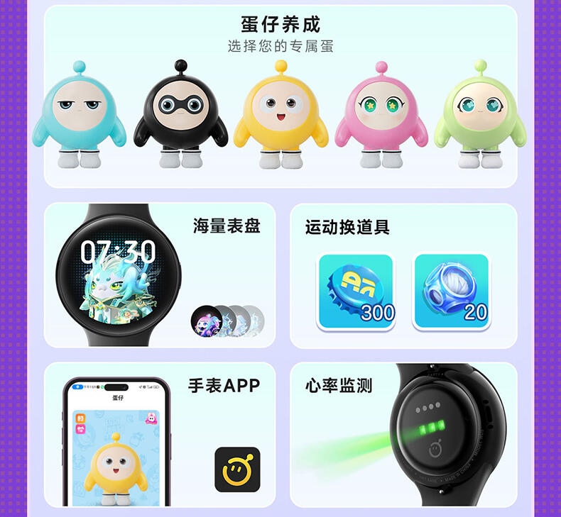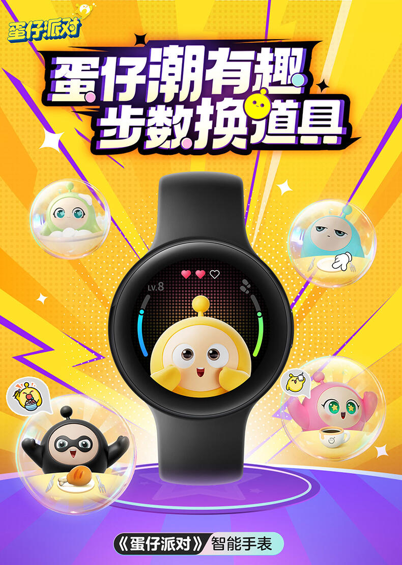 1、运动兑换道具,让孩子爱上运动 2、有爱互动专属孩子间的社交属性 3、蛋仔派对卡通风格,多款蛋仔形象表 盘随意切换