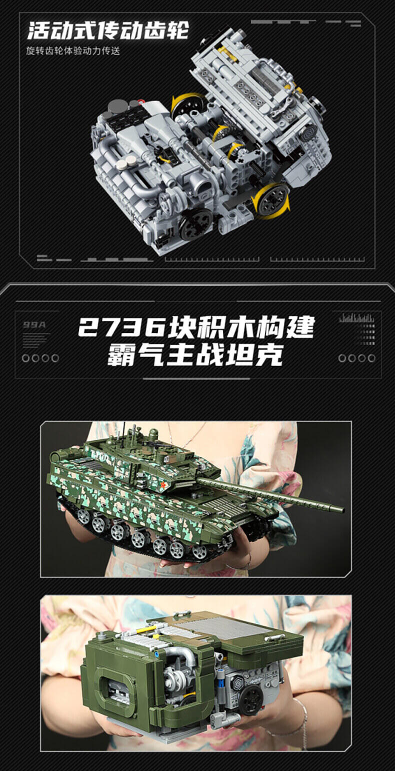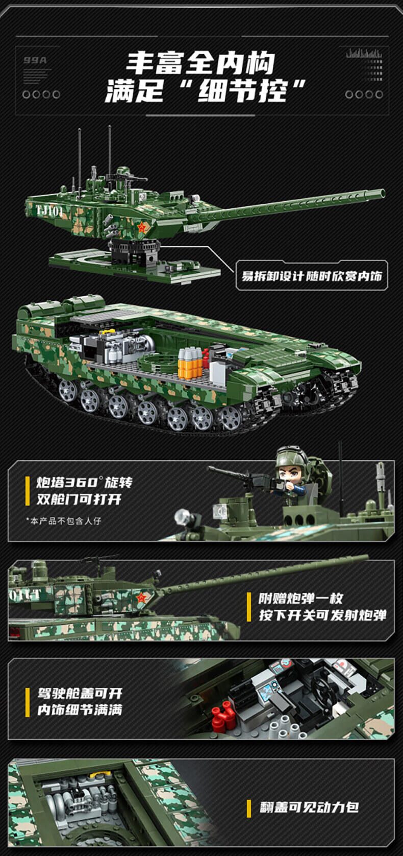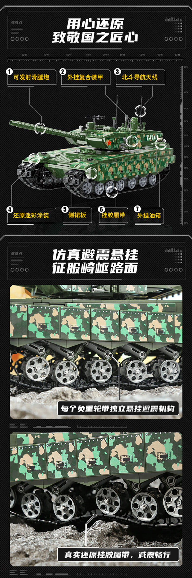 1.动力包可分拆为发动机和传动系统;发动机和传动系统内部有联动功能;驾驶舱、炮塔战斗舱、动力舱为可拆解模块,还原精细内饰;减震履带模拟坦克行进节奏,具弹射功能。