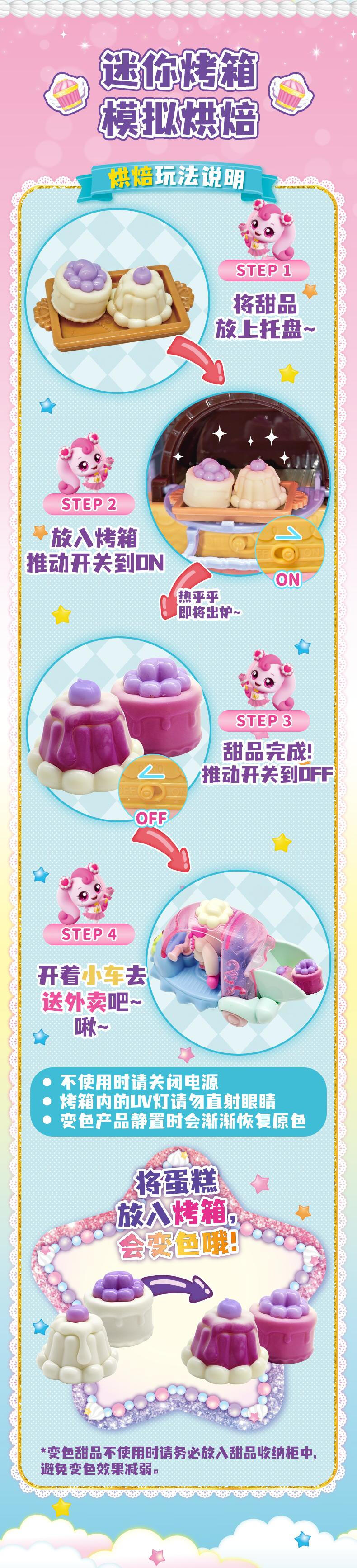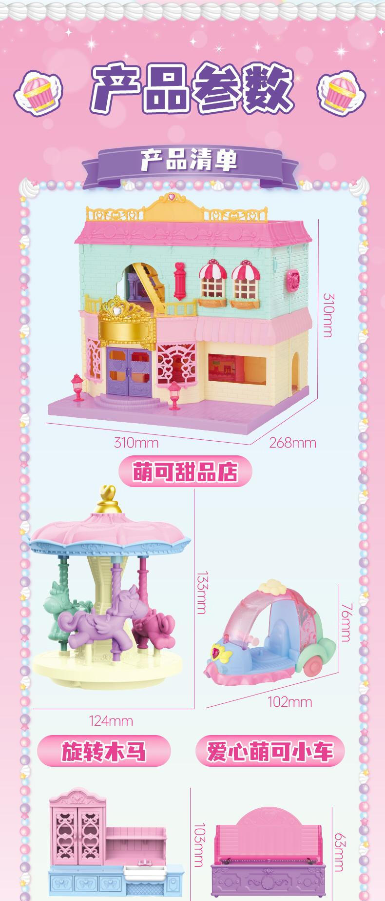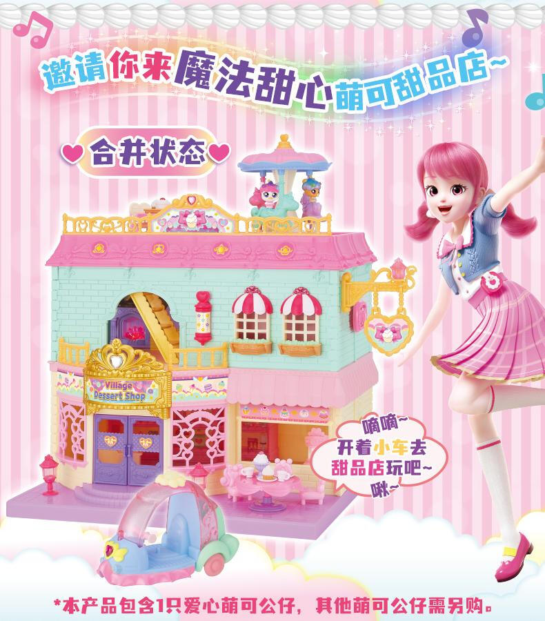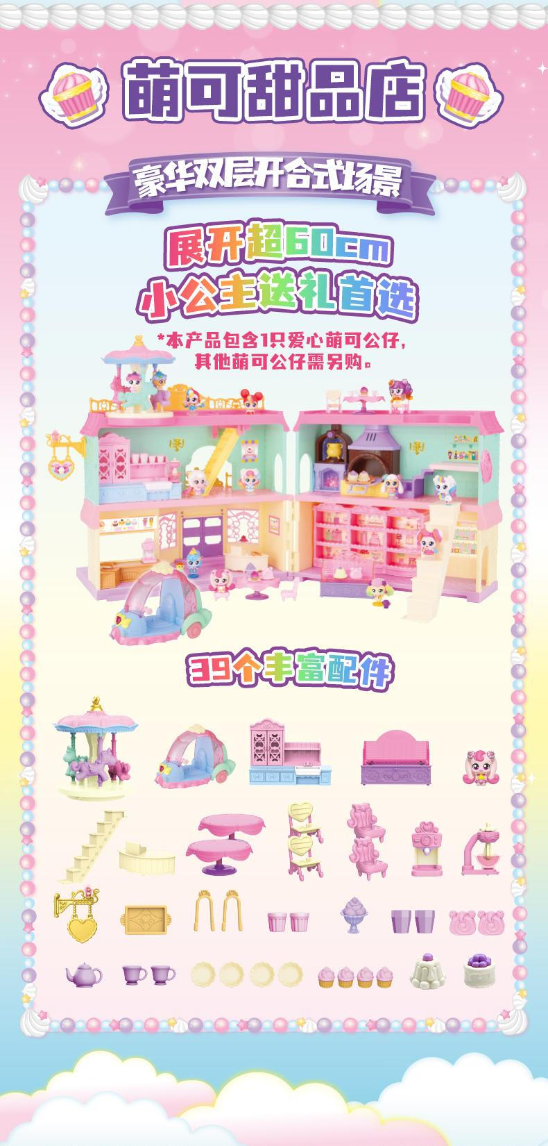 【产品配置】:萌可甜品店*1、爱心萌可公仔*1、可变色甜品*2、招牌*1 、萌可小摩托*1、旋转木马*1、料理台*1、楼梯*1、柜台*1、桌子*2、椅子 *2、沙发*2、夹子*2、蛋糕卷*2、果酱*2、小碗*2、茶壶*1、冰淇淋杯*1 、咖啡杯*2、水杯*2、餐盘*2、托盘*1、搅拌机*1、咖啡机*1、草莓纸杯蛋糕*4、装饰贴纸*1 ①华丽双层开合式场景玩具,展开超60cm,小公主送礼首选。 ②精致还原动画设定的甜品店场景,约40款丰富配件,还能体验变色烤蛋糕的魔法~! ③带声光功能,配全新动作的爱心萌可及小摩托。