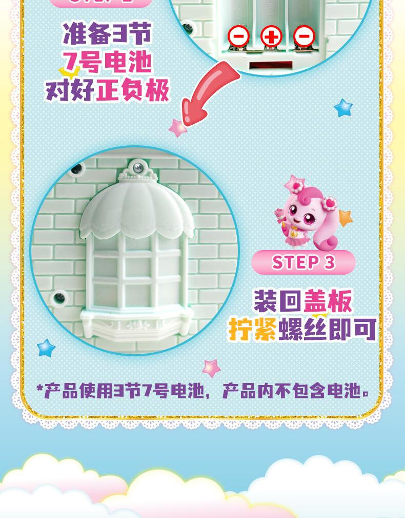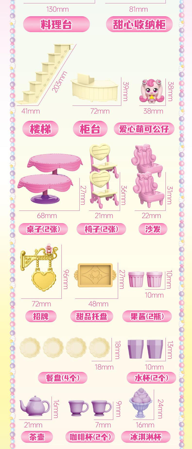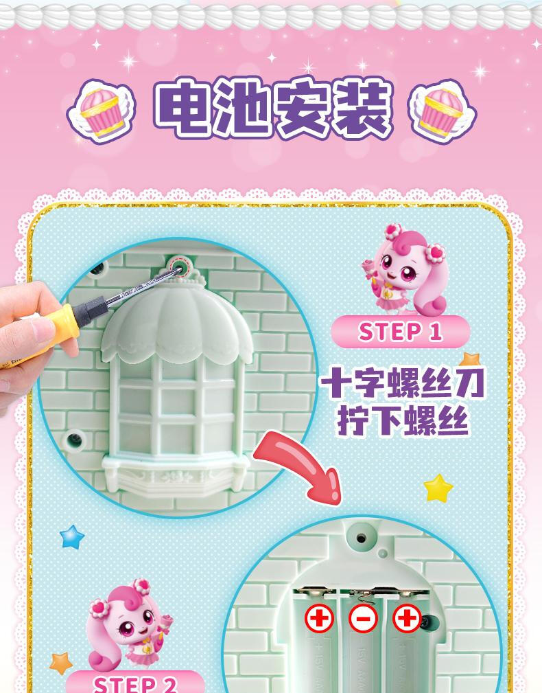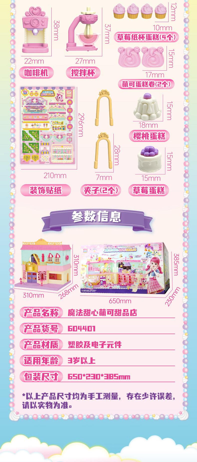 【产品配置】:萌可甜品店*1、爱心萌可公仔*1、可变色甜品*2、招牌*1 、萌可小摩托*1、旋转木马*1、料理台*1、楼梯*1、柜台*1、桌子*2、椅子 *2、沙发*2、夹子*2、蛋糕卷*2、果酱*2、小碗*2、茶壶*1、冰淇淋杯*1 、咖啡杯*2、水杯*2、餐盘*2、托盘*1、搅拌机*1、咖啡机*1、草莓纸杯蛋糕*4、装饰贴纸*1 ①华丽双层开合式场景玩具,展开超60cm,小公主送礼首选。 ②精致还原动画设定的甜品店场景,约40款丰富配件,还能体验变色烤蛋糕的魔法~! ③带声光功能,配全新动作的爱心萌可及小摩托。