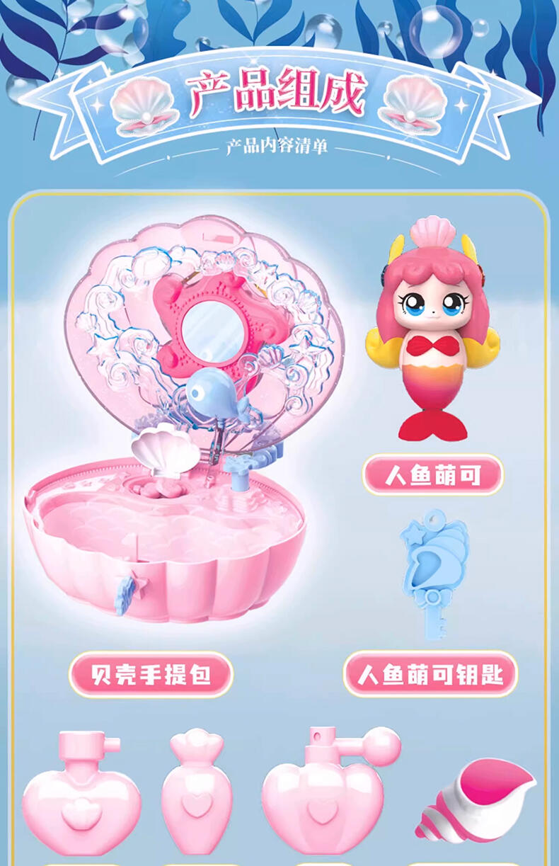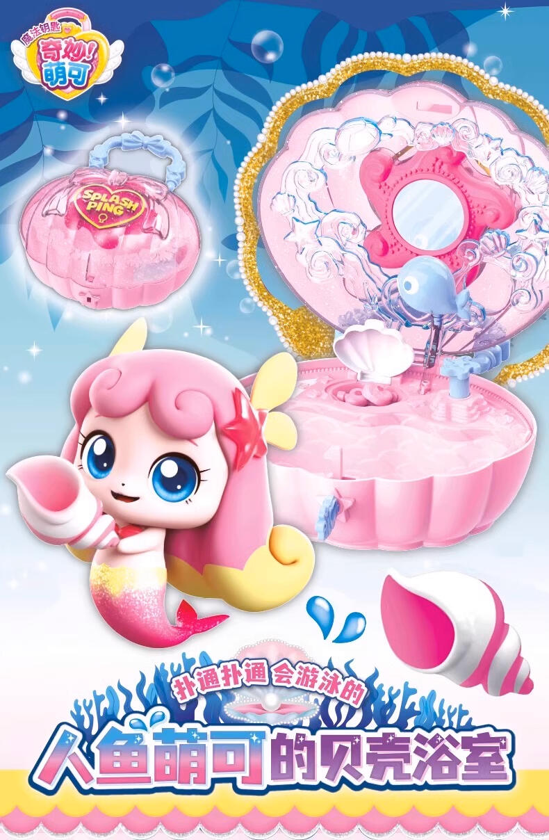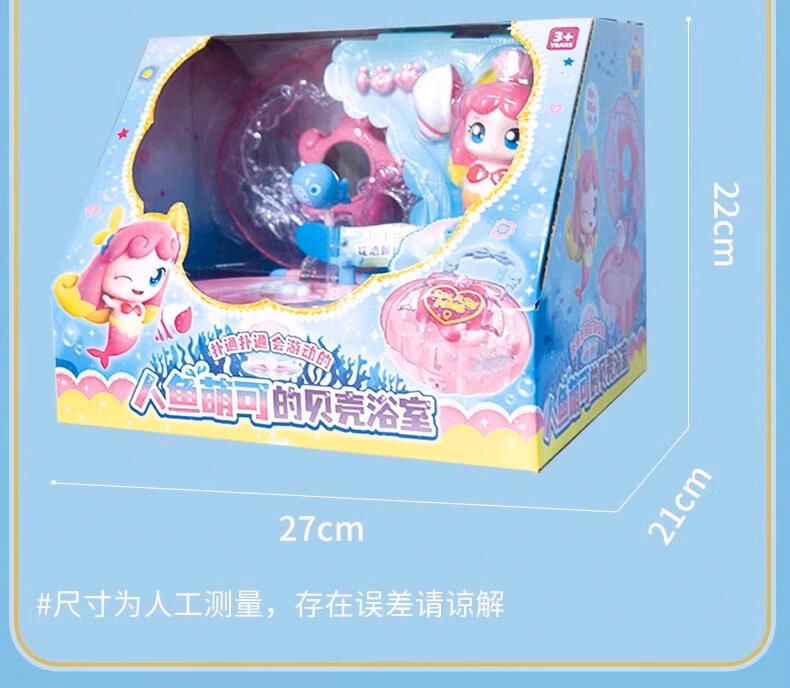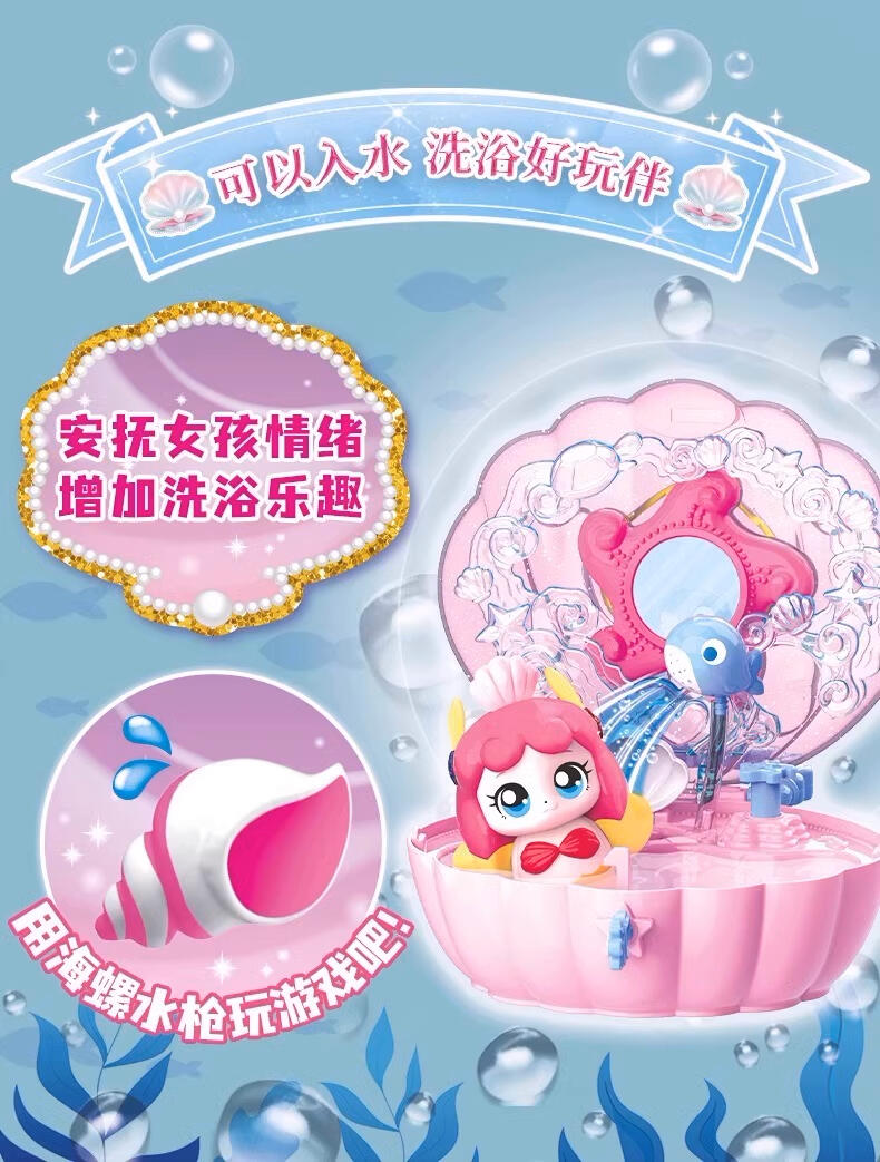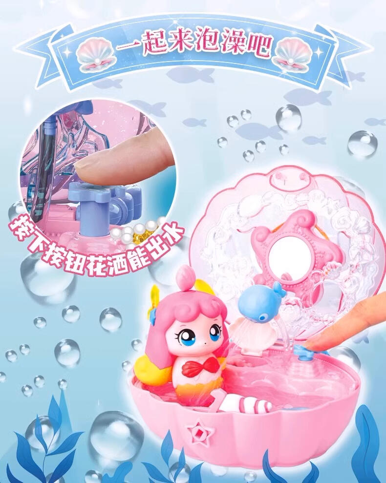 ①可以加水一起玩的浴室玩具,鲸鱼水龙头可喷水 ②拉出人鱼萌可尾巴,尾巴摆动并自动回缩,推动人鱼萌可在水里游动 ③搭配沐浴露洗发水小配件,模拟人鱼萌可洗澡 ④配海螺水枪,挤压吸水、喷水 ⑤盖上盖子,可爱包包造型。可收纳小物件。