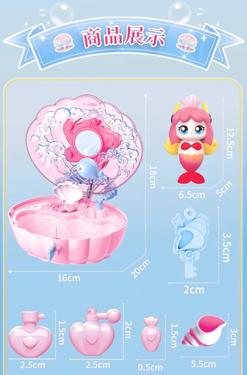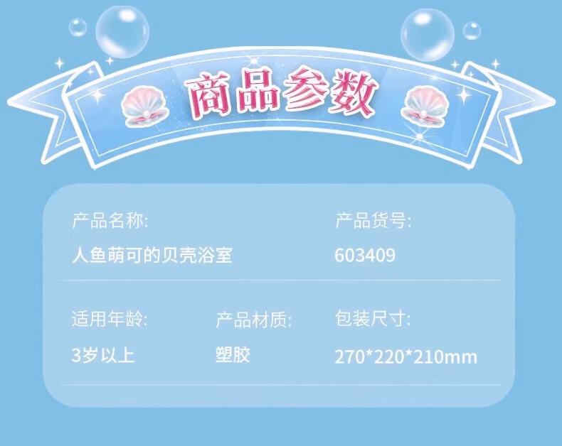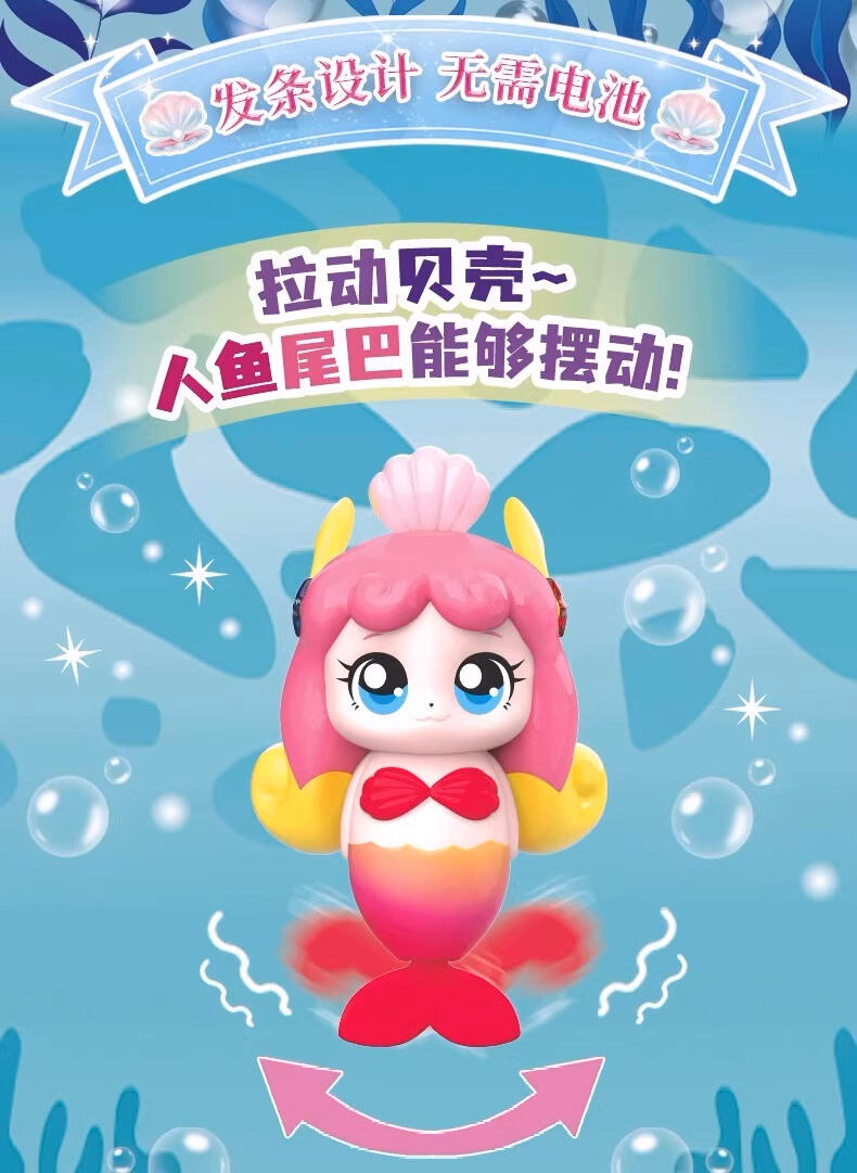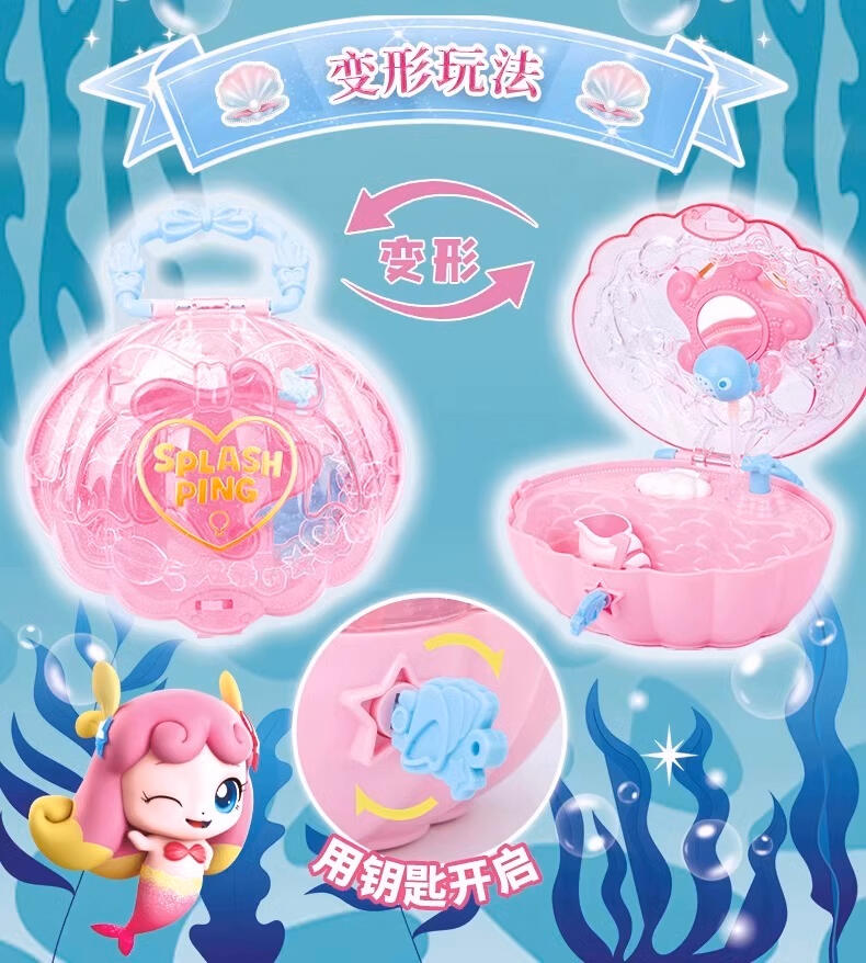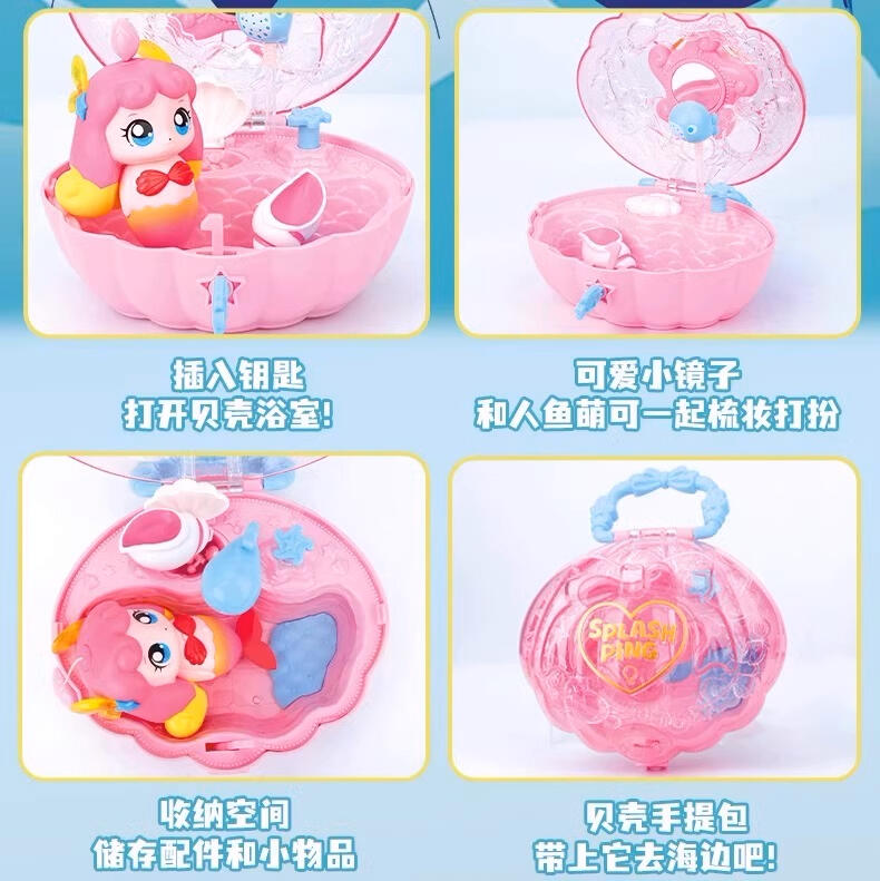 ①可以加水一起玩的浴室玩具,鲸鱼水龙头可喷水 ②拉出人鱼萌可尾巴,尾巴摆动并自动回缩,推动人鱼萌可在水里游动 ③搭配沐浴露洗发水小配件,模拟人鱼萌可洗澡 ④配海螺水枪,挤压吸水、喷水 ⑤盖上盖子,可爱包包造型。可收纳小物件。