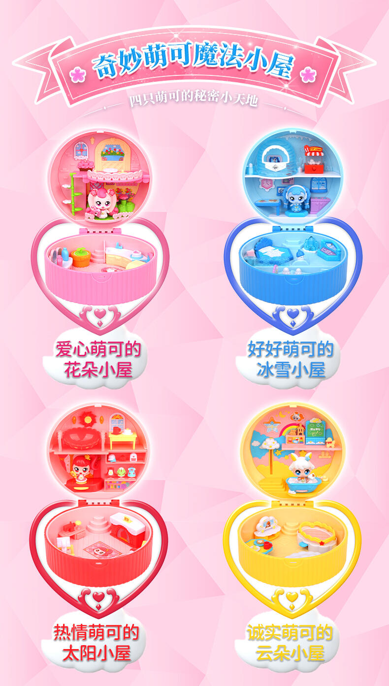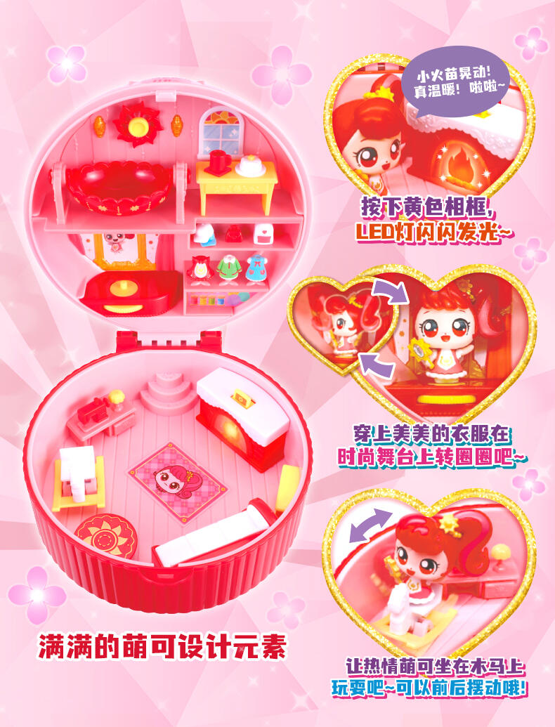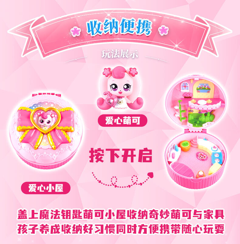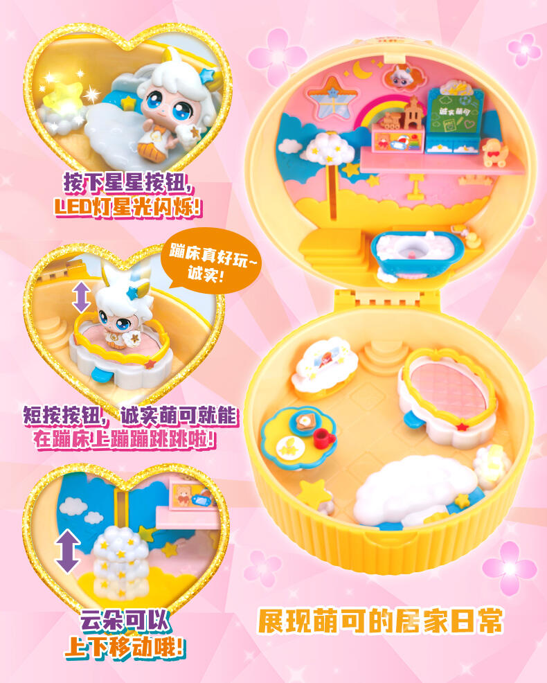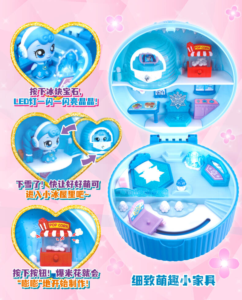 【产品配置】:萌可公仔*1,小屋宝盒场景*1 ①带灯效的温馨小屋场景,出厂带电池。 ②小宝盒内有大世界,雪人会旋转、雪橇跑起来……轨道机关、弹簧按键、趣味旋钮等互动小机关,冰雕房子、冰雪王座、雪花床、餐桌、喷香爆米花等丰富细节,十分好玩!和萌可快乐过家家吧。 ③合起是精美宝盒,可作为收纳盒、首饰盒。
