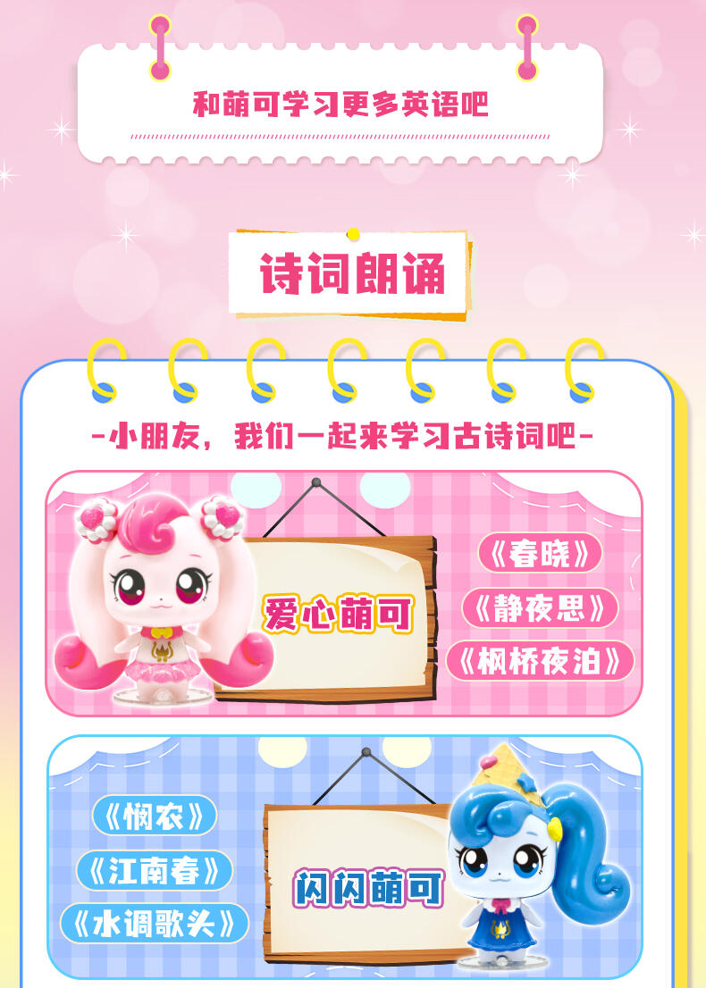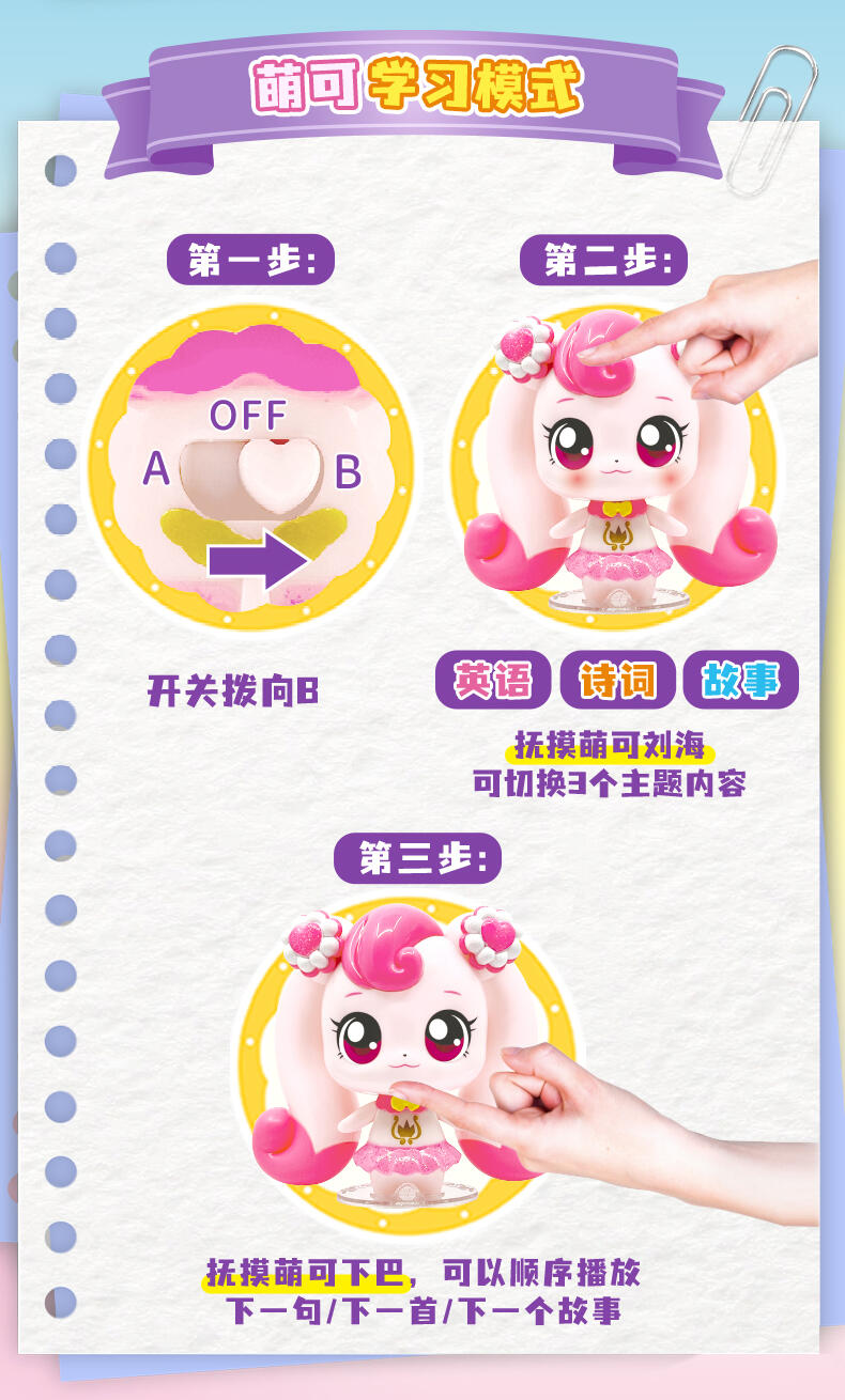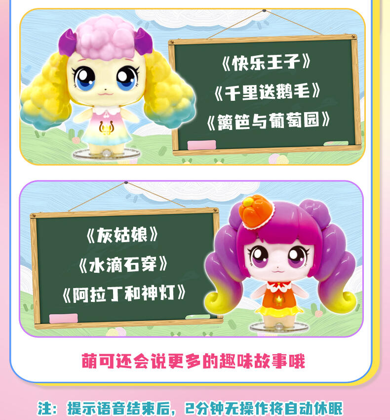 【产品配置】:闪闪萌可故事机*1、底座*1 ①形象升级,更大尺寸公仔,精致还原动画形象,搭配固定底座。 ②约100分钟语音陪伴,专属萌可语音和故事。 ③触摸式交互设计,触摸刘海选择内容,触摸下巴播放语音。 ④内置萌可小课堂,包含英语、成语、童话、古诗词等丰富内容。