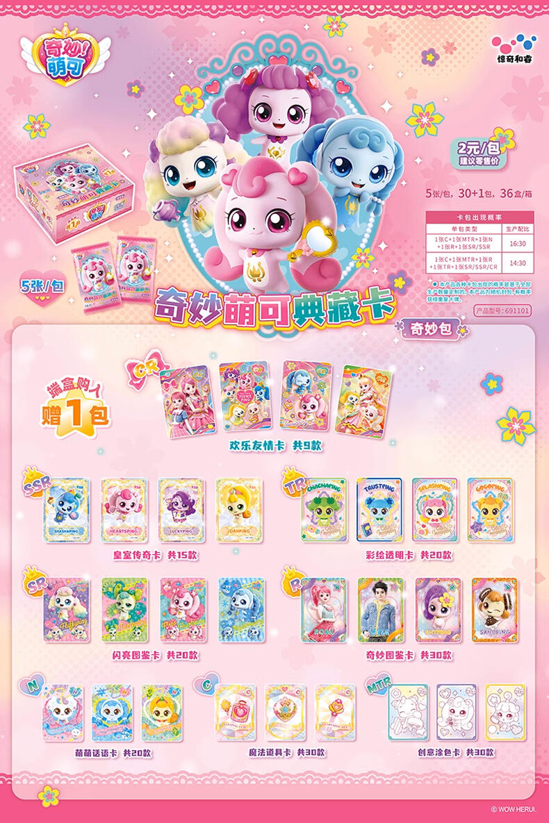 【产品配置】:1PDQ=31包(其中1包为赠品);1包=5张 【卡种说明】:全套共8个卡种:MTR卡-创意涂色卡、C卡-魔法道具卡 、N卡-萌萌头像卡、R卡-奇妙图鉴卡、SR卡-闪亮图鉴卡、TR卡-彩绘透明卡、SSR卡-皇室传奇卡、CR卡-欢乐友情卡。 【工艺介绍】:MTR卡是特别设计的涂色卡,可供消费者自由绘画;TR卡为PVC透卡材质,柔软耐磨,特别适合DIY成为挂件;C\R\SR卡搭配闪亮光柱、星型、爱心镭射膜,夺目四射,搭载丰富萌可图鉴资料,粉丝必 备;SSR\CR卡是特种闪卡材质,搭配分层工艺,极具收藏价值,其中CR卡更使用了亮色烫金技术,使用标志性的彩虹卡背图案彰显尊贵珍稀!