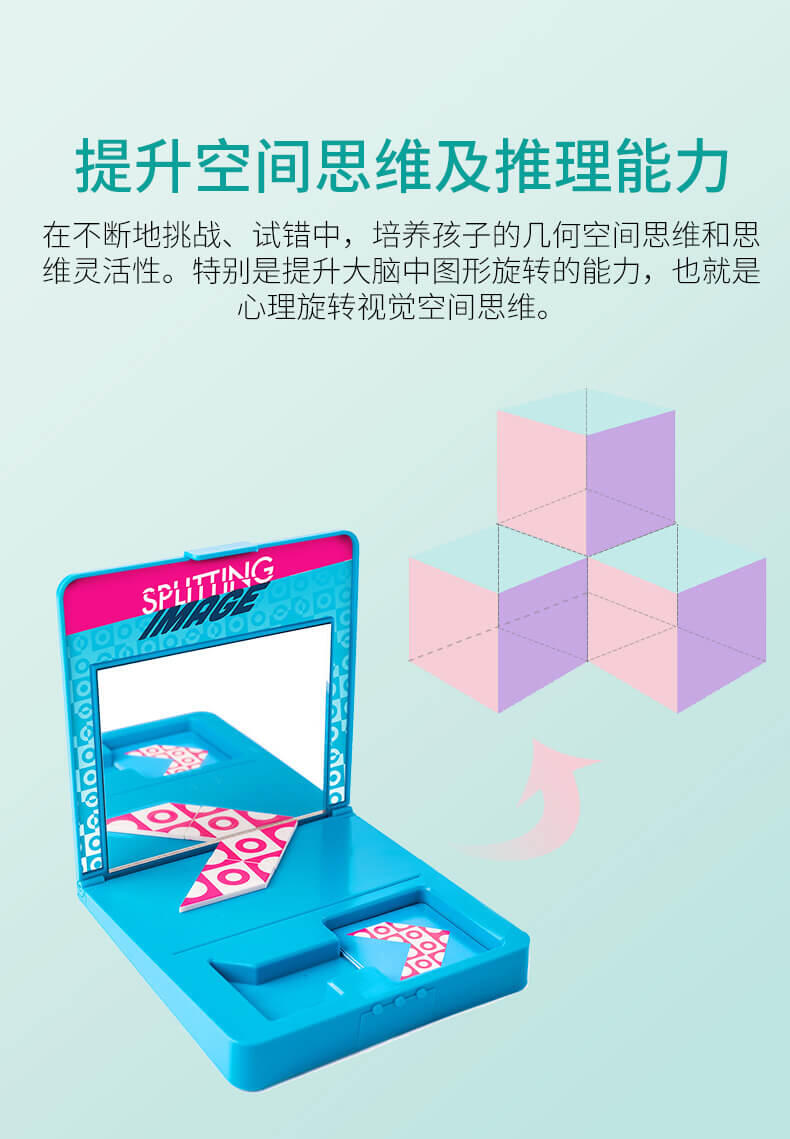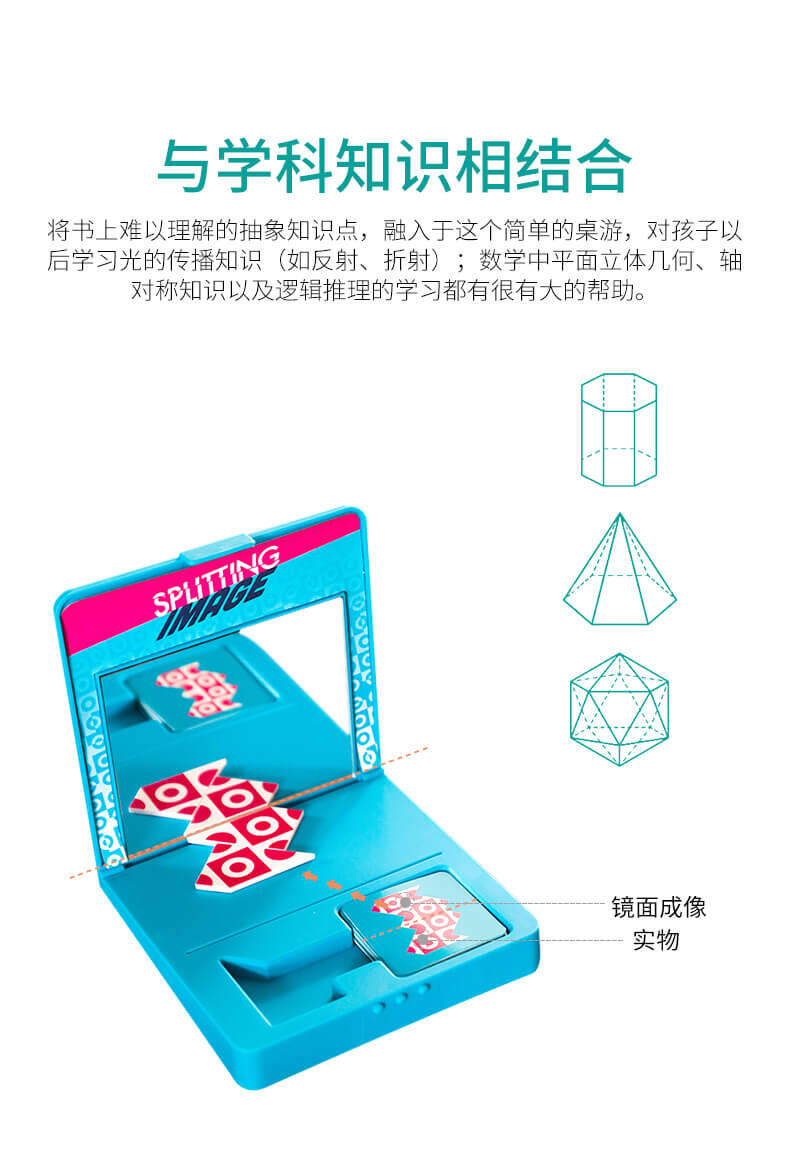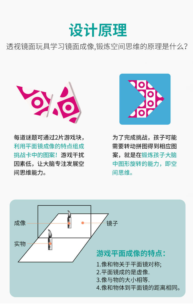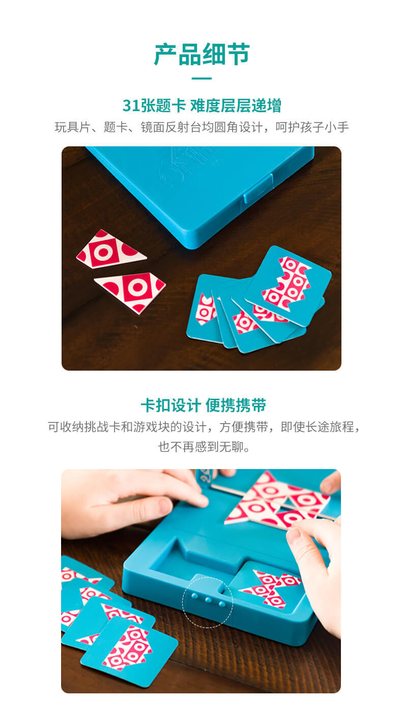 透视镜面是一款锻炼儿童视觉空间思维的游戏。通过摆放两块几何游戏板的方向,使游戏板与镜子中所反射的图像所组成的图案,与挑战卡上显示的图案一致。提升专注力,训练视觉空间思维与问题解决能力,游戏内含多种难度挑战卡,精巧易携带,随时随地等你来挑战!