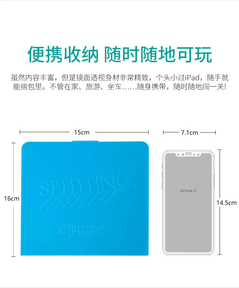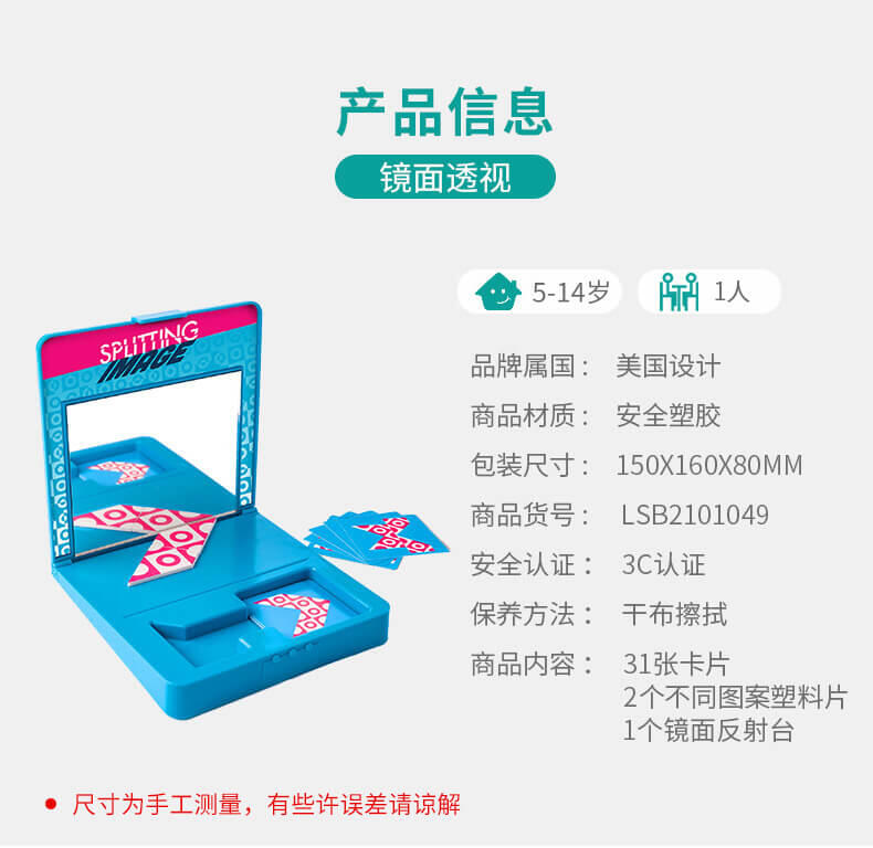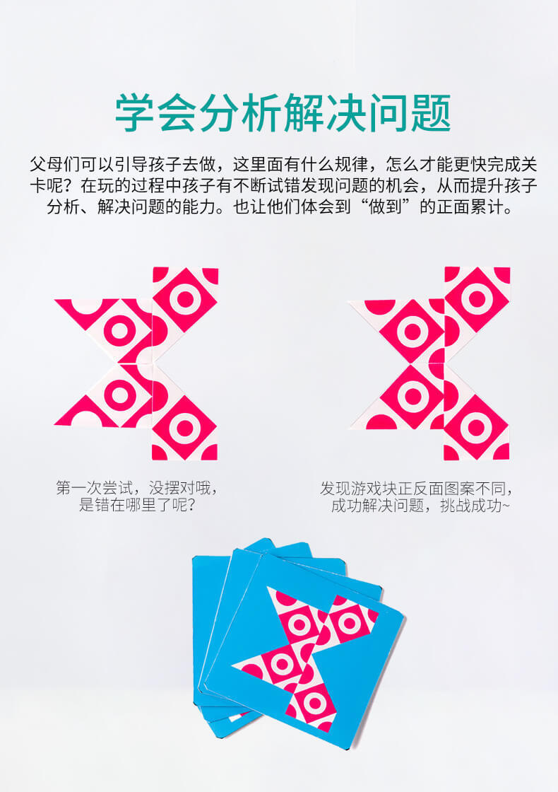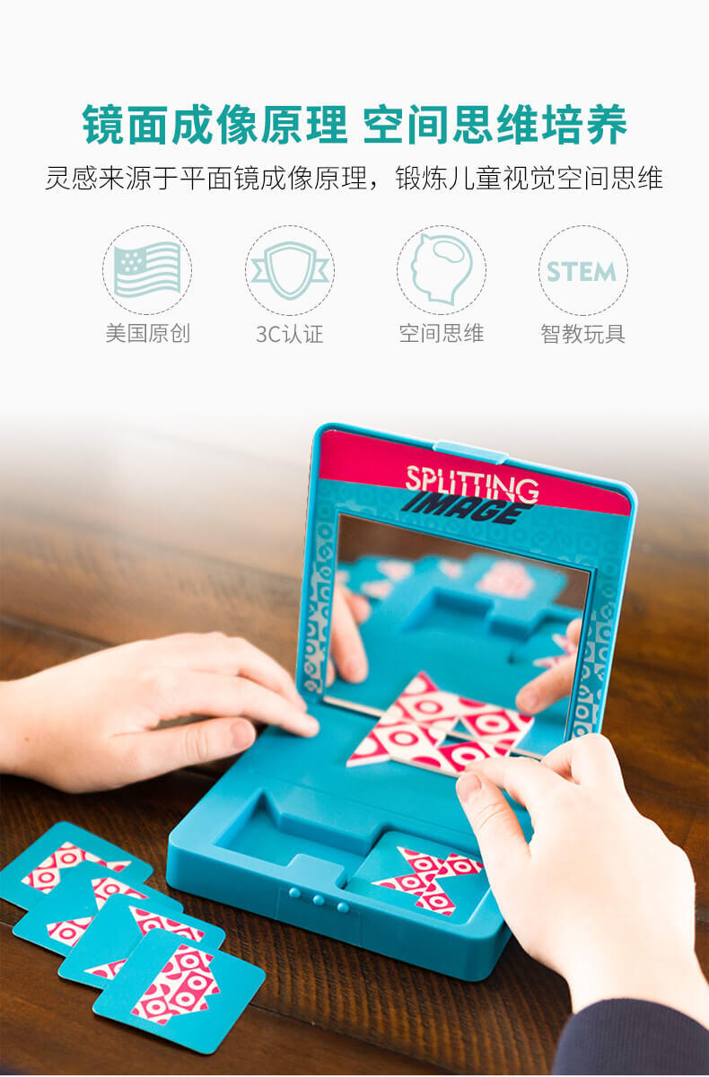 透视镜面是一款锻炼儿童视觉空间思维的游戏。通过摆放两块几何游戏板的方向,使游戏板与镜子中所反射的图像所组成的图案,与挑战卡上显示的图案一致。提升专注力,训练视觉空间思维与问题解决能力,游戏内含多种难度挑战卡,精巧易携带,随时随地等你来挑战!