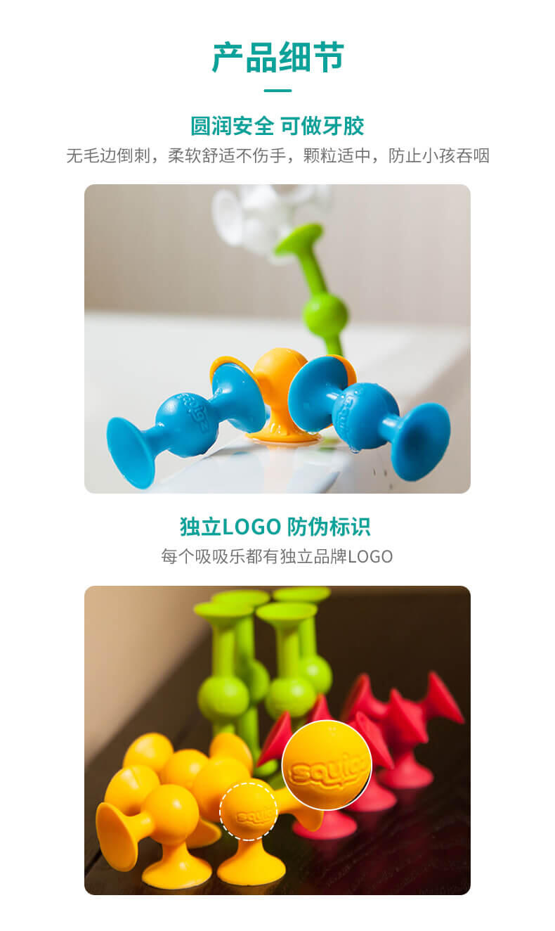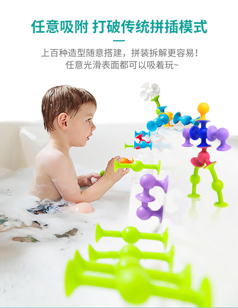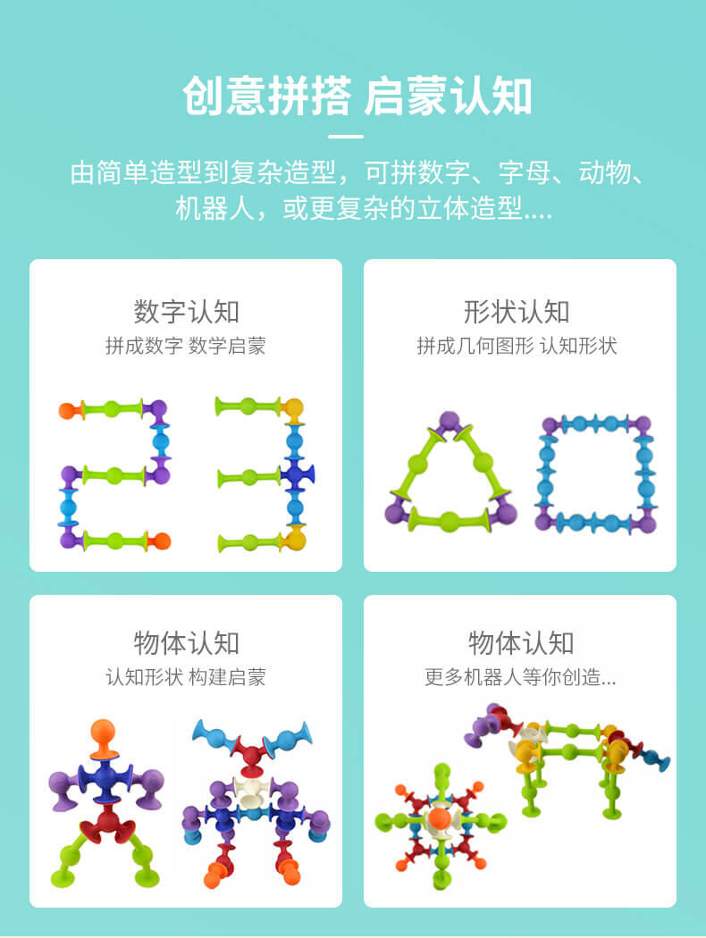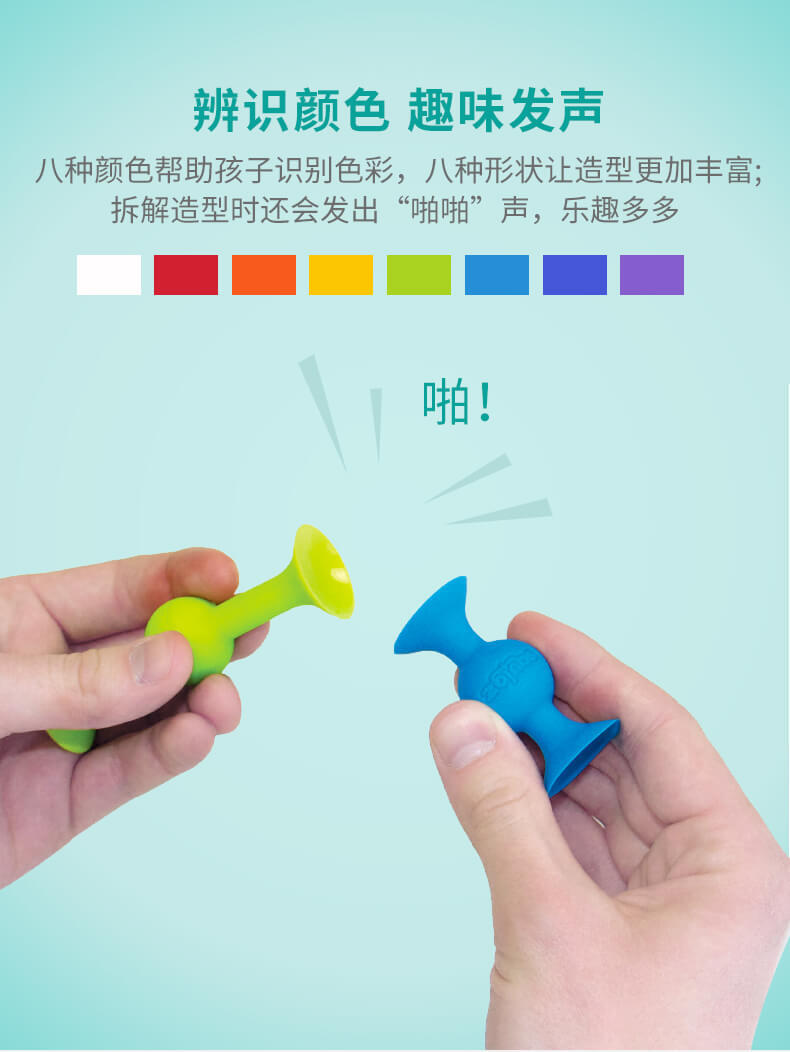 24支吸吸乐是一款硅胶积木,它区别于传统的拼插积木,每个硅胶吸盘相互之间通过挤压凹面的空气可以牢牢地吸附在一起,吸吸乐还可以吸附在任何光滑的平面上,搭建成各种不同的平面图形、空间立体图形、几何图形等。