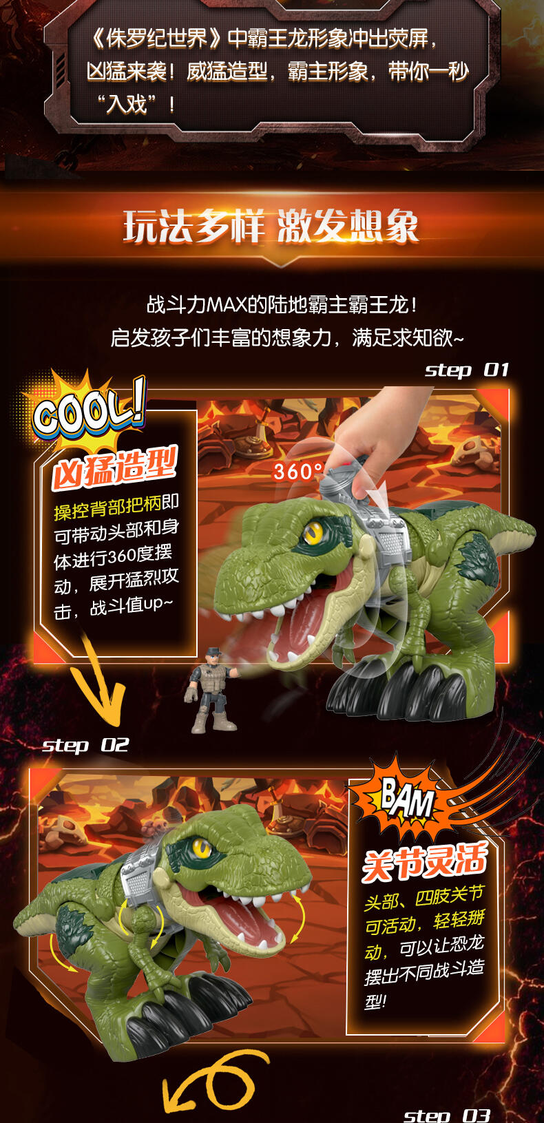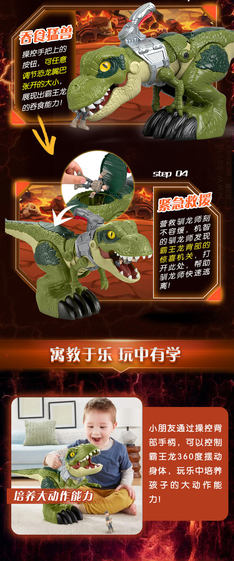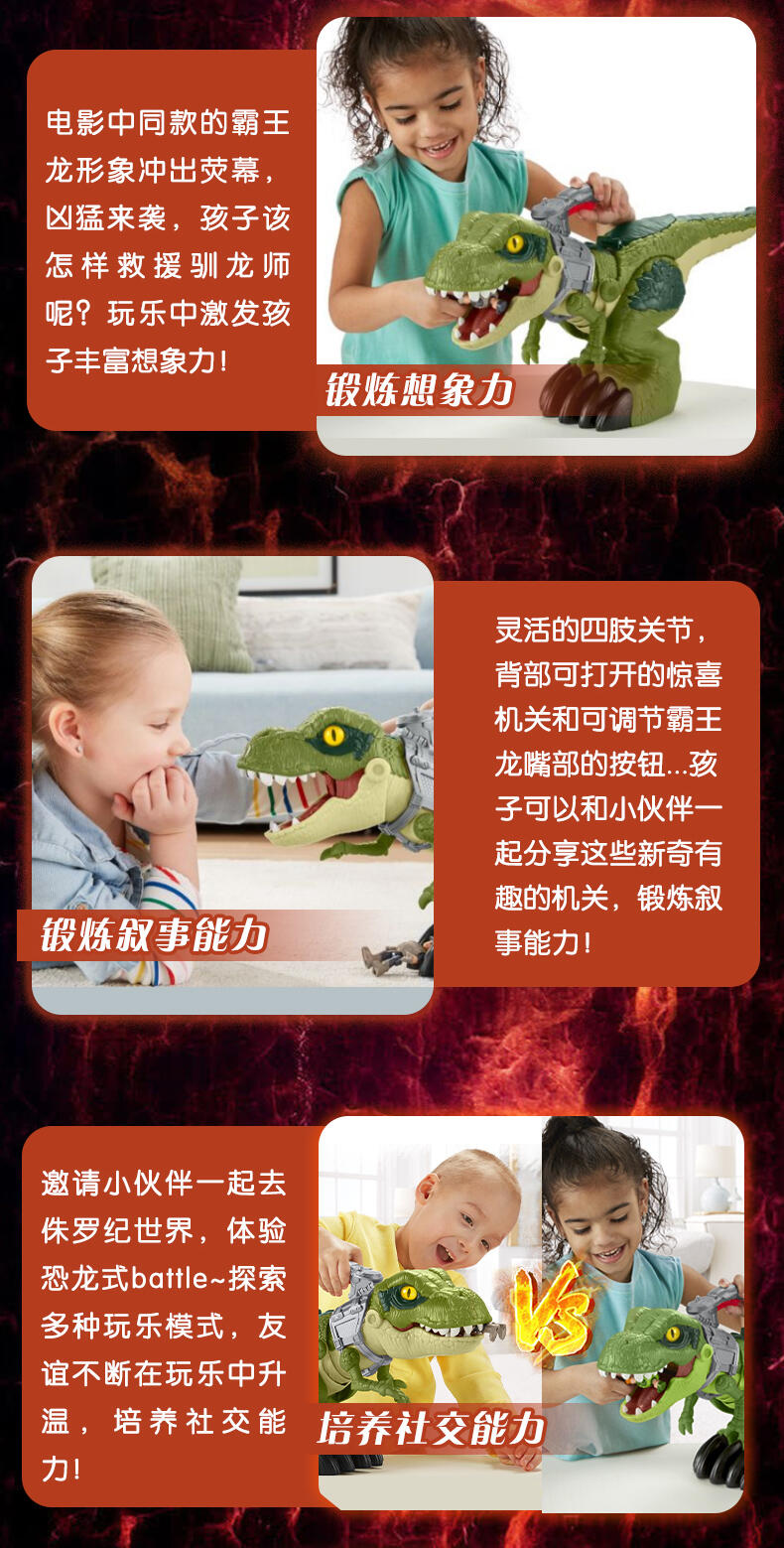 孩子们用手柄控制激动人心的动作,恐龙猛冲、咬、吞下她的整个猎物!