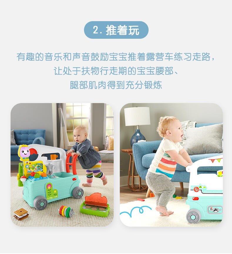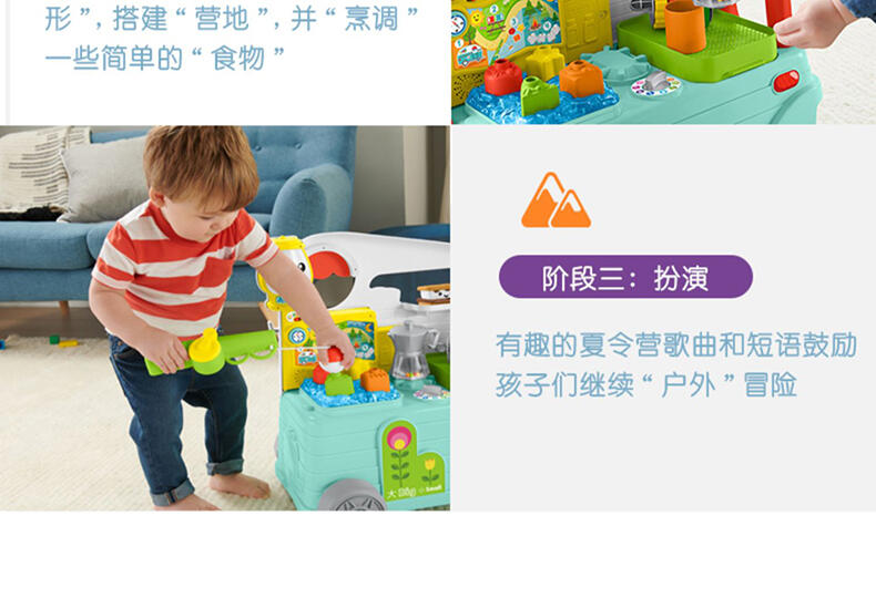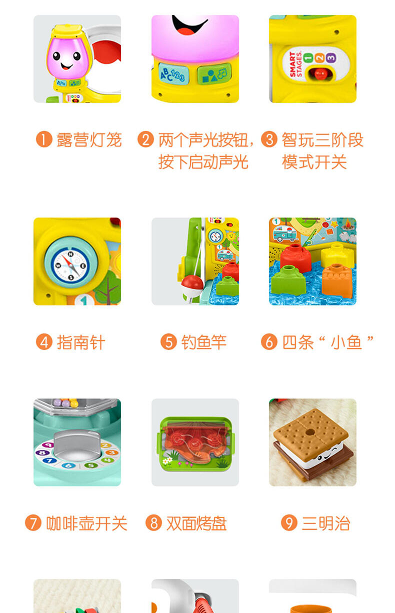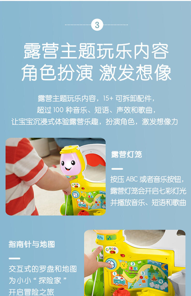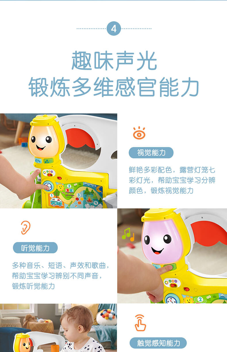 三种玩法,从坐着玩到推着学步车再到站着玩的游戏中心,陪伴宝宝一起长大!推车手柄,帮宝宝迈出学走第一步! 三阶段学习模式,提供三种等级的学习内容,循序渐进地学习英语、形状、颜色、物件和歌曲等。露营主题玩乐内容,15+可拆卸的部件,超过90种音乐、短语、声效和歌曲,让宝宝沉浸式体验露营的乐趣,帮助宝宝发展精细动作、激发想象力!按压ABC或音乐按钮,露营灯笼会开启七彩的灯光并开启音乐、短语和歌曲。