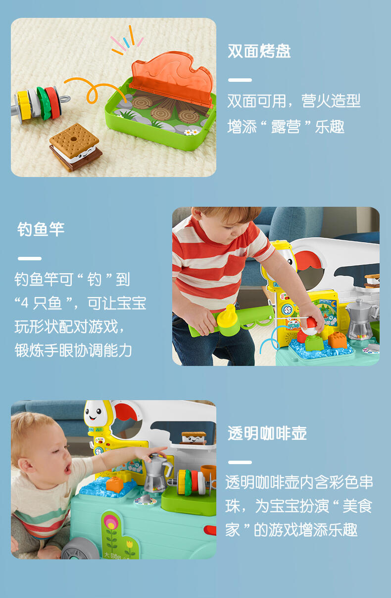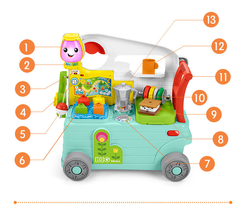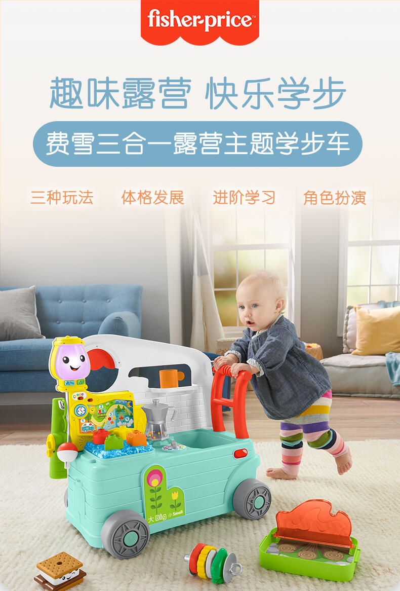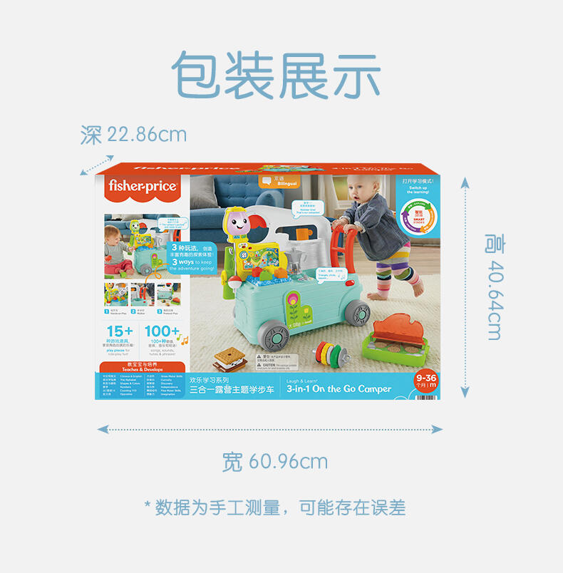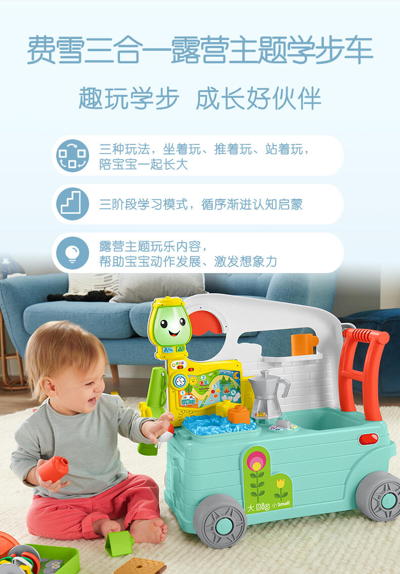 三种玩法,从坐着玩到推着学步车再到站着玩的游戏中心,陪伴宝宝一起长大!推车手柄,帮宝宝迈出学走第一步! 三阶段学习模式,提供三种等级的学习内容,循序渐进地学习英语、形状、颜色、物件和歌曲等。露营主题玩乐内容,15+可拆卸的部件,超过90种音乐、短语、声效和歌曲,让宝宝沉浸式体验露营的乐趣,帮助宝宝发展精细动作、激发想象力!按压ABC或音乐按钮,露营灯笼会开启七彩的灯光并开启音乐、短语和歌曲。