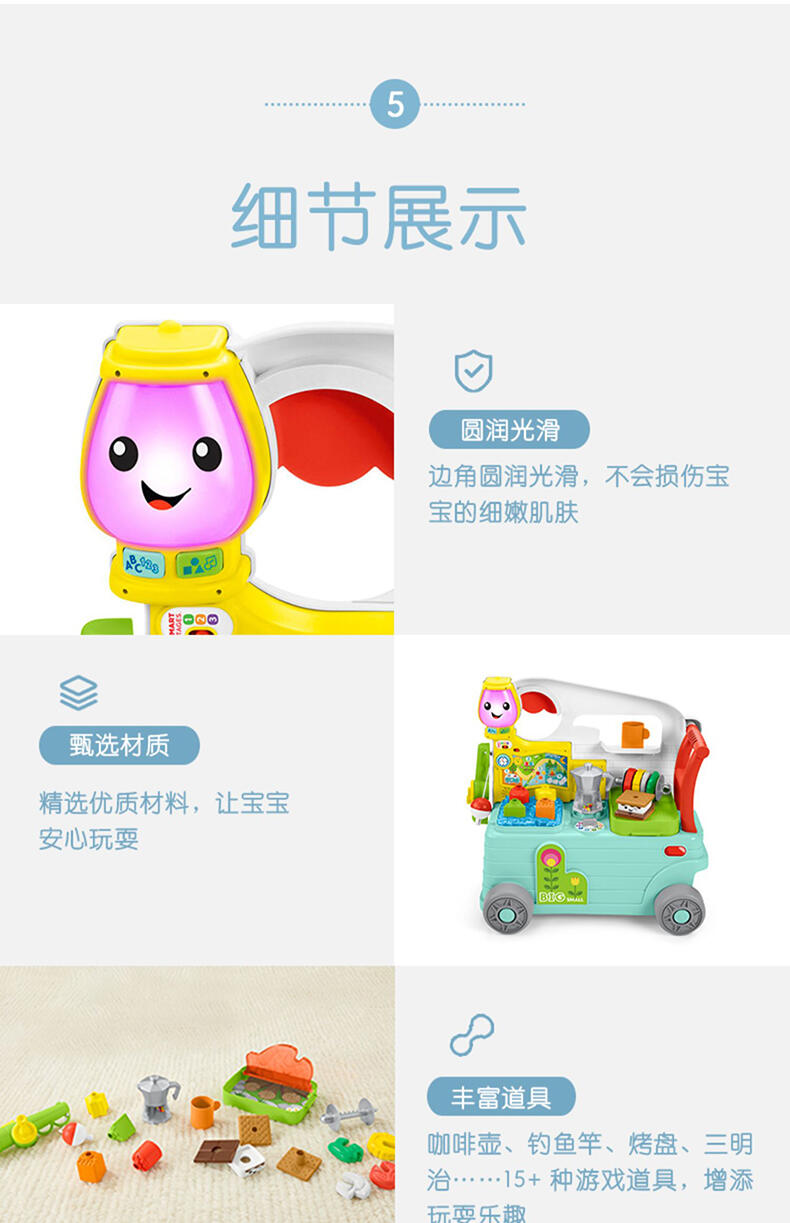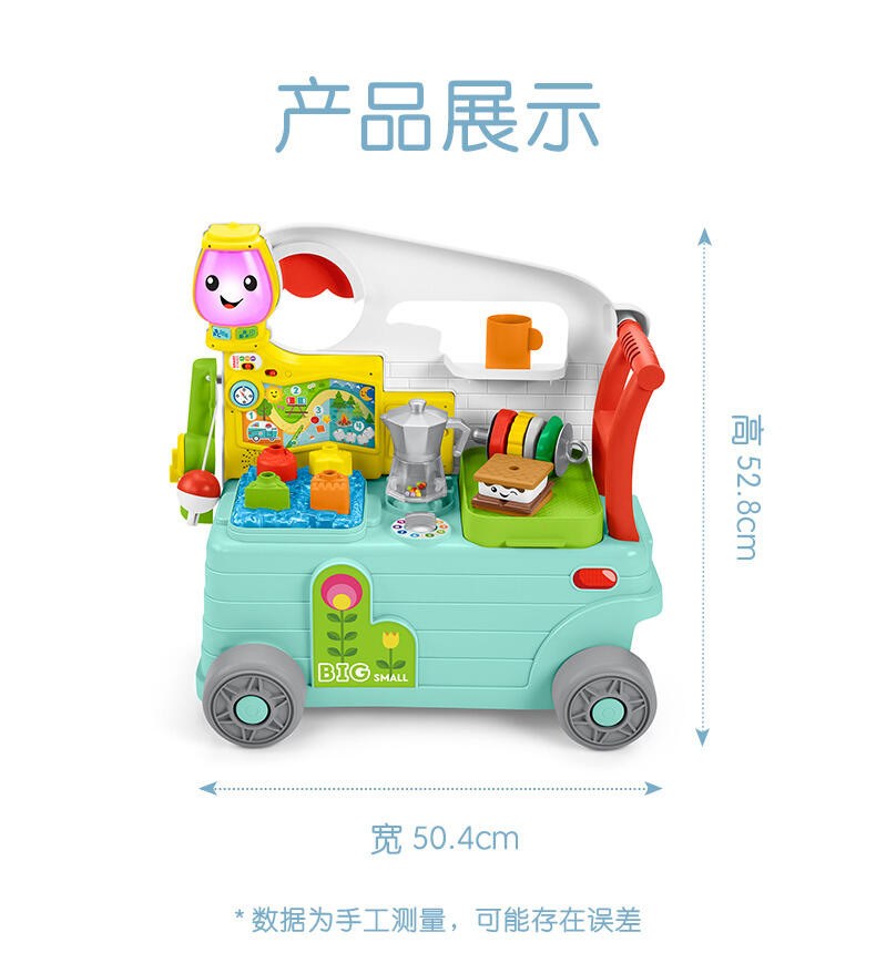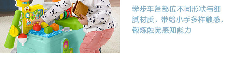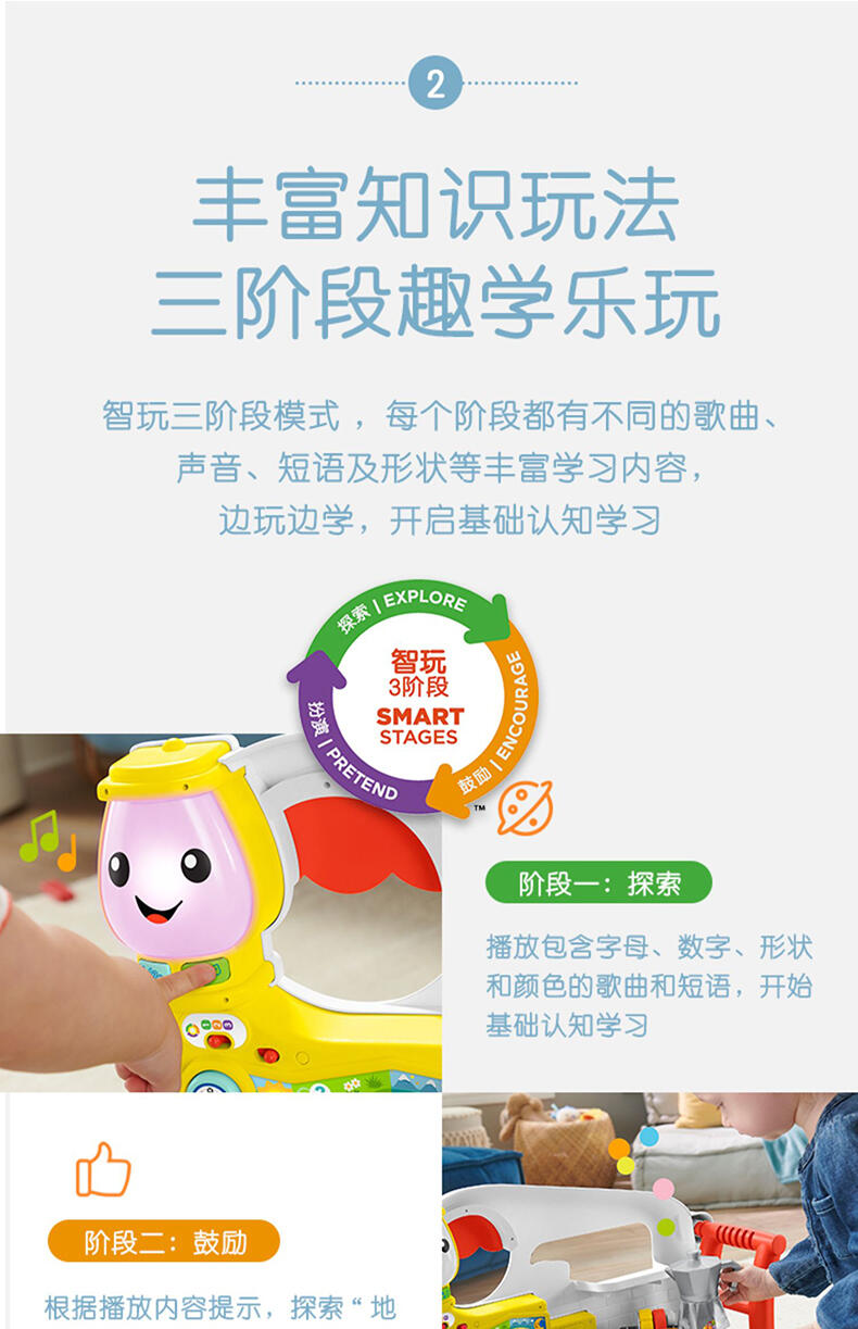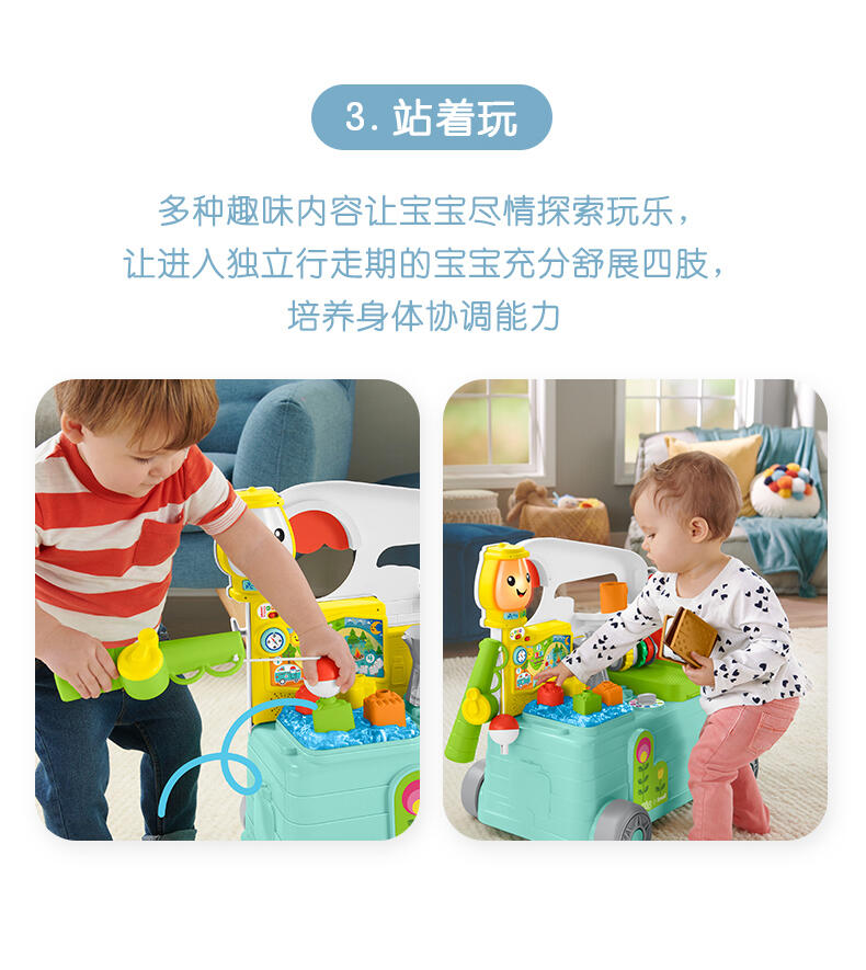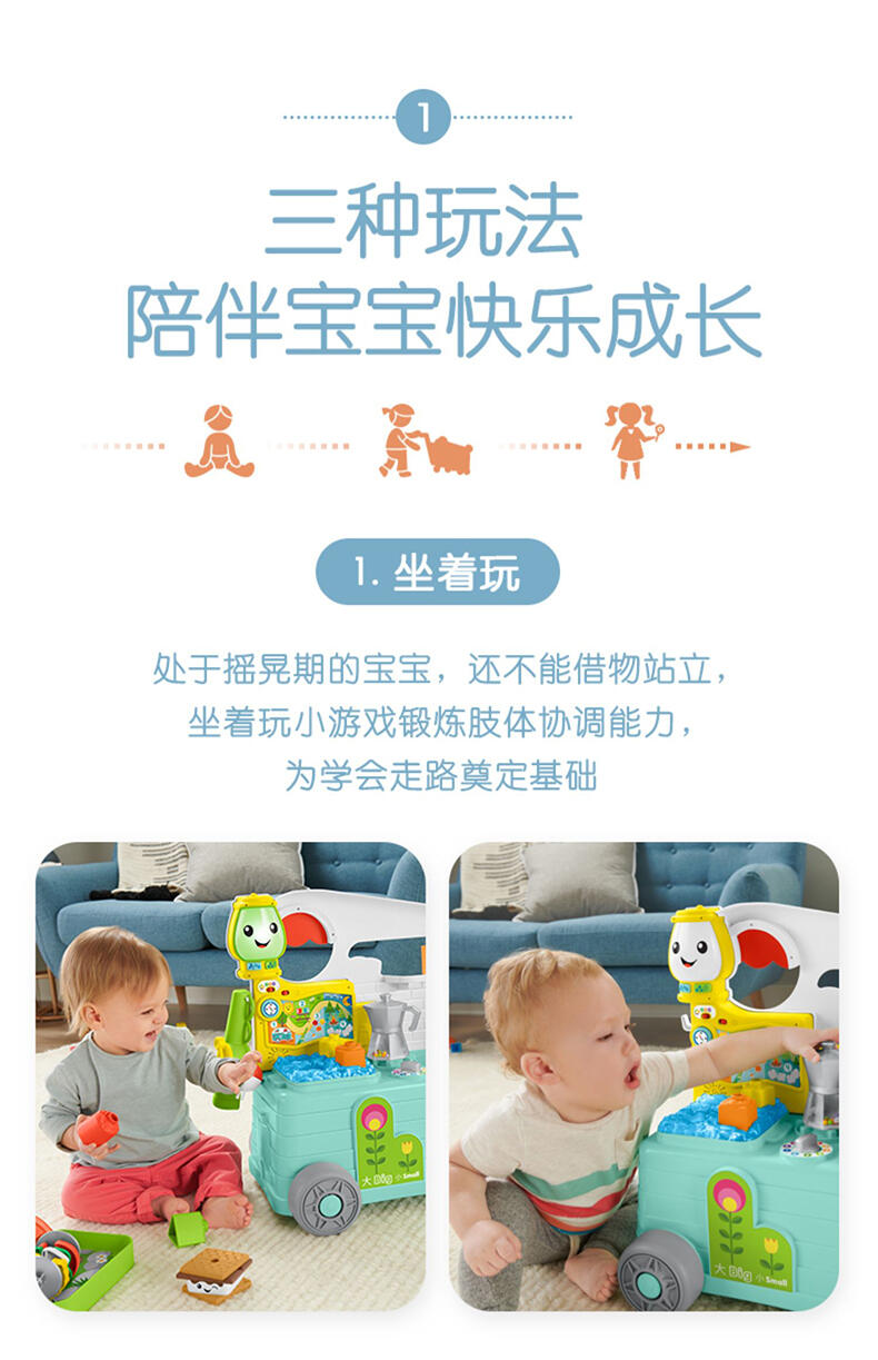 三种玩法,从坐着玩到推着学步车再到站着玩的游戏中心,陪伴宝宝一起长大!推车手柄,帮宝宝迈出学走第一步! 三阶段学习模式,提供三种等级的学习内容,循序渐进地学习英语、形状、颜色、物件和歌曲等。露营主题玩乐内容,15+可拆卸的部件,超过90种音乐、短语、声效和歌曲,让宝宝沉浸式体验露营的乐趣,帮助宝宝发展精细动作、激发想象力!按压ABC或音乐按钮,露营灯笼会开启七彩的灯光并开启音乐、短语和歌曲。
