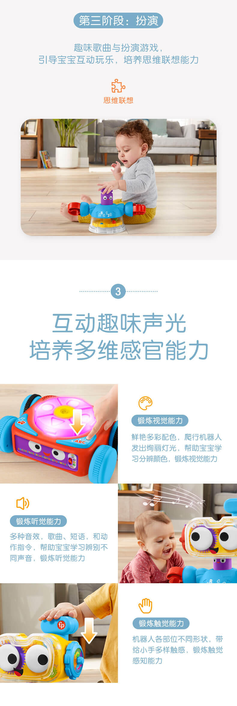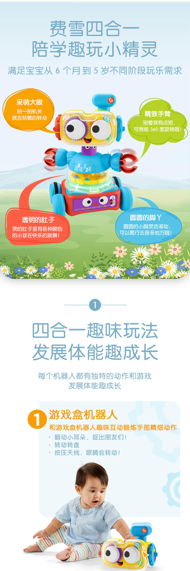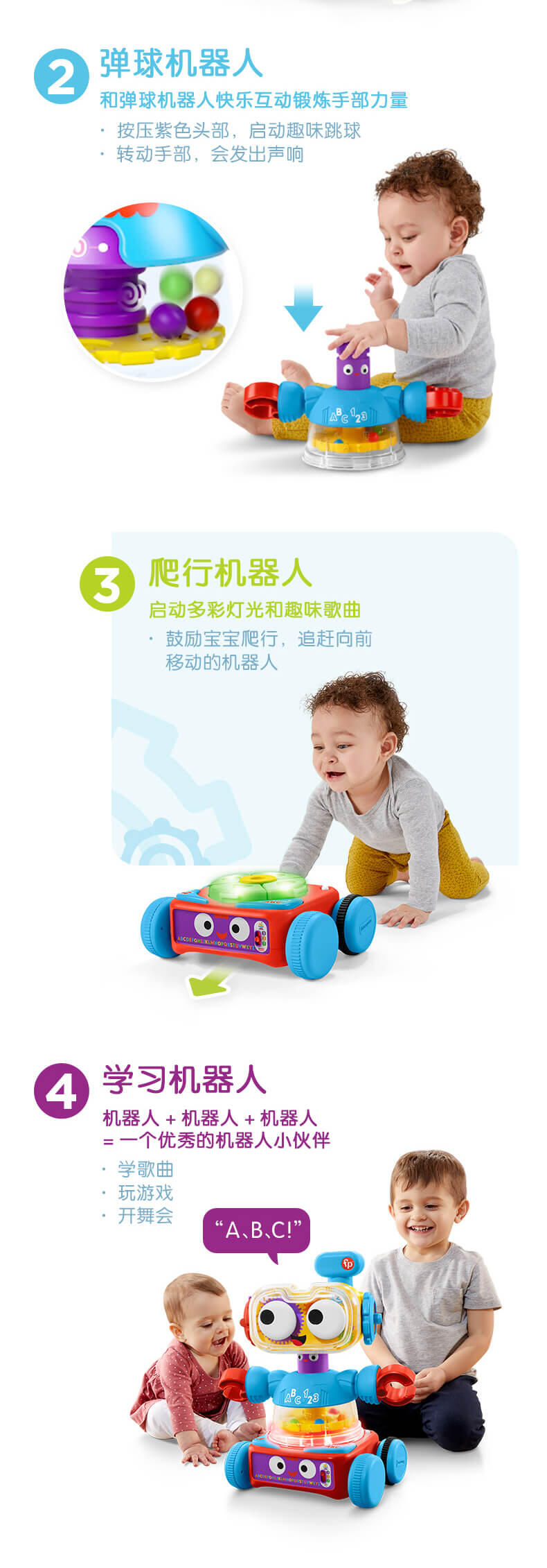 拆分三个独立机器人,游戏盒机器人锻炼宝宝手指精细动作;弹球机器人助力宝宝成长有力量;爬行机器人鼓励宝宝爬行