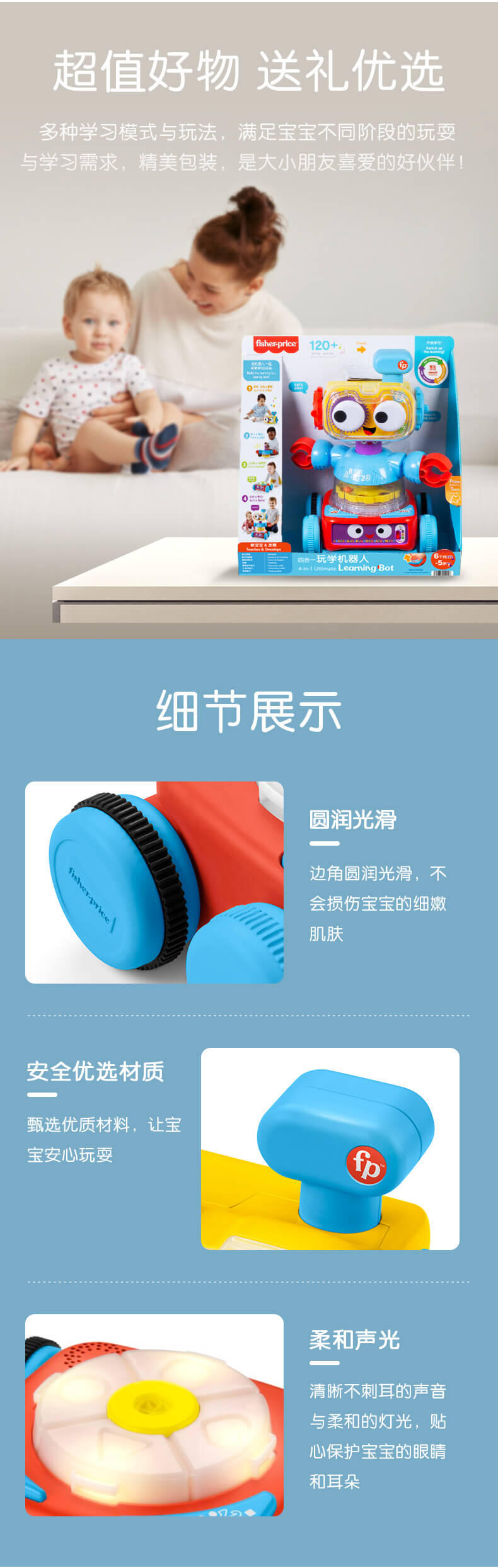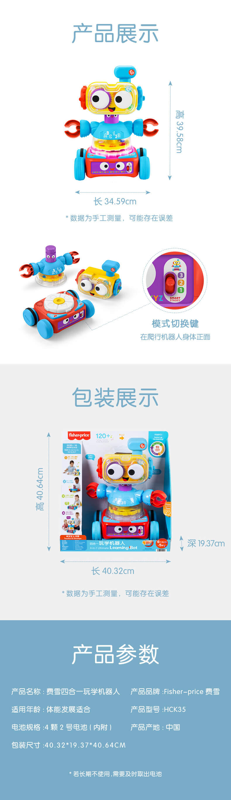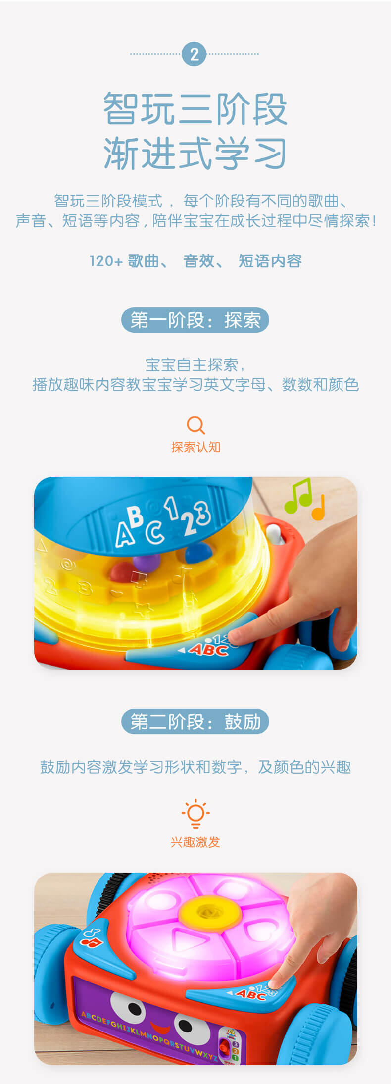 拆分三个独立机器人,游戏盒机器人锻炼宝宝手指精细动作;弹球机器人助力宝宝成长有力量;爬行机器人鼓励宝宝爬行