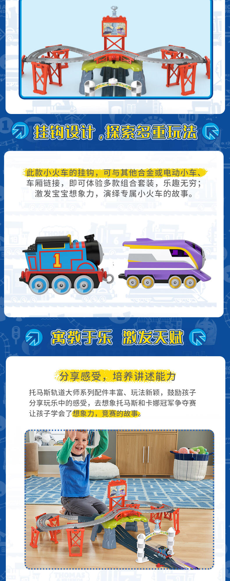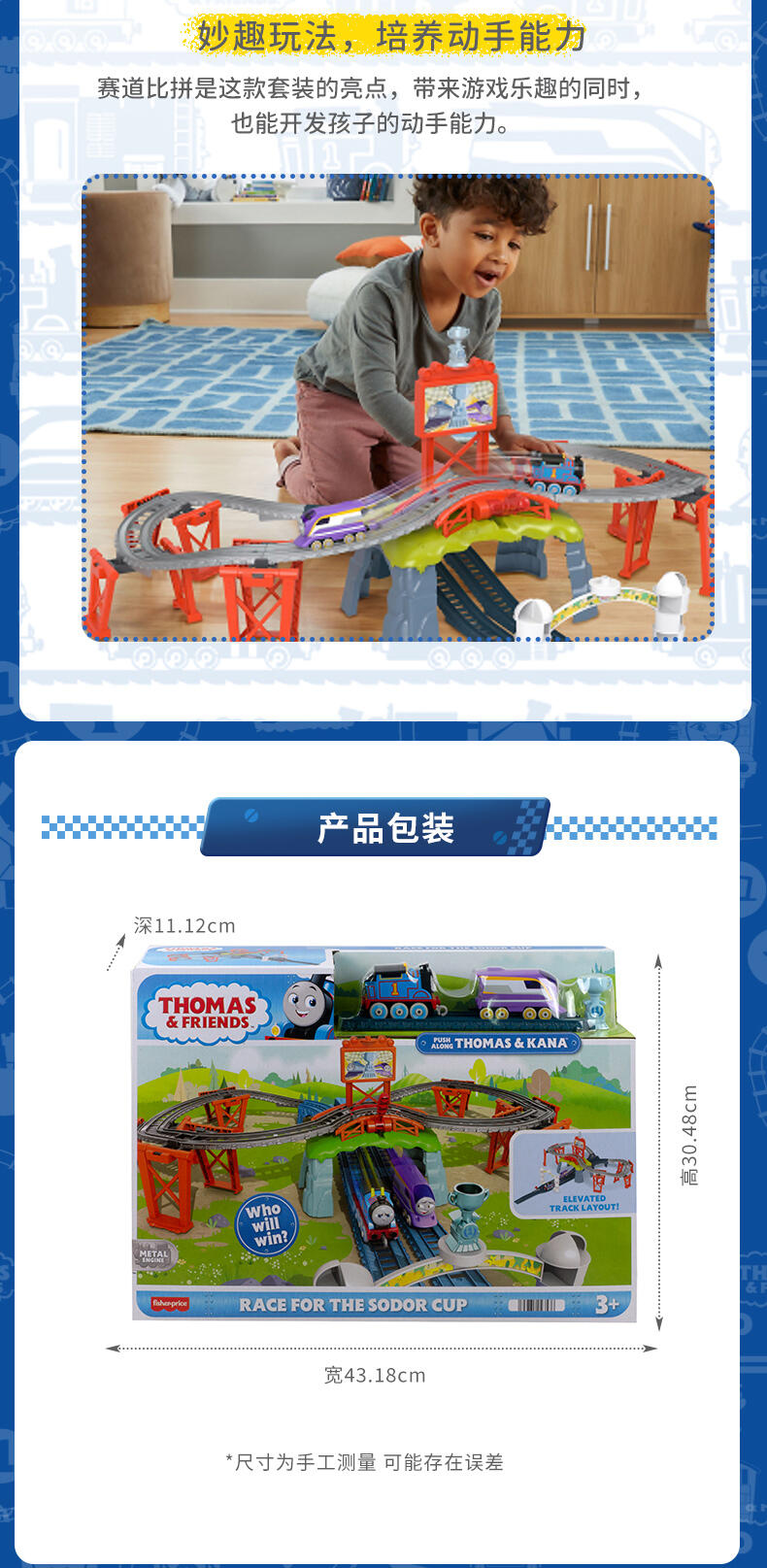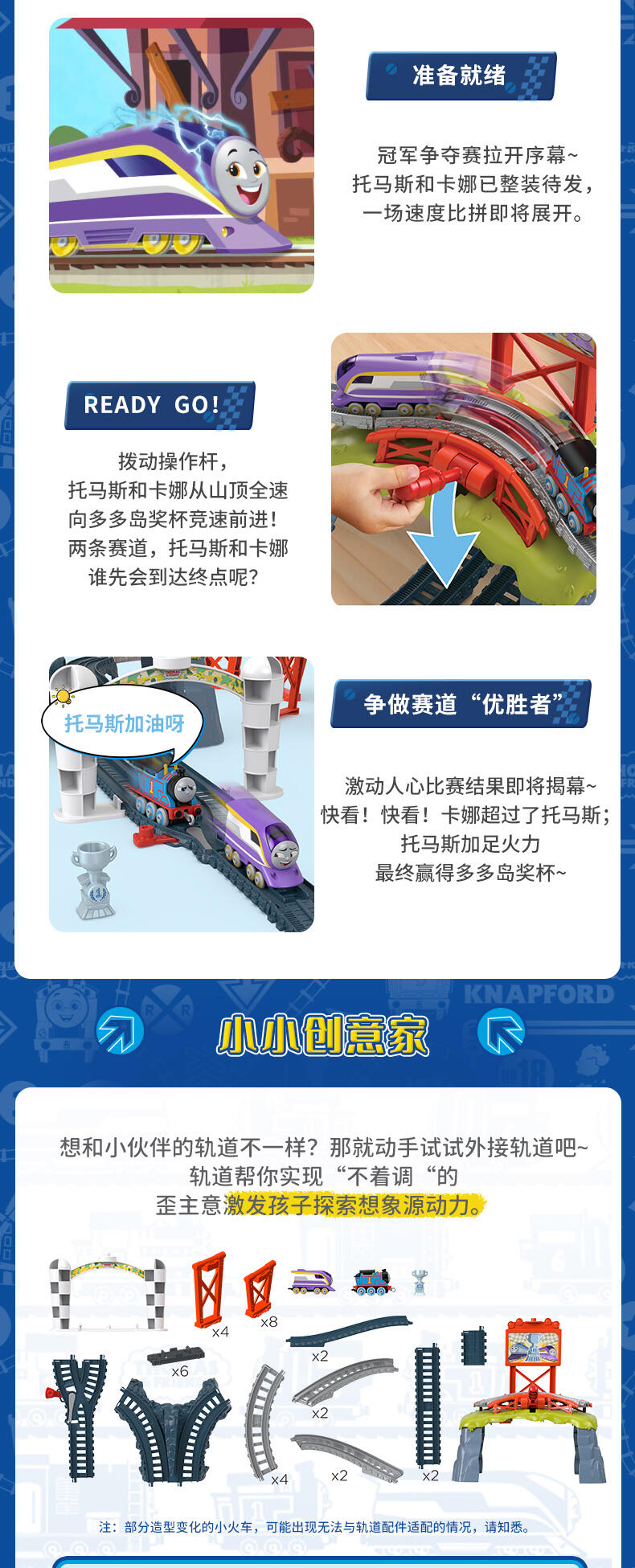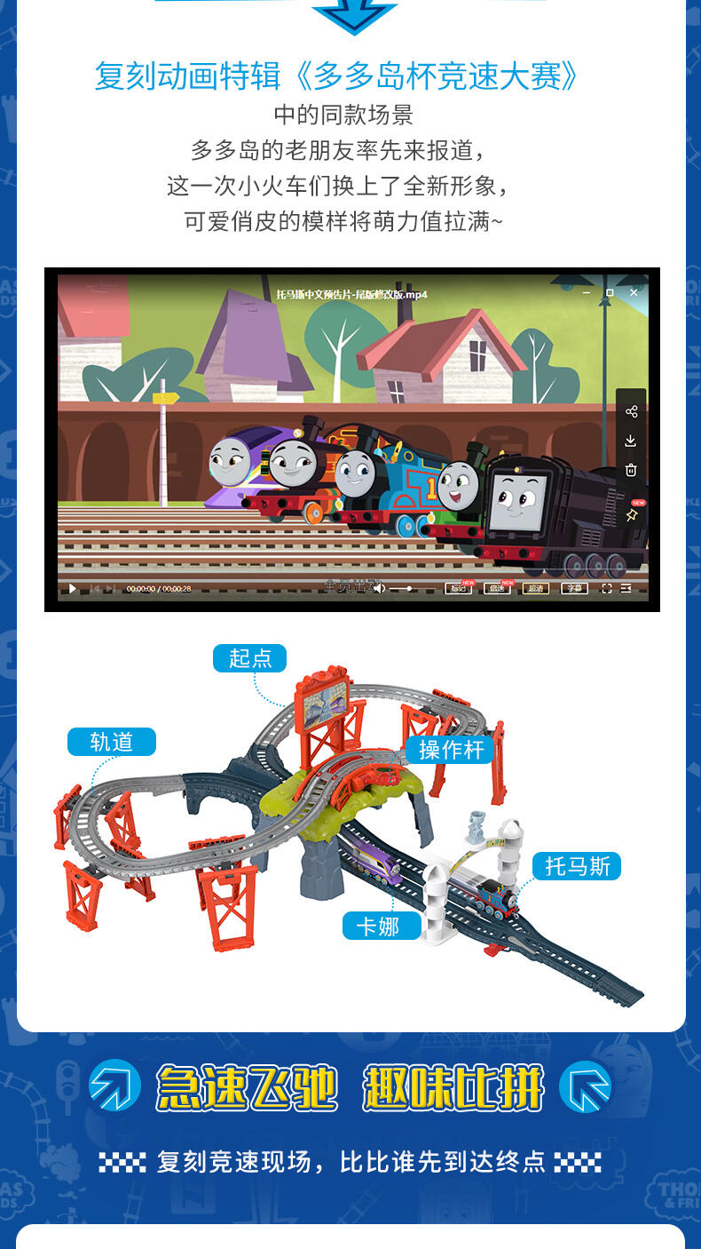 Thomas & Friends push-along 火车和轨道套装具有与 Thomas 和他的朋友面对面的赛车乐趣,Kana Kid 控制杆发送引擎沿着赛道向下冲向终点线以赢得 Sodor Cup 奖杯