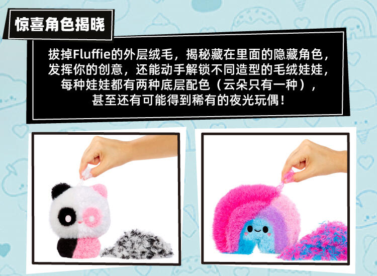 Fluffie三合一解压毛绒,结合了拆箱、收藏、ASMR和解压的乐趣。当你去除Fluffie的外层毛发,发现下面隐藏着什么时,你会有一种平静和舒缓的触觉体验。还有可能得到超稀有的夜光毛绒哦!