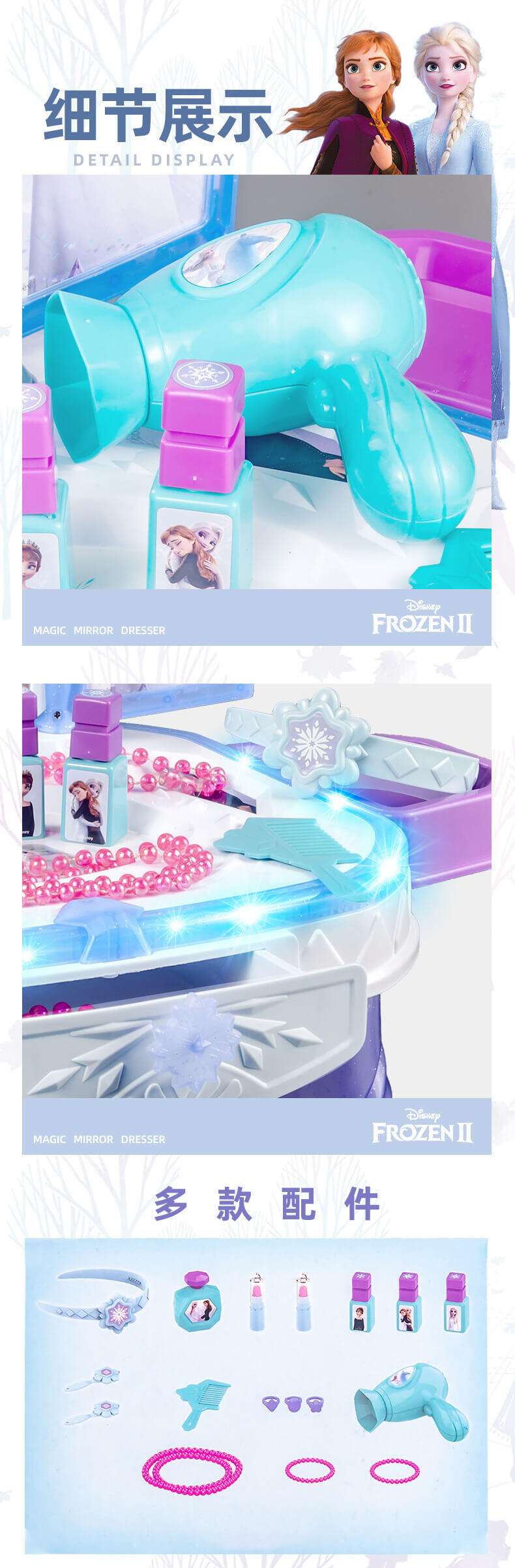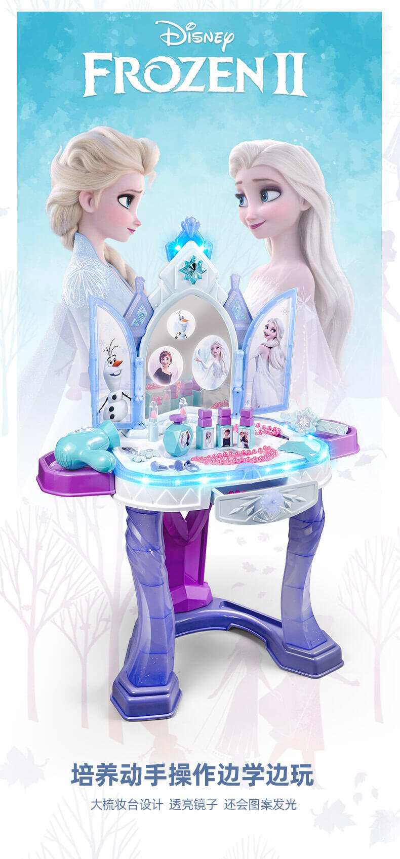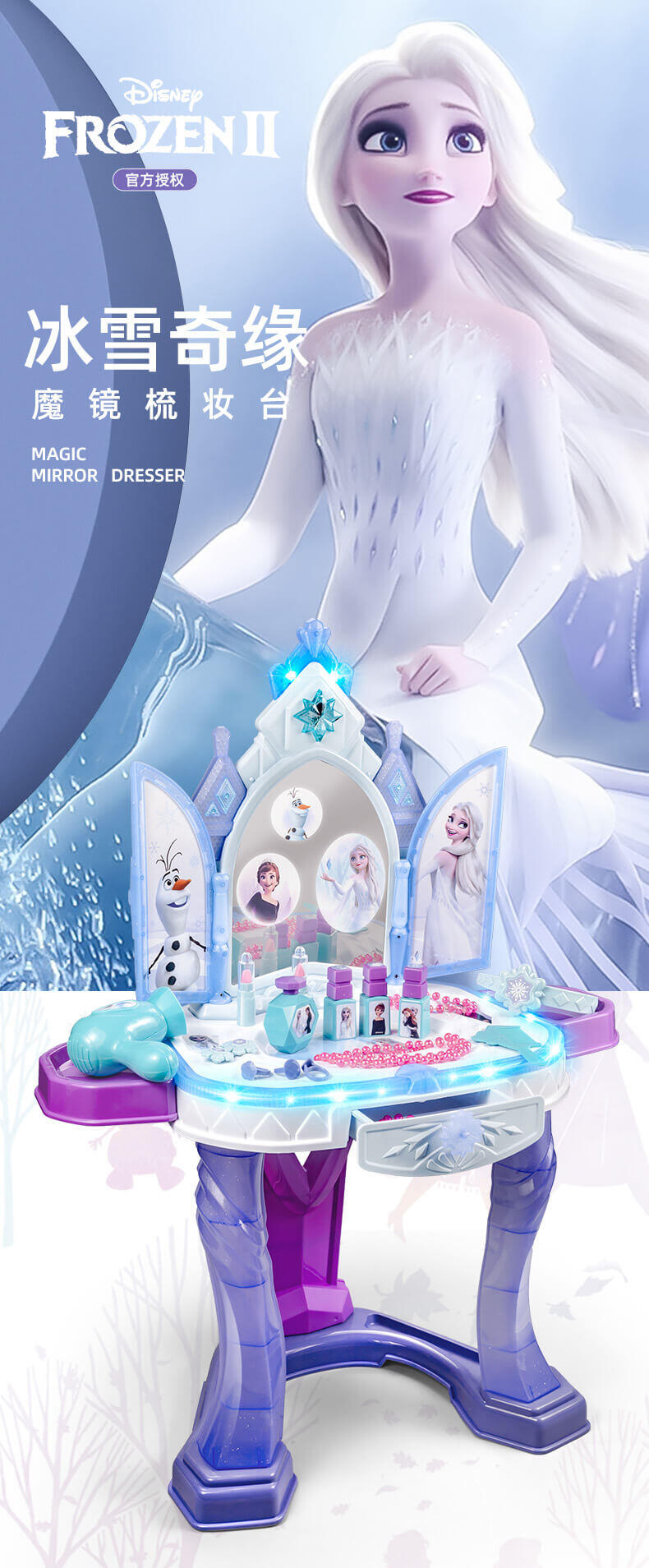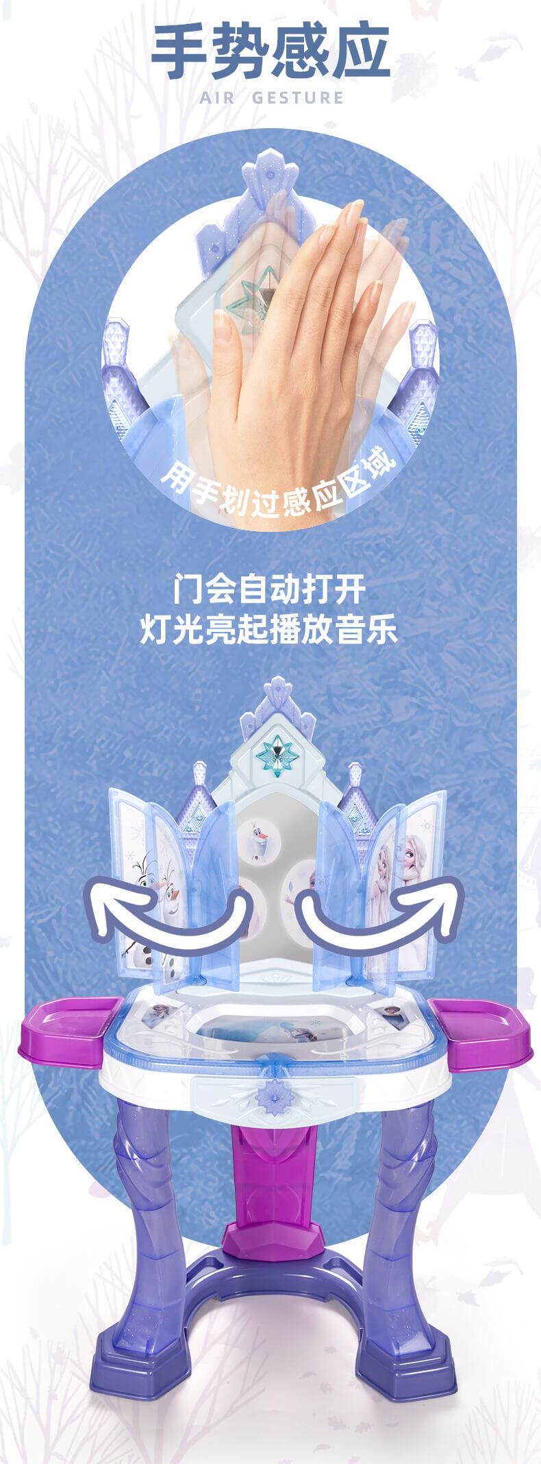 迪士尼冰雪奇缘魔镜梳妆台为角色扮演类梳妆台过家家玩具,产品配备丰富多样的化妆用品道具可结合生活经验开展化妆游戏,培养小朋友对美的认知及动手能力。产品具有电动开门功能,用手划过感应区域,镜子的门会自动打开,镜子里面会闪动出现公主图案,同时响起音乐,在镜子门打开的时候化妆台上的灯带也会坐伴随音乐亮起,当再次用手划过感应区域时,镜子门会自动闭合,音乐响起及桌面灯带闪烁后停止。产品魔镜功能让小朋友体验魔镜的场景,同时增添更多玩具乐趣。