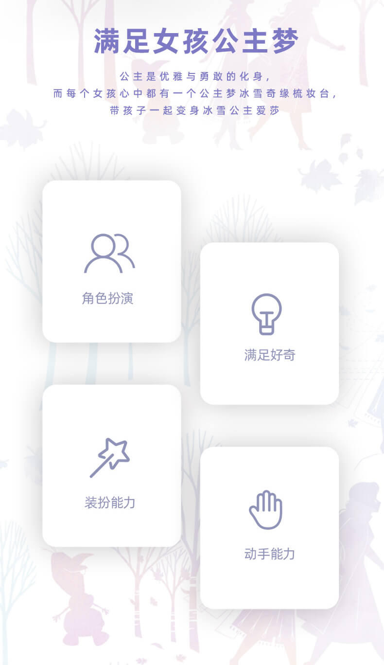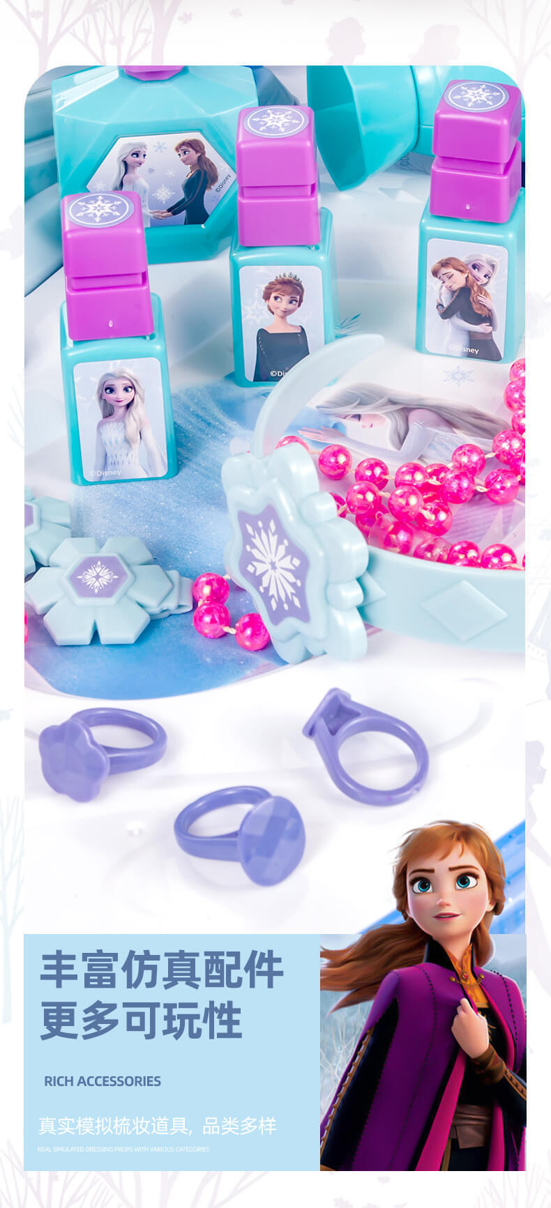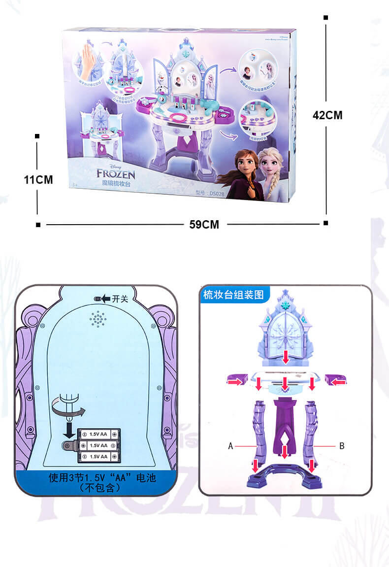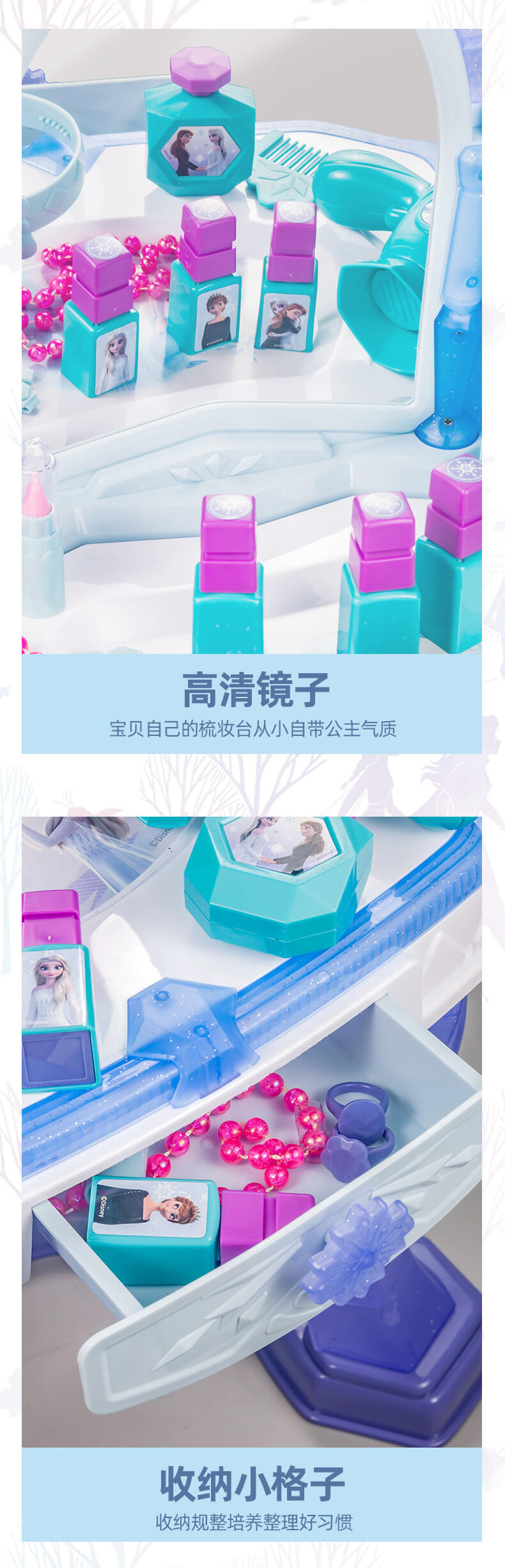 迪士尼冰雪奇缘魔镜梳妆台为角色扮演类梳妆台过家家玩具,产品配备丰富多样的化妆用品道具可结合生活经验开展化妆游戏,培养小朋友对美的认知及动手能力。产品具有电动开门功能,用手划过感应区域,镜子的门会自动打开,镜子里面会闪动出现公主图案,同时响起音乐,在镜子门打开的时候化妆台上的灯带也会坐伴随音乐亮起,当再次用手划过感应区域时,镜子门会自动闭合,音乐响起及桌面灯带闪烁后停止。产品魔镜功能让小朋友体验魔镜的场景,同时增添更多玩具乐趣。