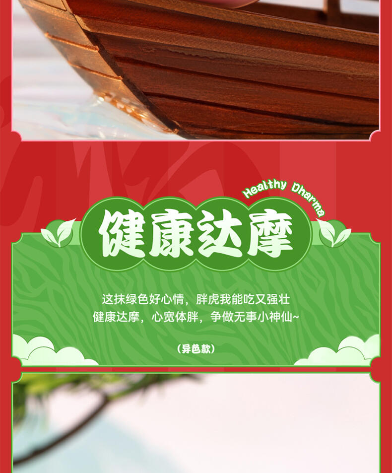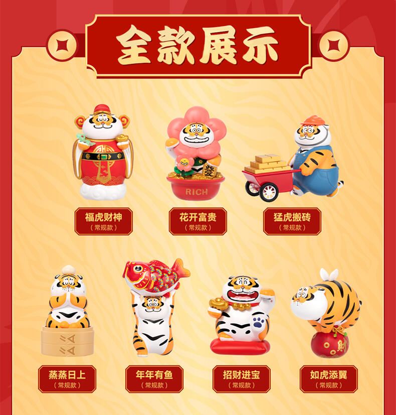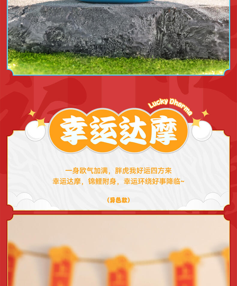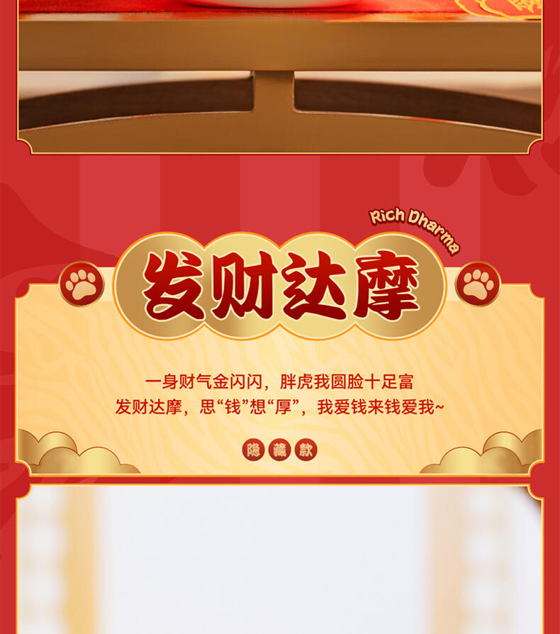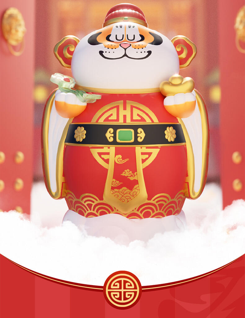1、正版授权:我不是胖虎正版授权,玩乐主义Funism出品。 2、产品形象:圆滚滚的胖虎换上喜庆招财装扮,多变的表情洋溢喜庆,传递好运,带来财气。 3、工艺材质:产品本体采用搪胶材质,搭配PVC配件,整体更轻便,环保无毒;表面光滑耐磨耐摔,触感细腻,色彩还原。 4、产品优势:1) 不同颜色的达摩隐藏款形象,分别代表不同领域的好运寓意,吸引消费者收集; 2) 产品自带好运寓意,符合当下求好运、玄学的消费心理。 5、功能属性: 1)可当桌搭摆件,增添好运招财的生活氛围; 2)带有招财送福的好运寓意,可作为好运礼物赠送亲友。