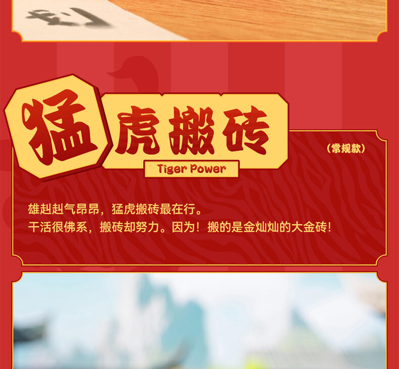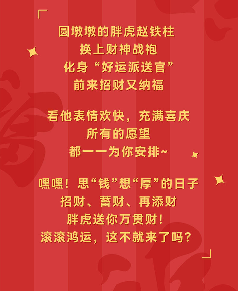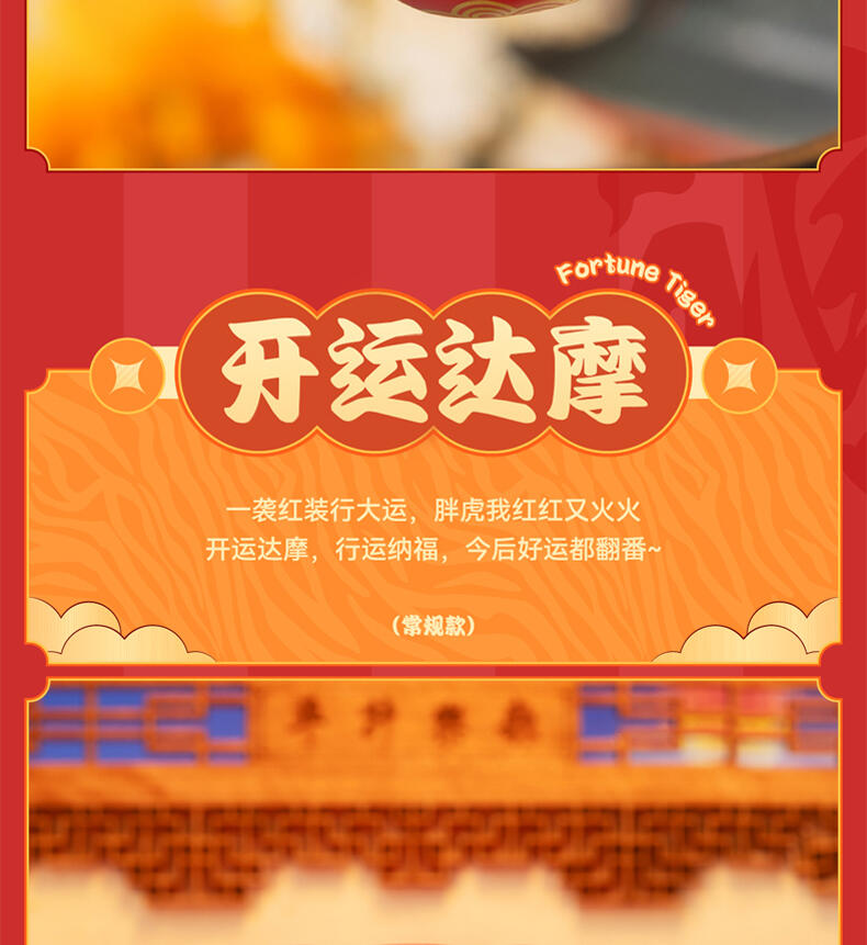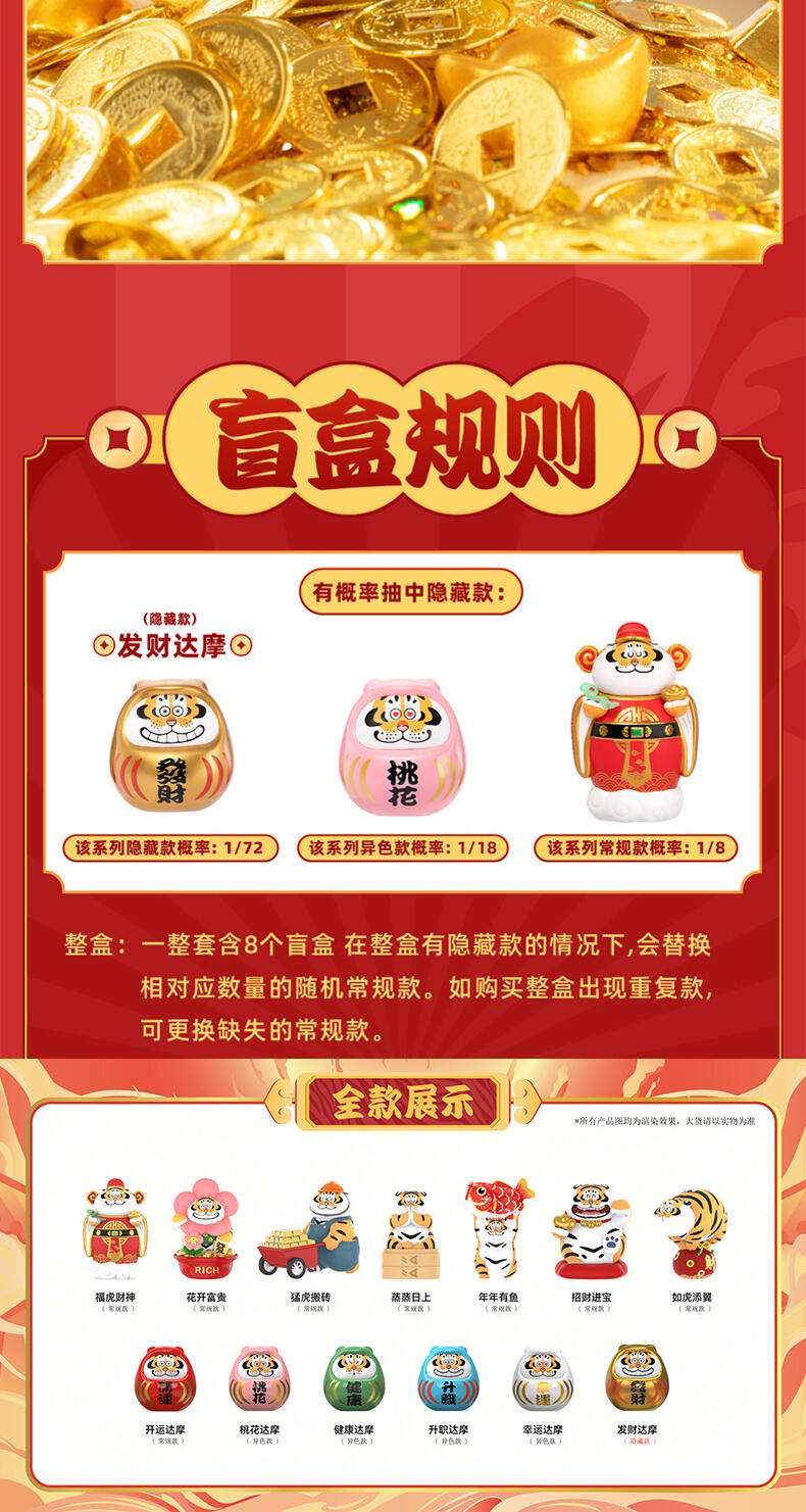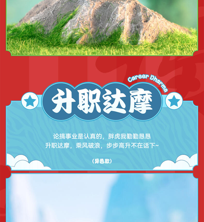 1、正版授权:我不是胖虎正版授权,玩乐主义Funism出品。 2、产品形象:圆滚滚的胖虎换上喜庆招财装扮,多变的表情洋溢喜庆,传递好运,带来财气。 3、工艺材质:产品本体采用搪胶材质,搭配PVC配件,整体更轻便,环保无毒;表面光滑耐磨耐摔,触感细腻,色彩还原。 4、产品优势:1) 不同颜色的达摩隐藏款形象,分别代表不同领域的好运寓意,吸引消费者收集; 2) 产品自带好运寓意,符合当下求好运、玄学的消费心理。 5、功能属性: 1)可当桌搭摆件,增添好运招财的生活氛围; 2)带有招财送福的好运寓意,可作为好运礼物赠送亲友。