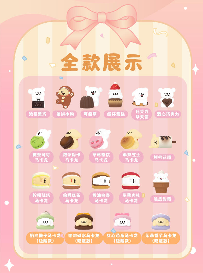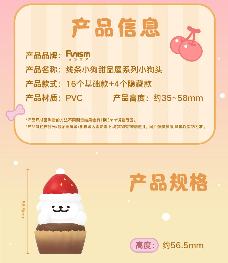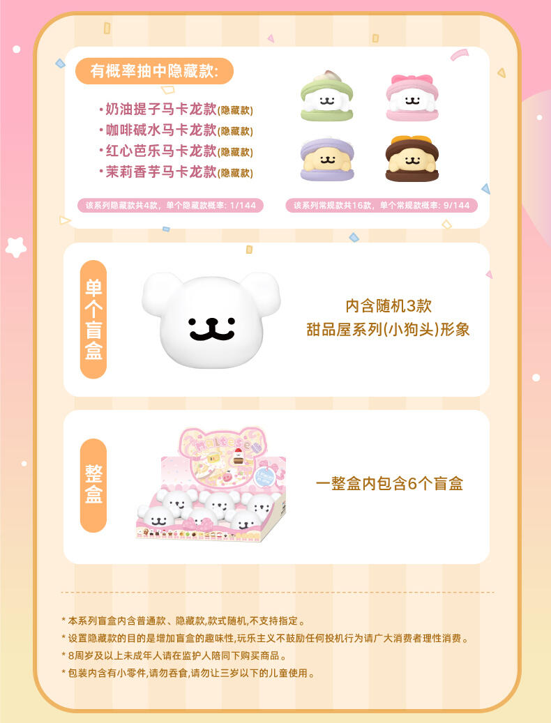 款式概率:常规款共16款,每款概率9:144,约6.25%;隐藏款共4款,每款概率1/144,约0.69% 隐藏款说明:此盲盒产品隐藏款出现的概率,是基于全部生产数量定制的,生产配比为4:144,即每生产144个产品,其中就有4个是隐藏款。" 1、正版授权:线条小狗玩乐主义Funism出品。 2、人气IP:现象级热门IP《线条小狗》,高人气破圈萌宠形象。 3、产品形象:马尔济斯与金毛狗狗,甜品小屋主题,可爱治愈。 4、产品包装:可爱新颖的狗头造型,可展陈/趣味二创,可玩性高。 5、工艺材质:PVC材质,环保涂装,表面光滑耐磨,触感细腻。 6、收藏玩法:概率可得4款隐藏款,款式稀有,收藏性高。 7、功能属性: 1)可爱小巧摆件,可当桌面装饰,提升生活趣味性。 2)带有美好治愈寓意,亲友/搭子送礼首选。"
