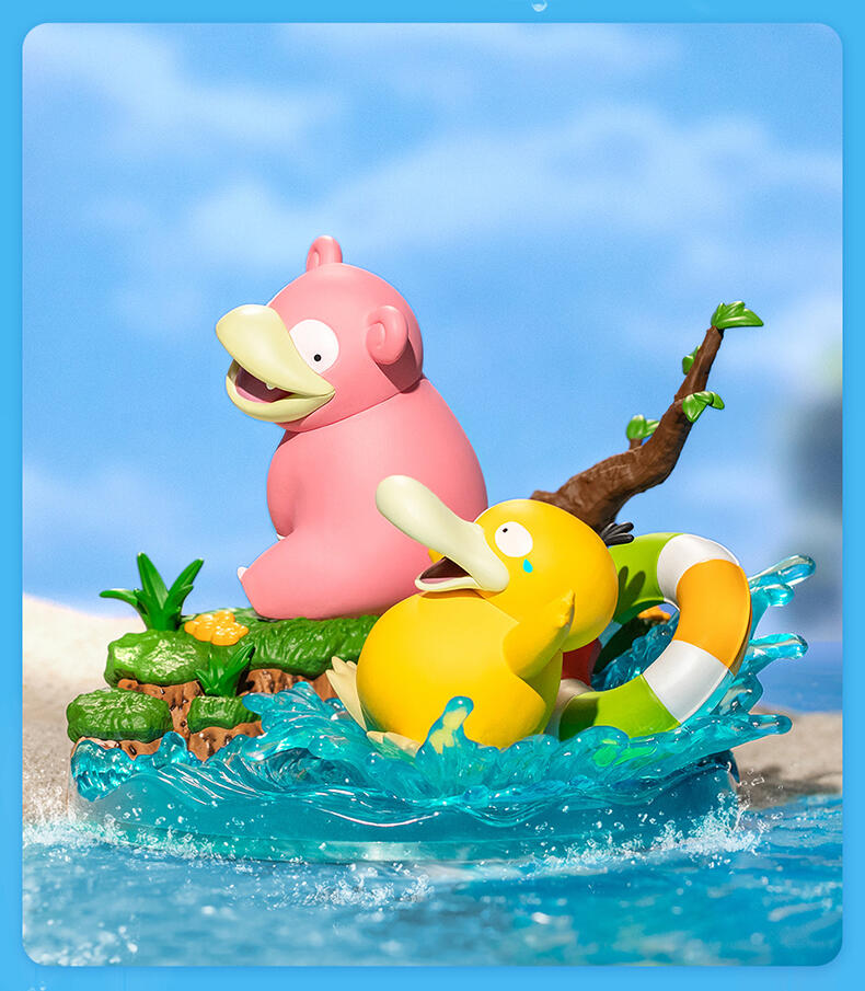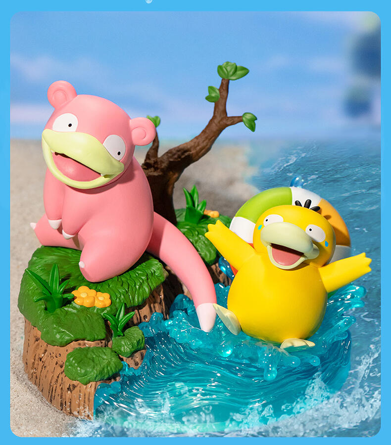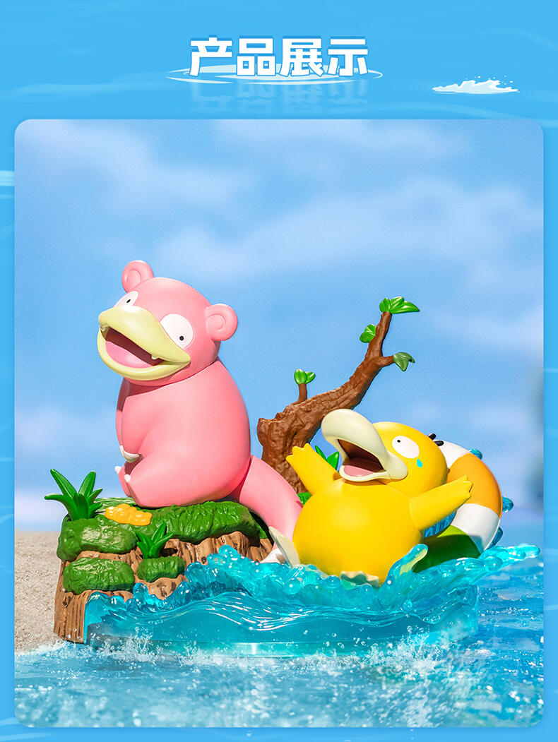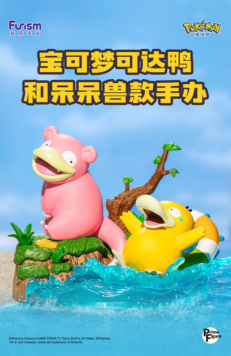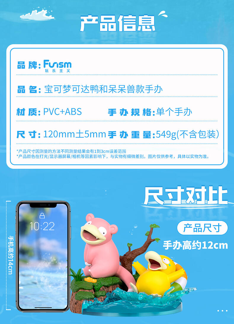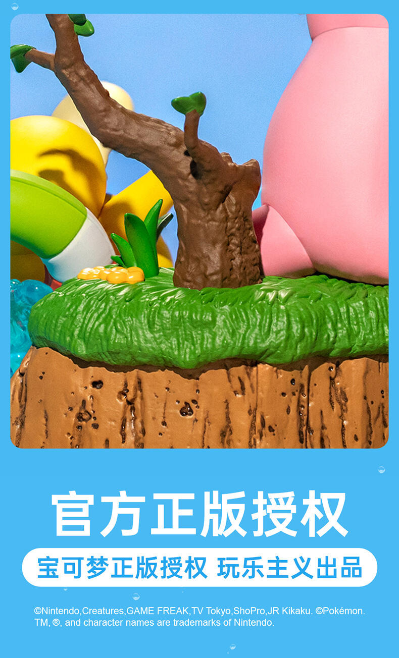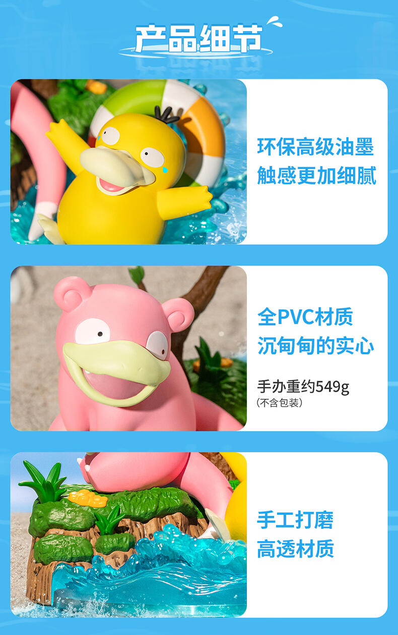 2、高还原度:可爱又高人气的可达鸭、呆呆兽,高度还原宝可梦的经典形象,以可达鸭&呆呆兽两只宝可梦在水塘中嬉戏为主题,展示落水的可达鸭与惊讶的呆呆兽。通过承托可达鸭的游泳圈和溅起的水花构成了层次丰富的瞬间场景;草地与水面的高度差,配合花草和树枝的点缀,增加了手办地台的丰富度。