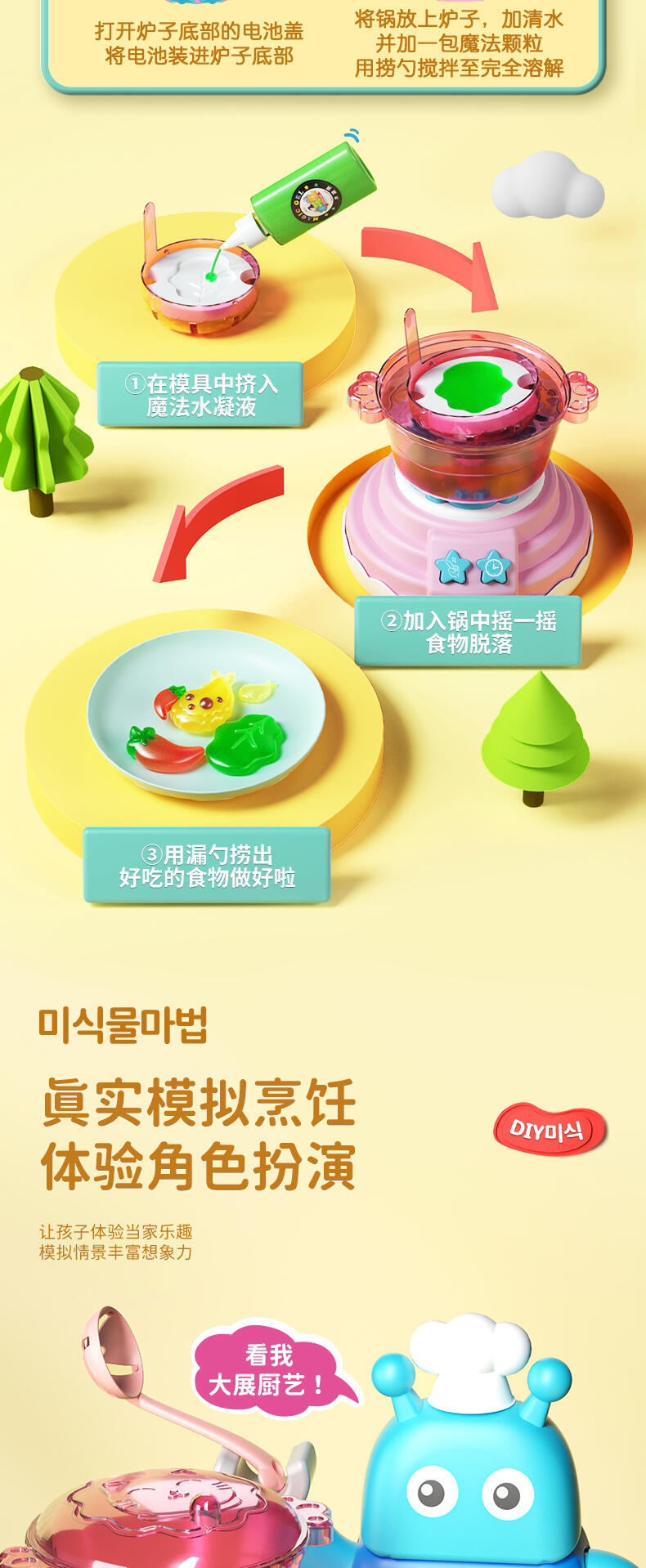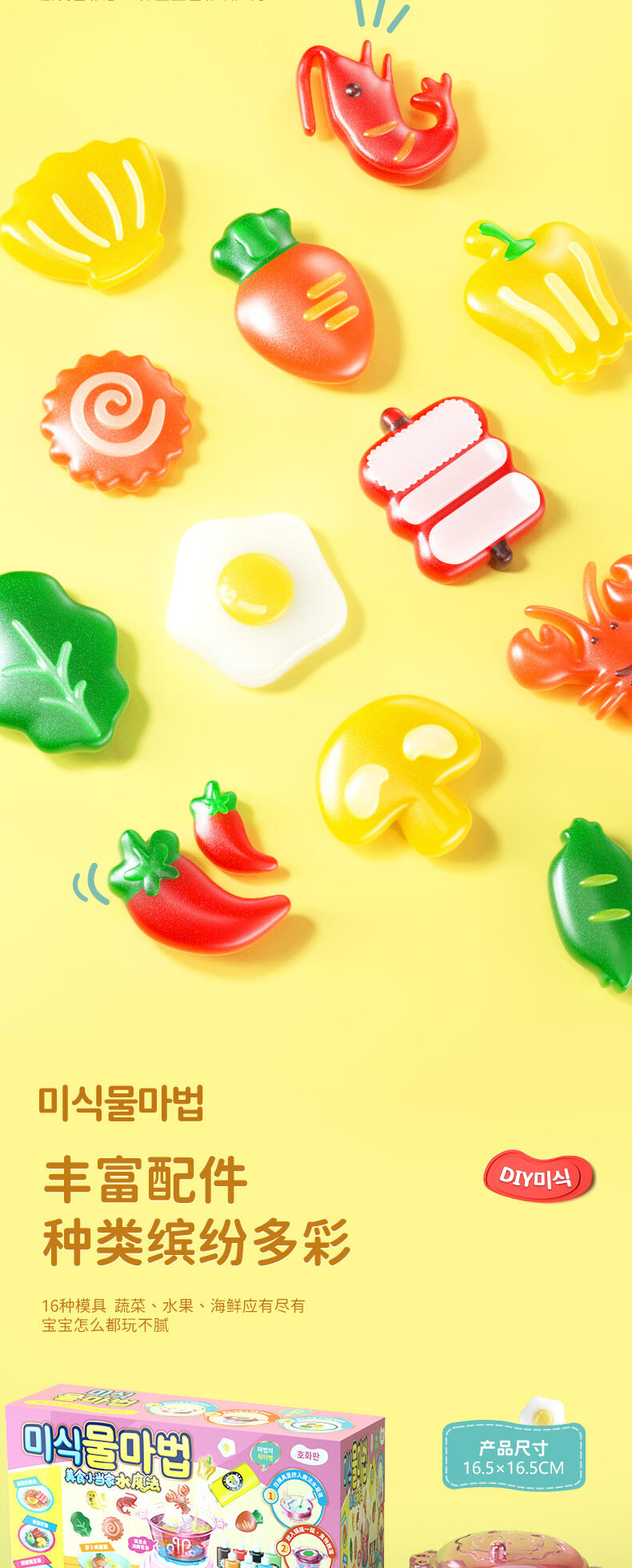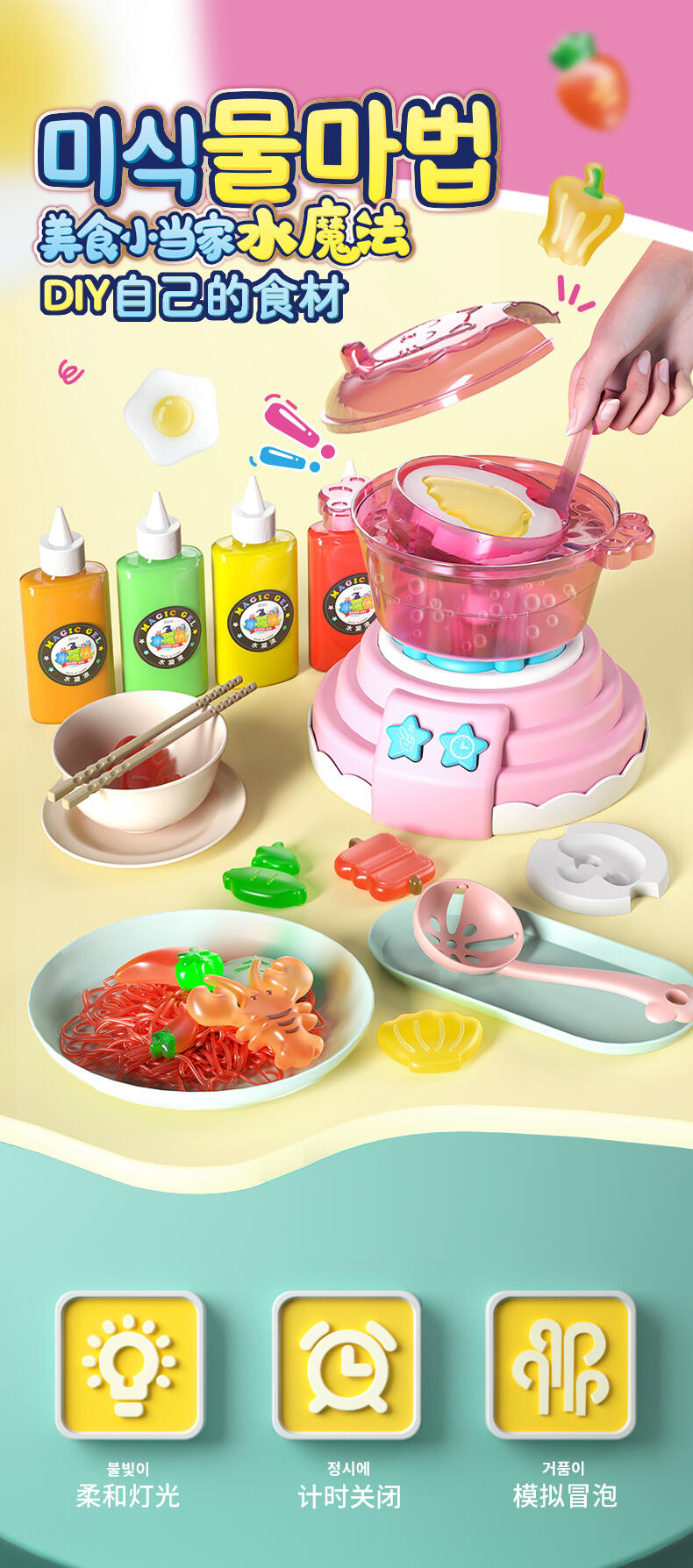 所有水魔法食材由自己动手DIY成型,培养孩子的专注力,创造力和动手能力。安全无毒。通过模具成型,轻松做成各类食物。100%还原“煮”东西的过程:打开炉子开关,锅里的水开始“沸腾”