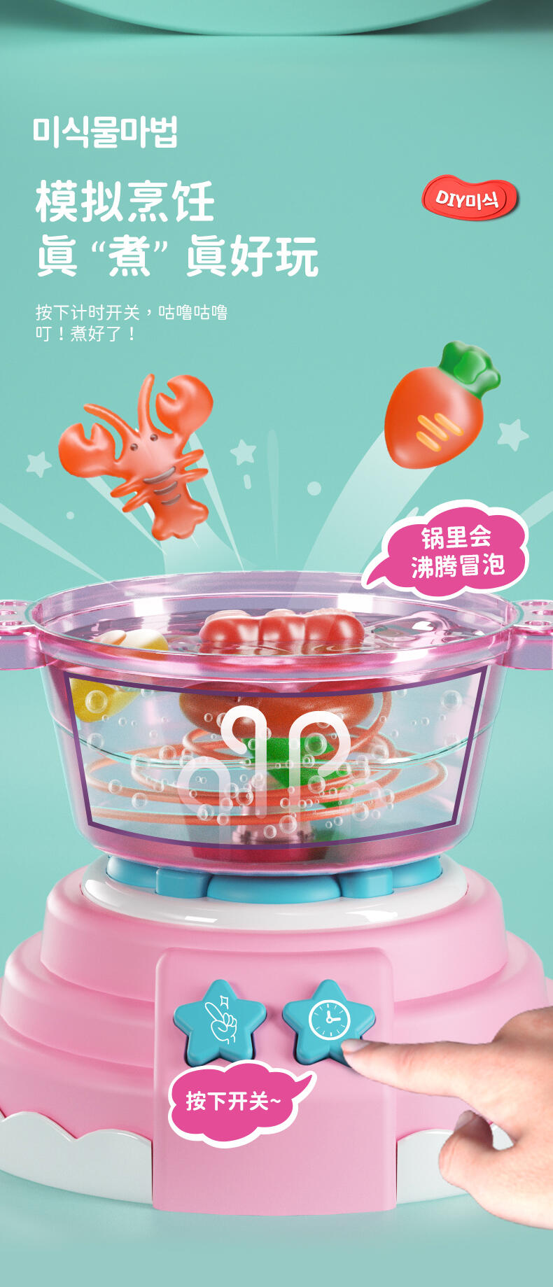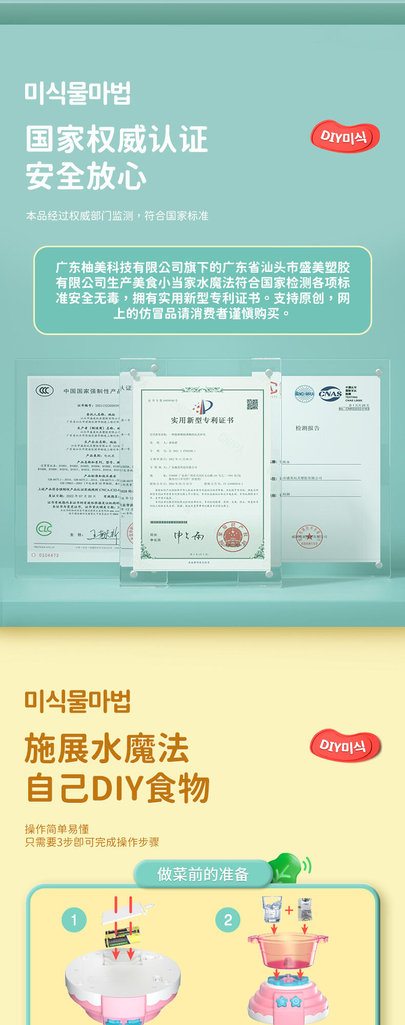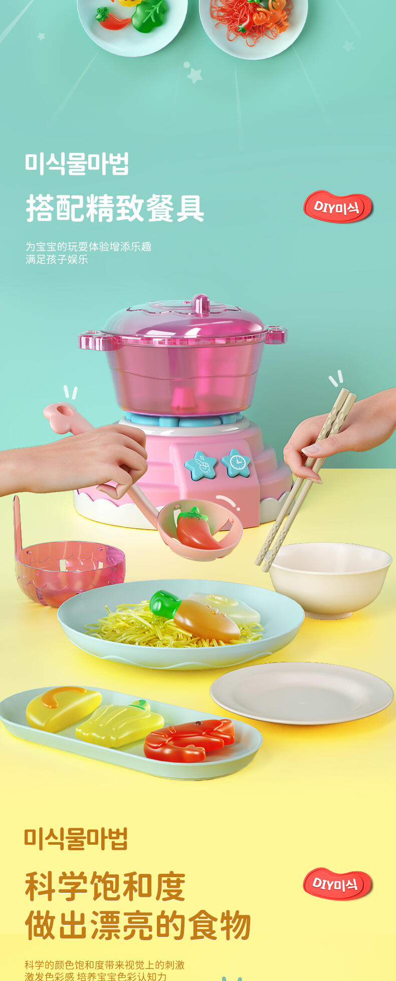 所有水魔法食材由自己动手DIY成型,培养孩子的专注力,创造力和动手能力。安全无毒。通过模具成型,轻松做成各类食物。100%还原“煮”东西的过程:打开炉子开关,锅里的水开始“沸腾”