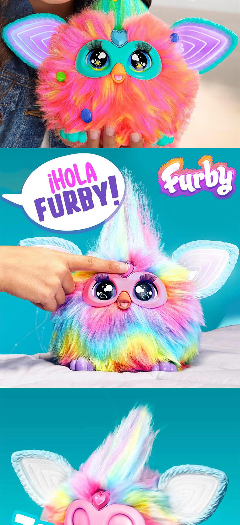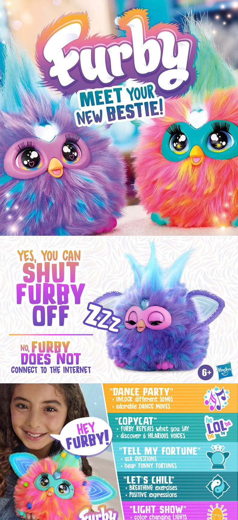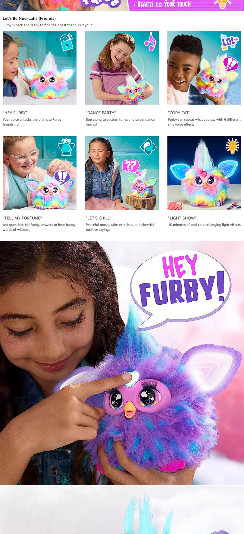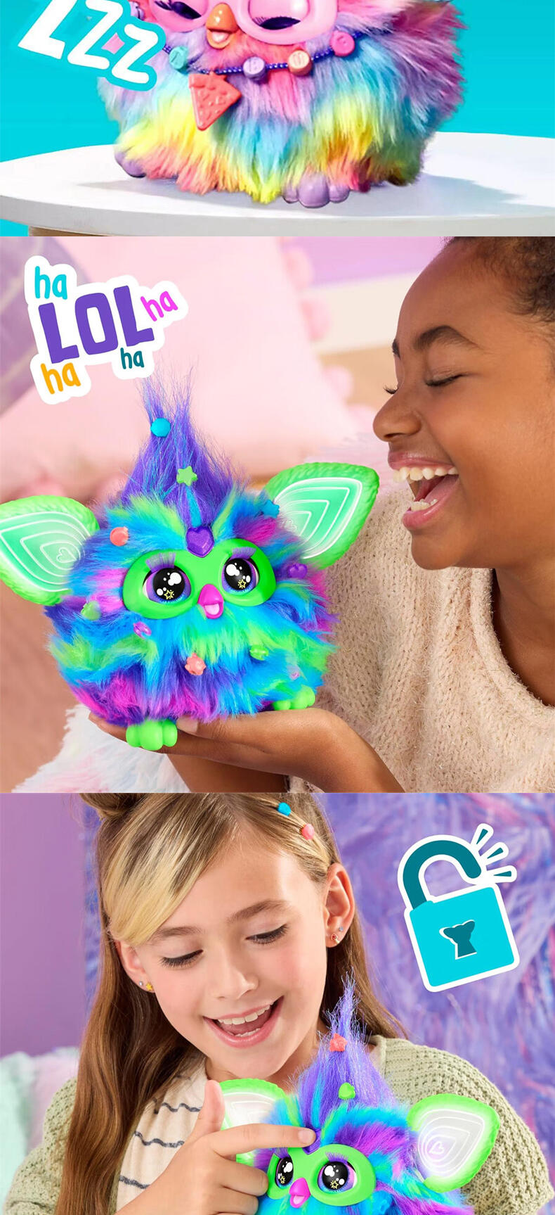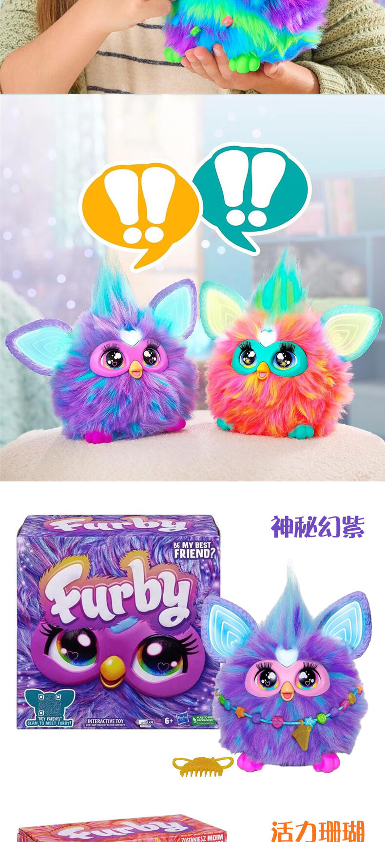 屏幕面前的各位,快来认识菲比吧!这款长相奇特的小生物其实是一款可爱的互动玩具,带有 5 种声控模式,可以说出 600 多种短语,还会讲笑话、唱歌,更有其他惊喜待你发现。使用这 5 种指示告诉菲比你的目的:Dance Party(跳舞)、Copy Cat(模仿)、Tell My Fortune(算命)、 Let's Chill(一起玩)和 Lightshow(灯光秀)。拥抱、拍拍脑袋或喂食模拟的披萨挂件(用你的手指替代也不是不行哦),这些动作也可以让菲比作出响应。与菲比的互动越多,解锁的乐趣就越多!喂食和梳理它们的头发给菲比好好照顾菲比。用串珠来打扮它们,并制作一些孩子也可以佩戴的时尚配件。这款适合 6 岁以上男女生的电子绒毛玩具非常适合送给儿童,也是可以常伴他们身边的趣友。还记得菲比常挂在嘴边的那句话吗? 「Dah-no-lah」(派对时间到!)菲比和所有相关财产均为孩之宝的商标。
